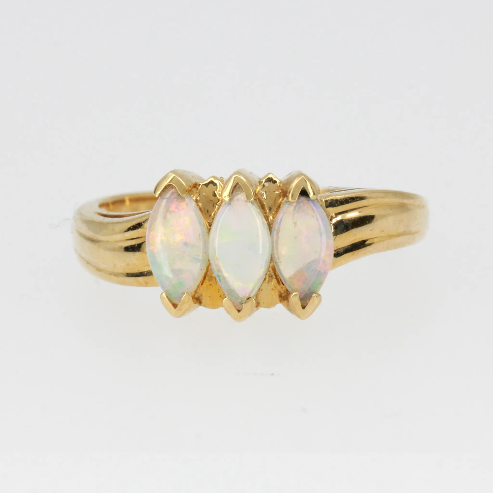 Twisted band trilogy ring design. 3 oval natural white Australian opals. Solid 14ct yellow gold. Featuring red, orange, & green flashes of colour.