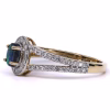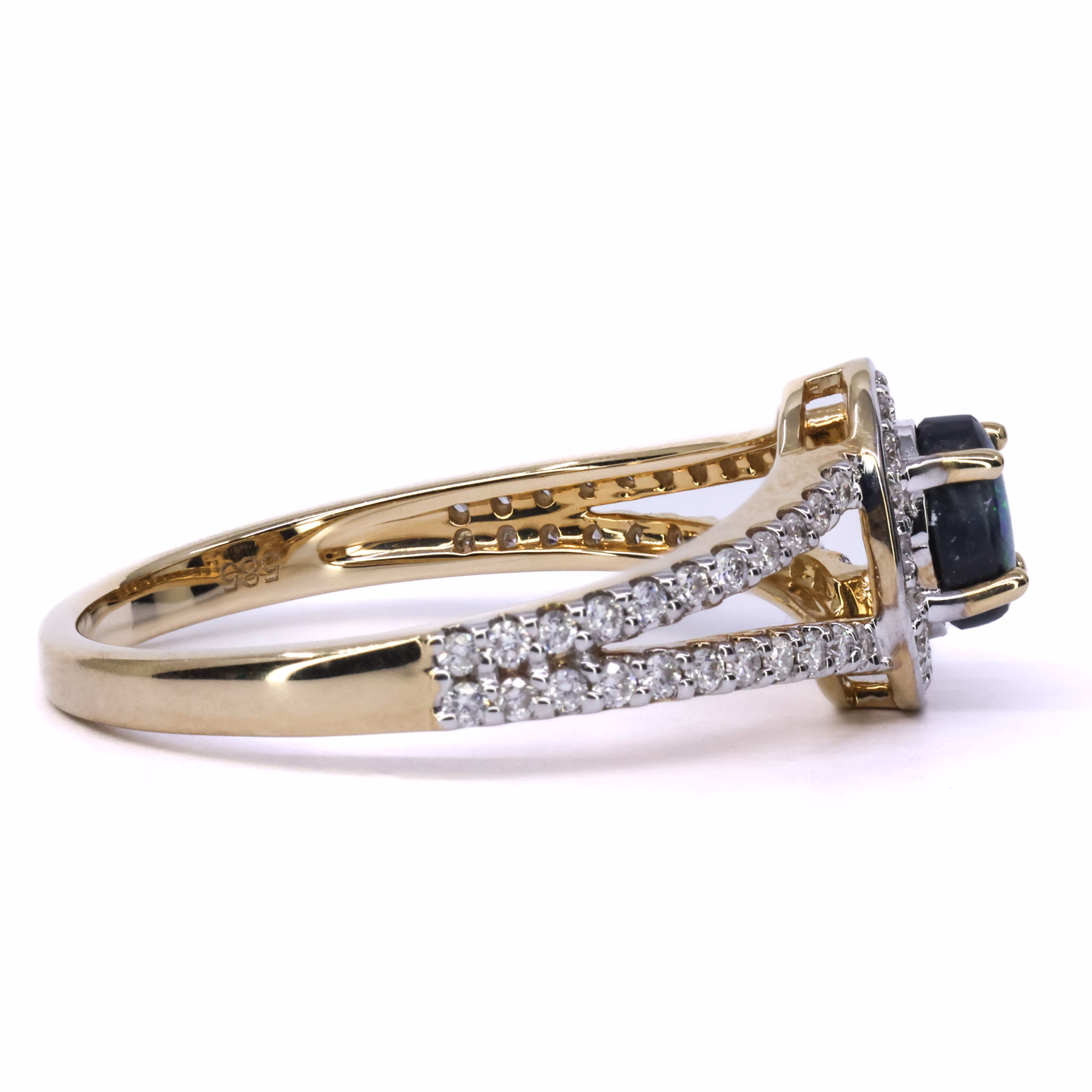 Split band halo ring design. Oval natural black Australian opal set with accenting natural diamonds. Solid 14ct yellow gold. Featuring blue & green flashes of colour, body tone N1 B4.