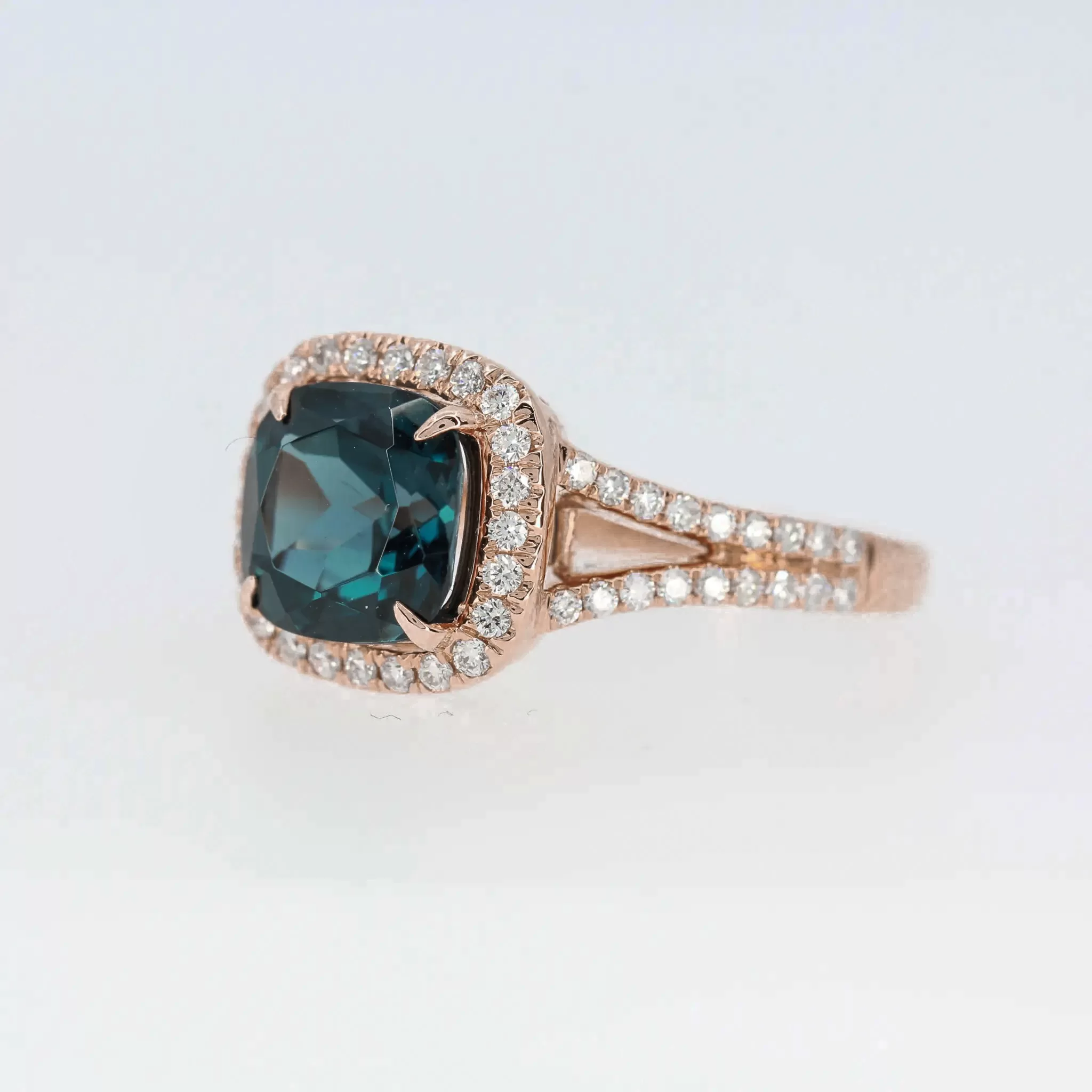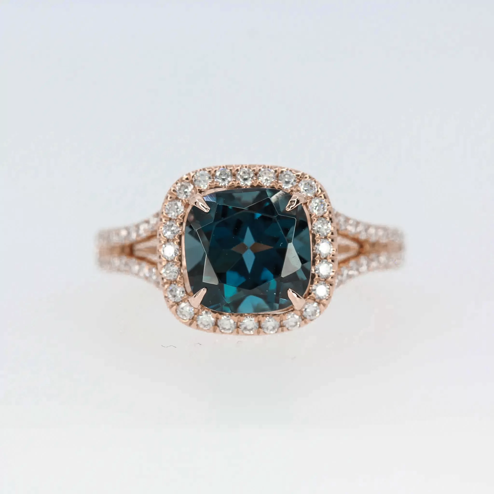 Split band with cushion halo & accents design ring. Square-cushion-cut London blue topaz of natural origin with natural diamonds. Solid 18ct rose gold.