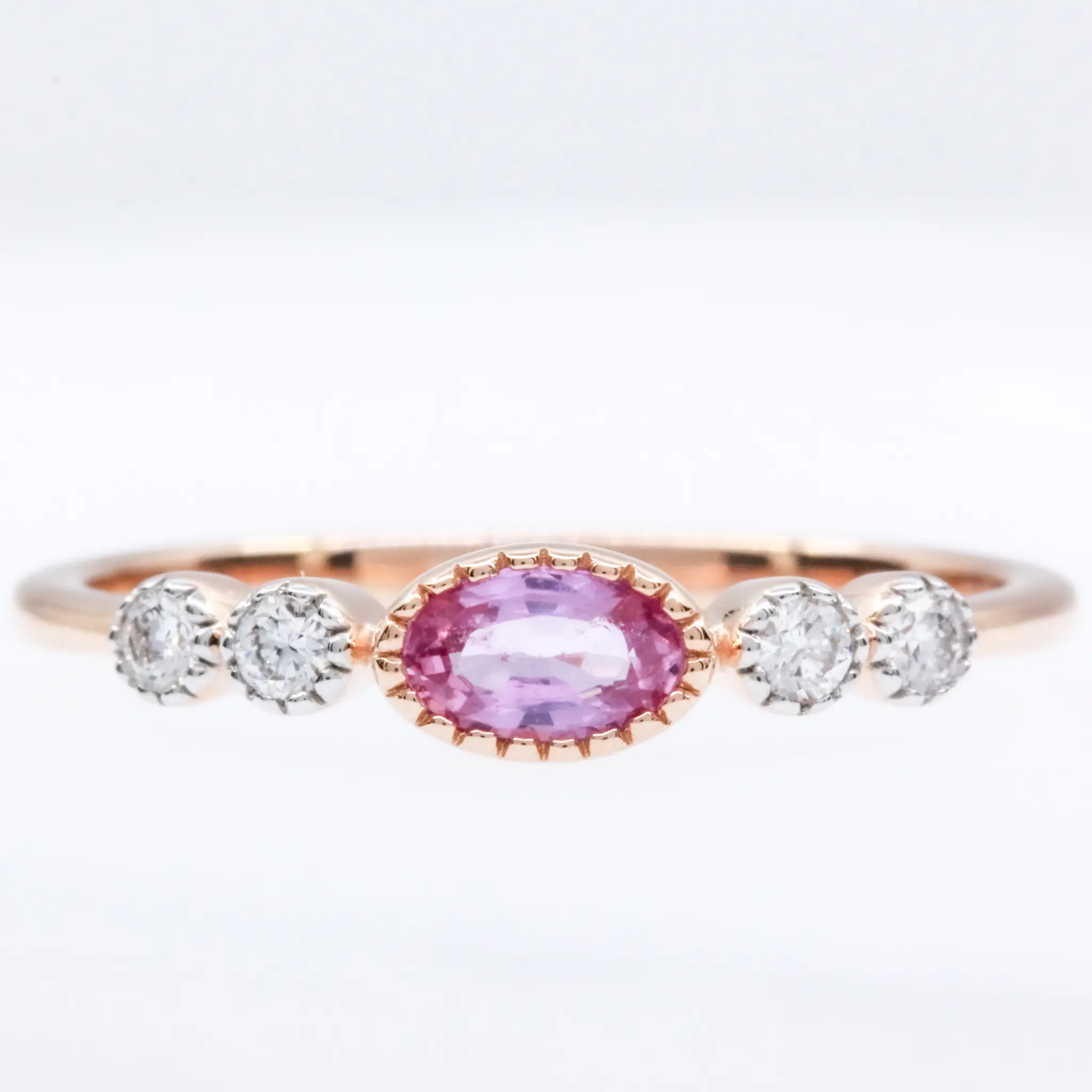 Rounded milgrain bezel design ring. Pink sapphire of natural origin. Oval-Cut. Set into solid 18ct rose gold with natural diamonds.