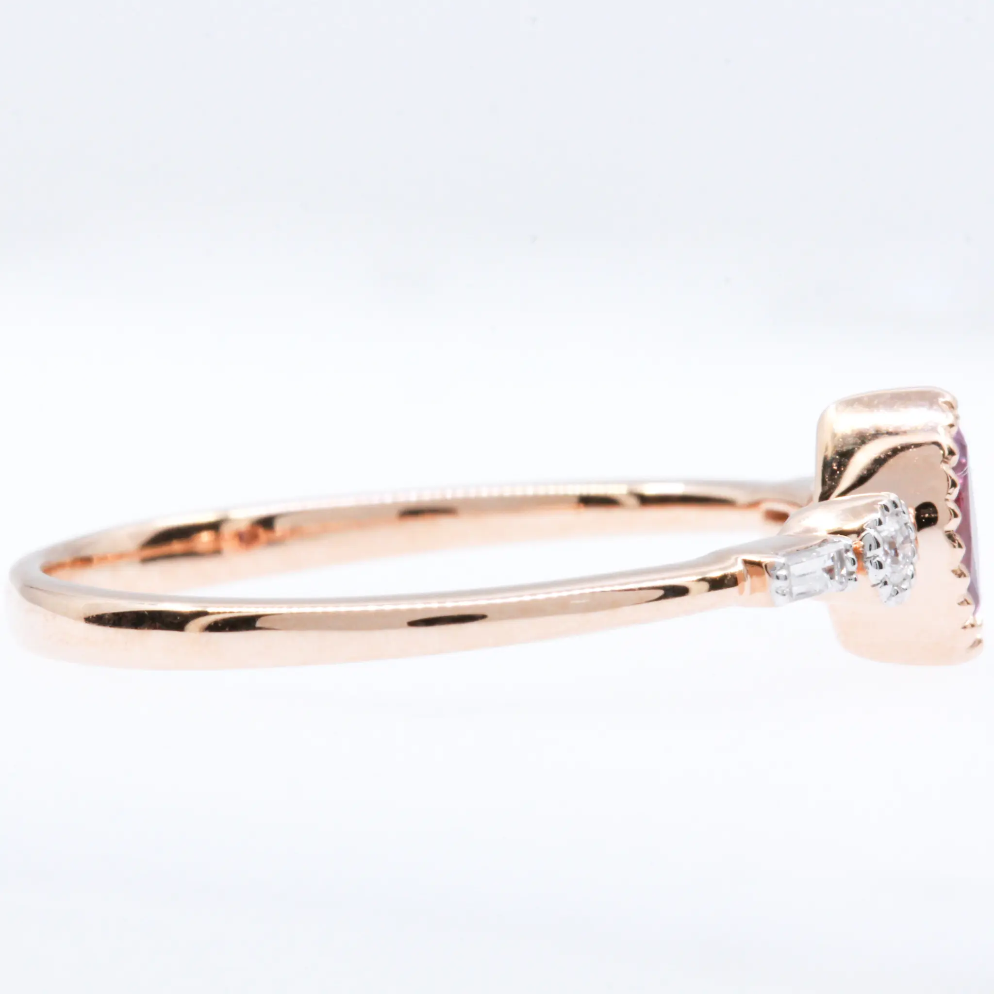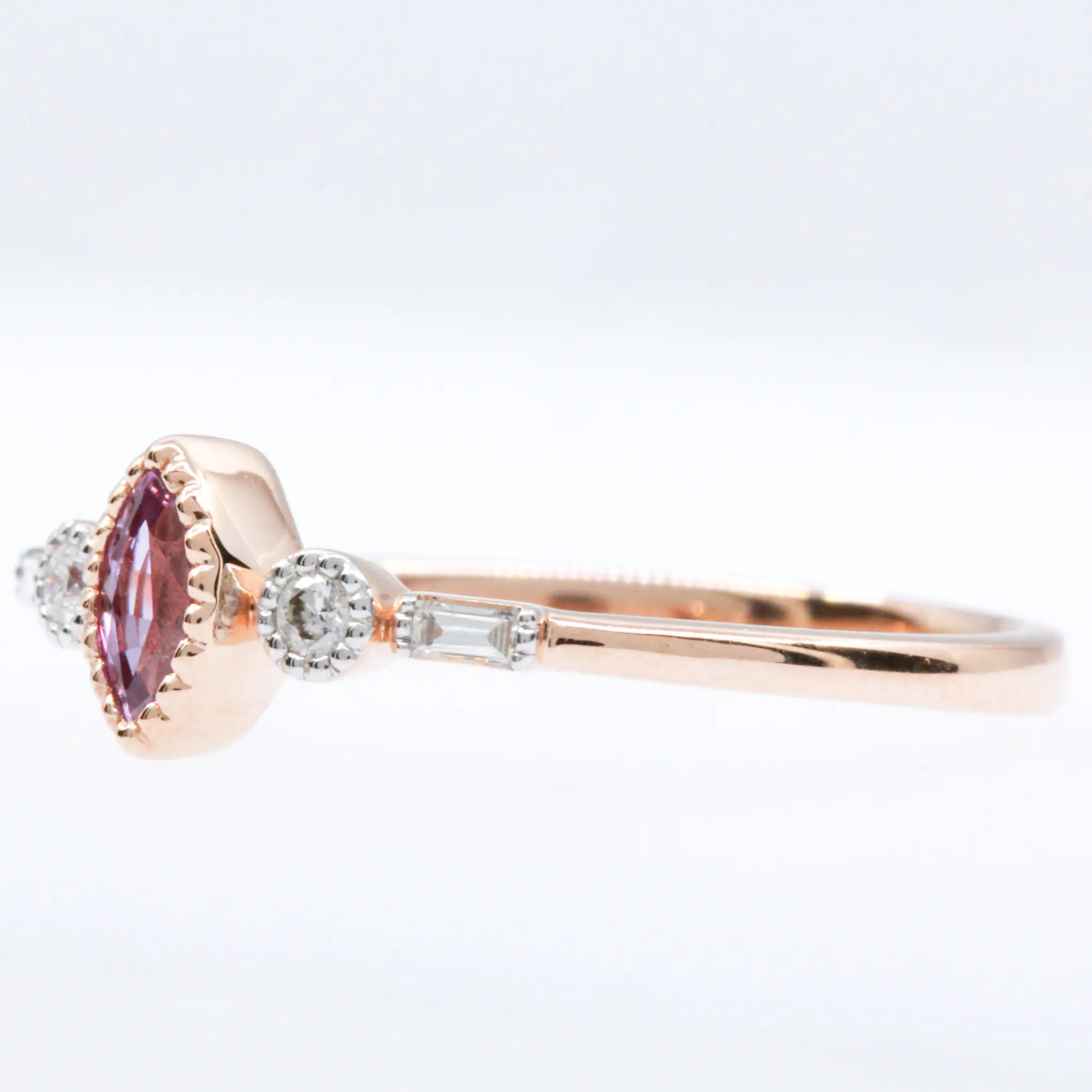 Abstract shape design ring. Pink sapphire of natural origin. Marquise-Cut. Set into solid 18ct rose gold with natural diamonds.