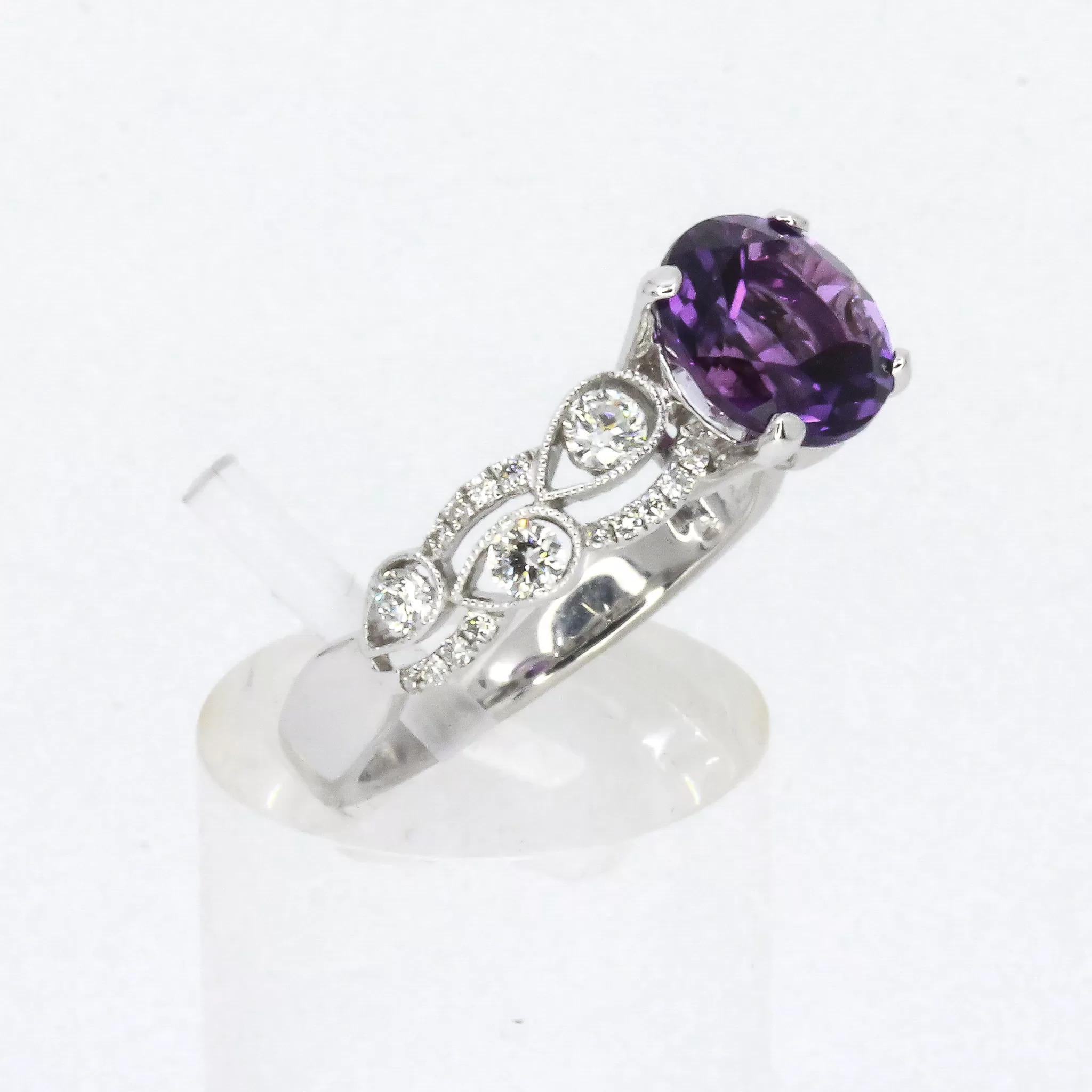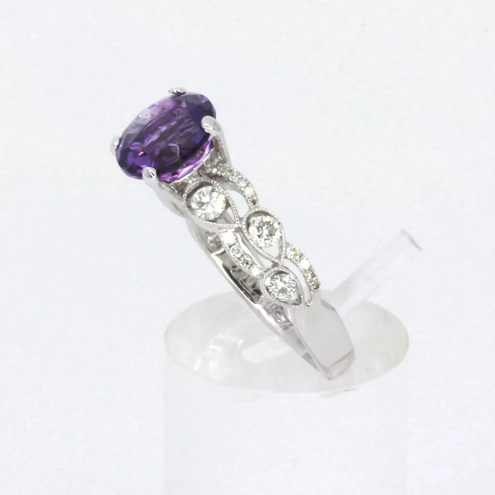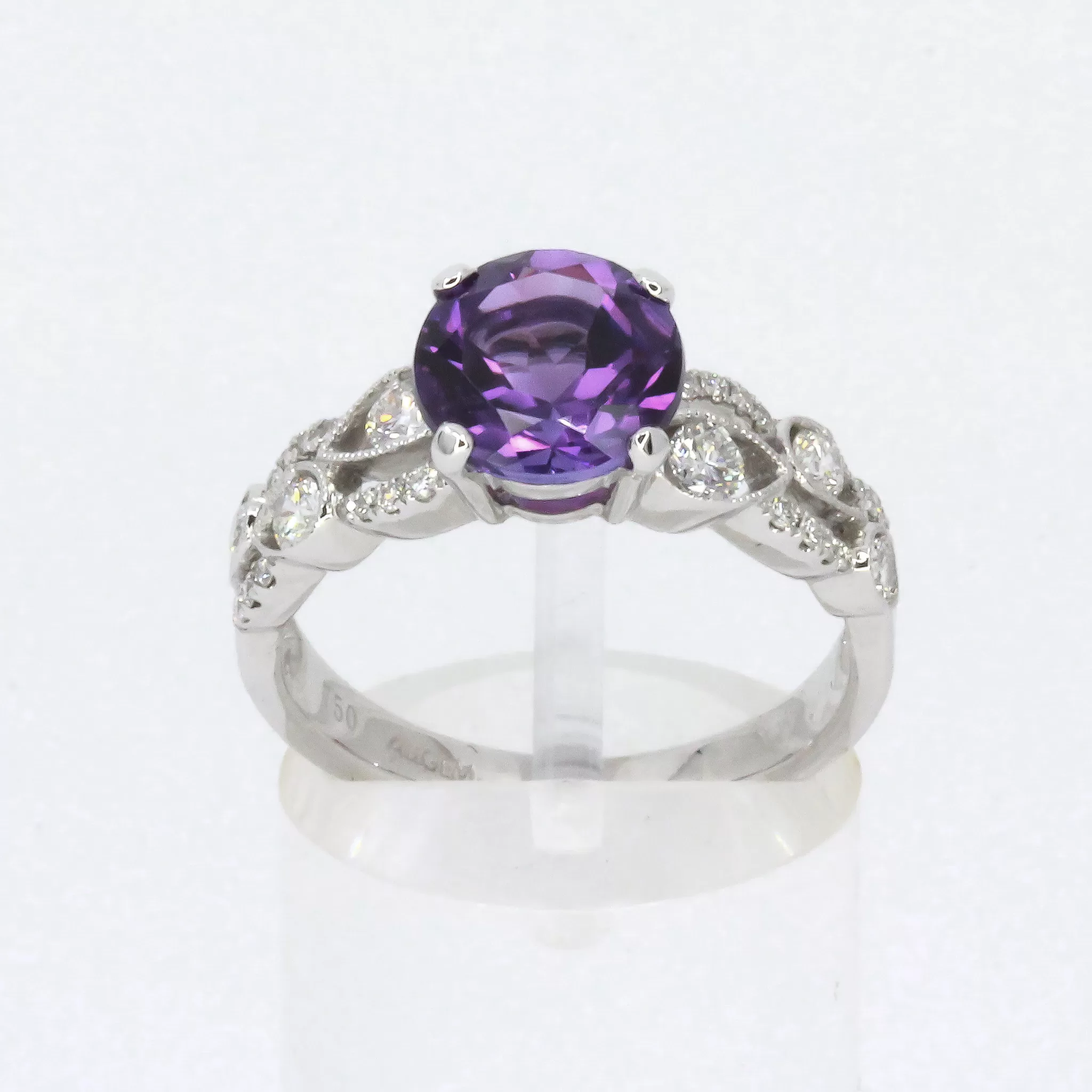 Antique filigree accents on band design ring. Round-cut amethyst of natural origin with natural diamonds. Solid 18ct white gold.
