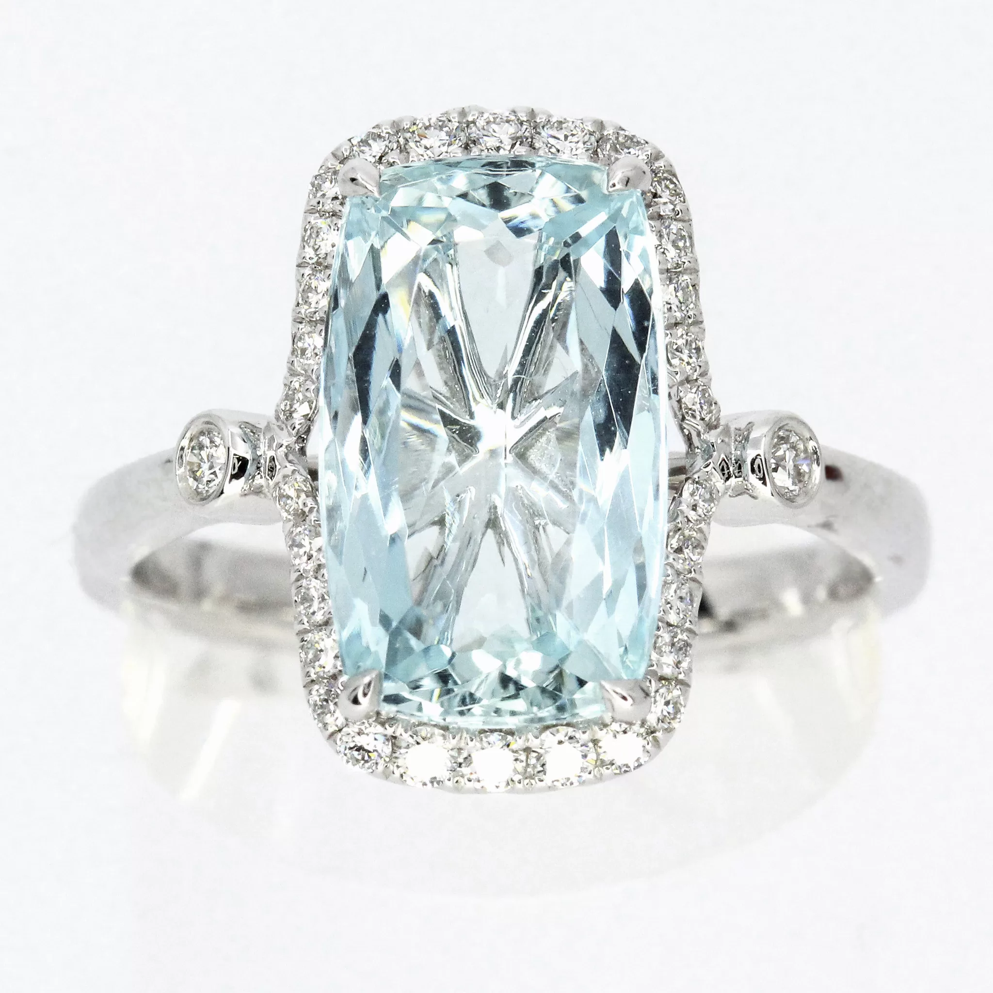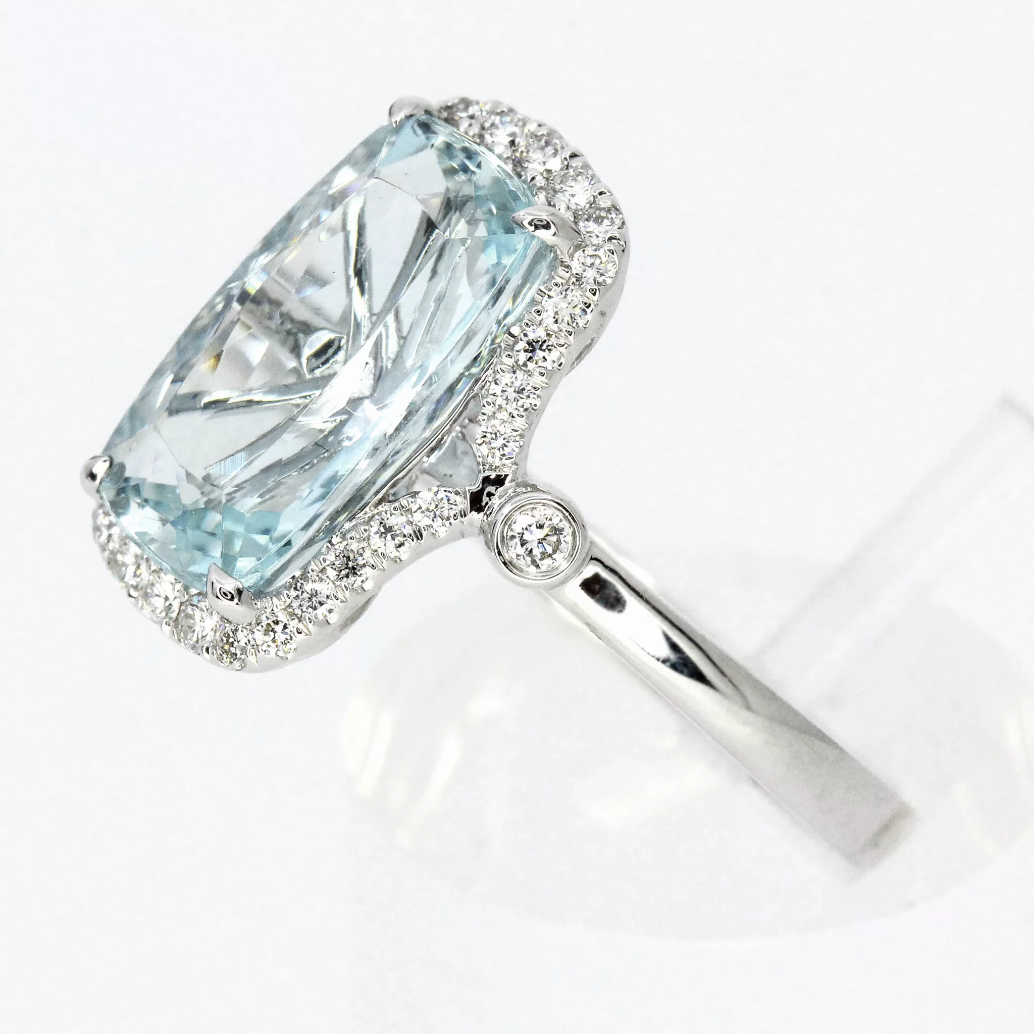 Large rectangular halo design ring. Rectangular-cushion-cut aquamarine of natural origin with natural diamonds. Solid 18ct white gold.