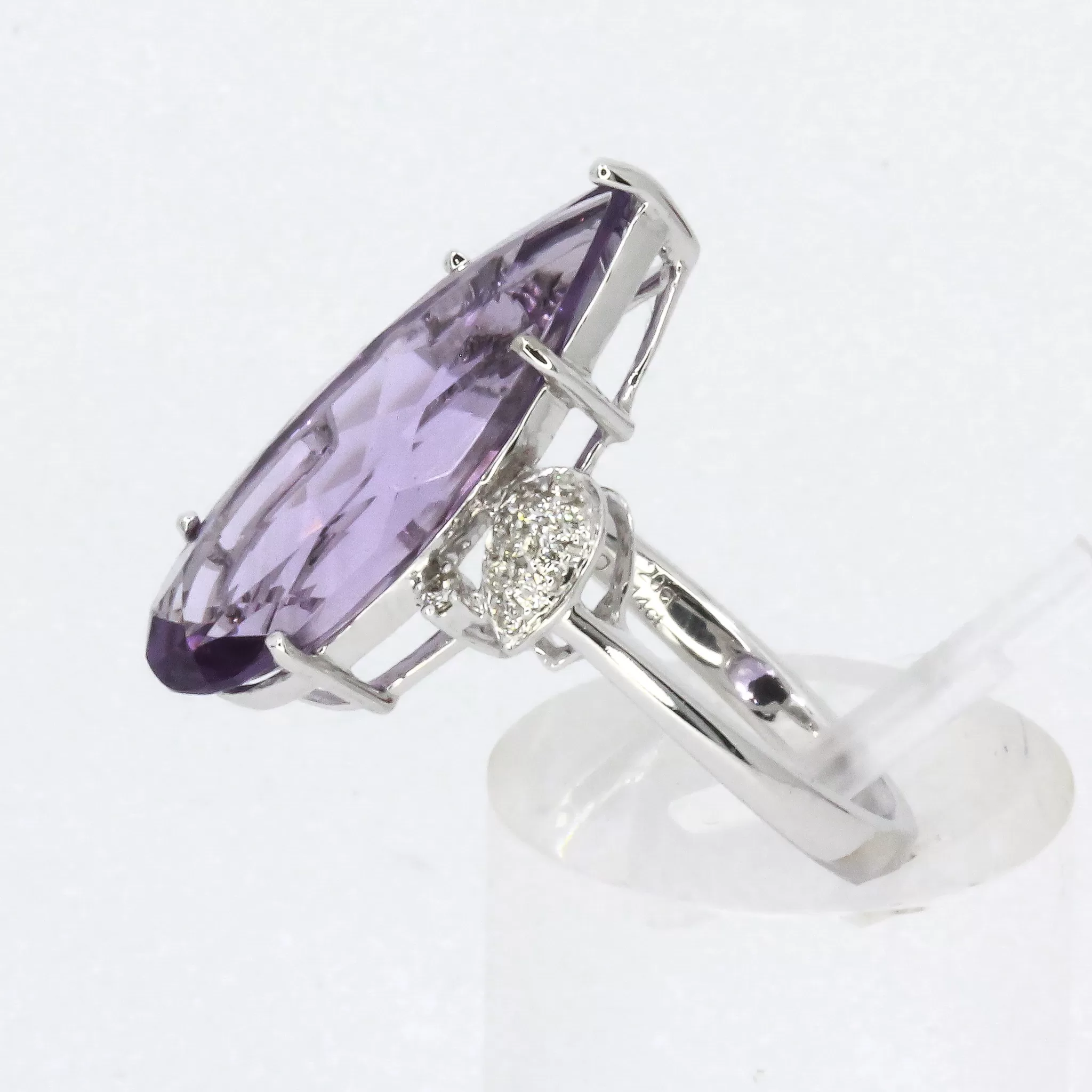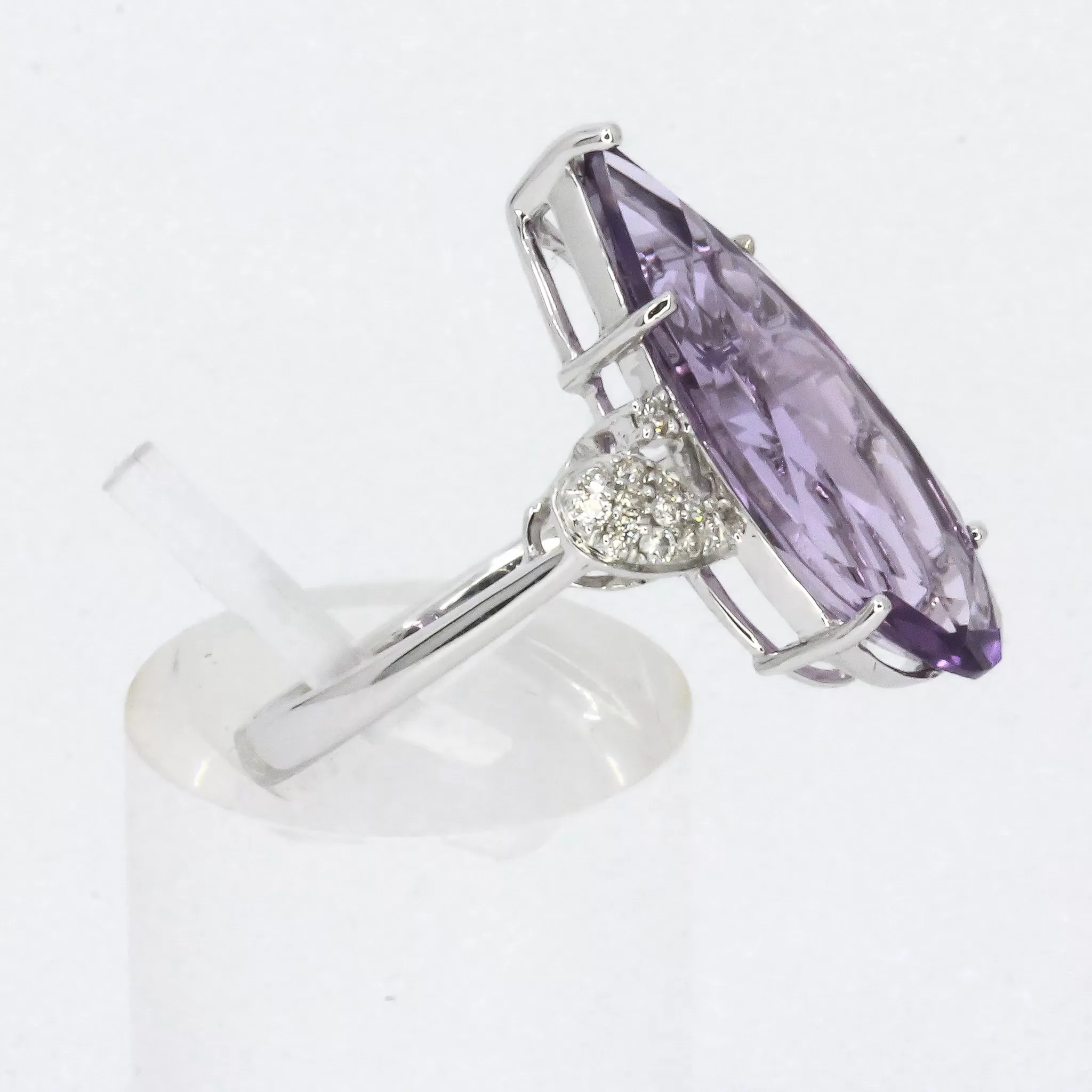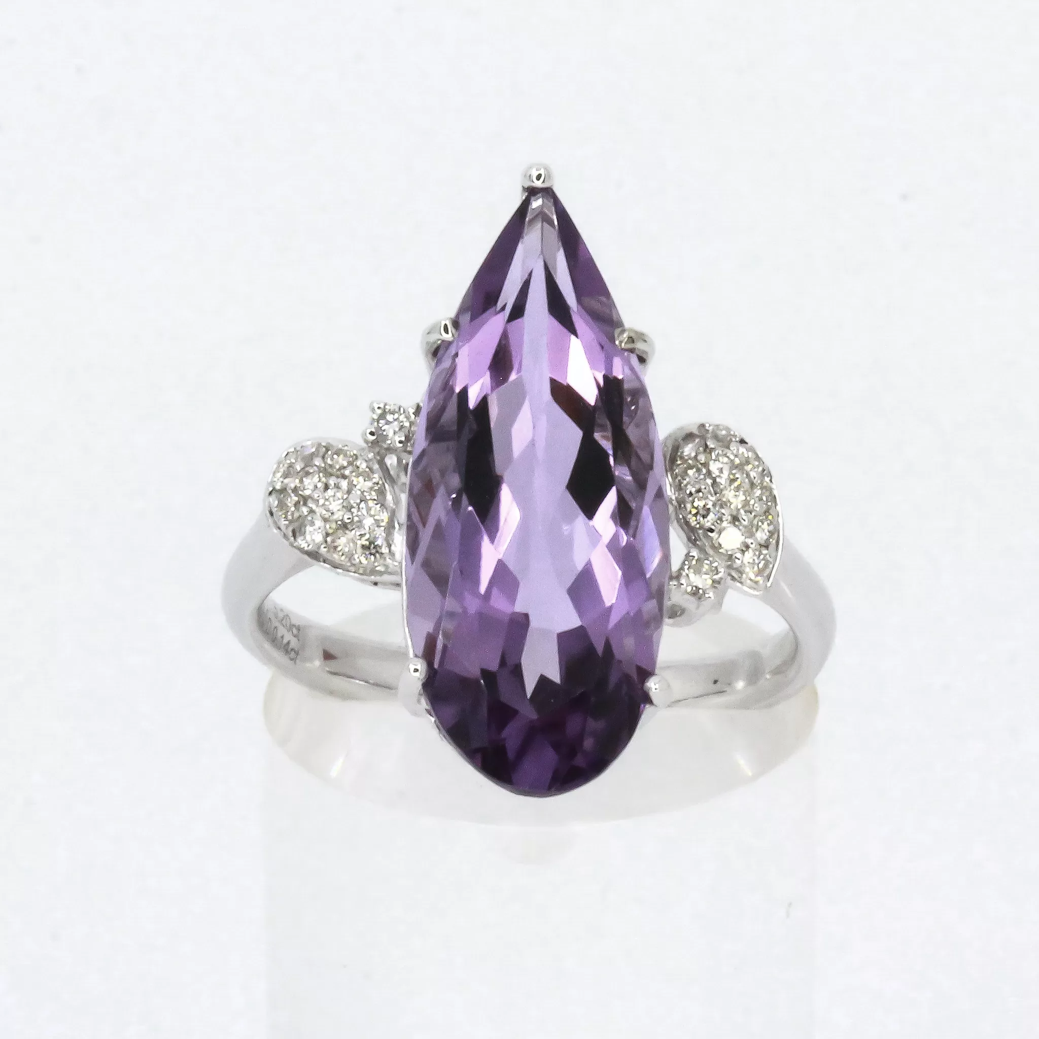 Large tear drop with accents design ring. Pear-cut amethyst of natural origin with natural diamonds. Solid 18ct white gold.