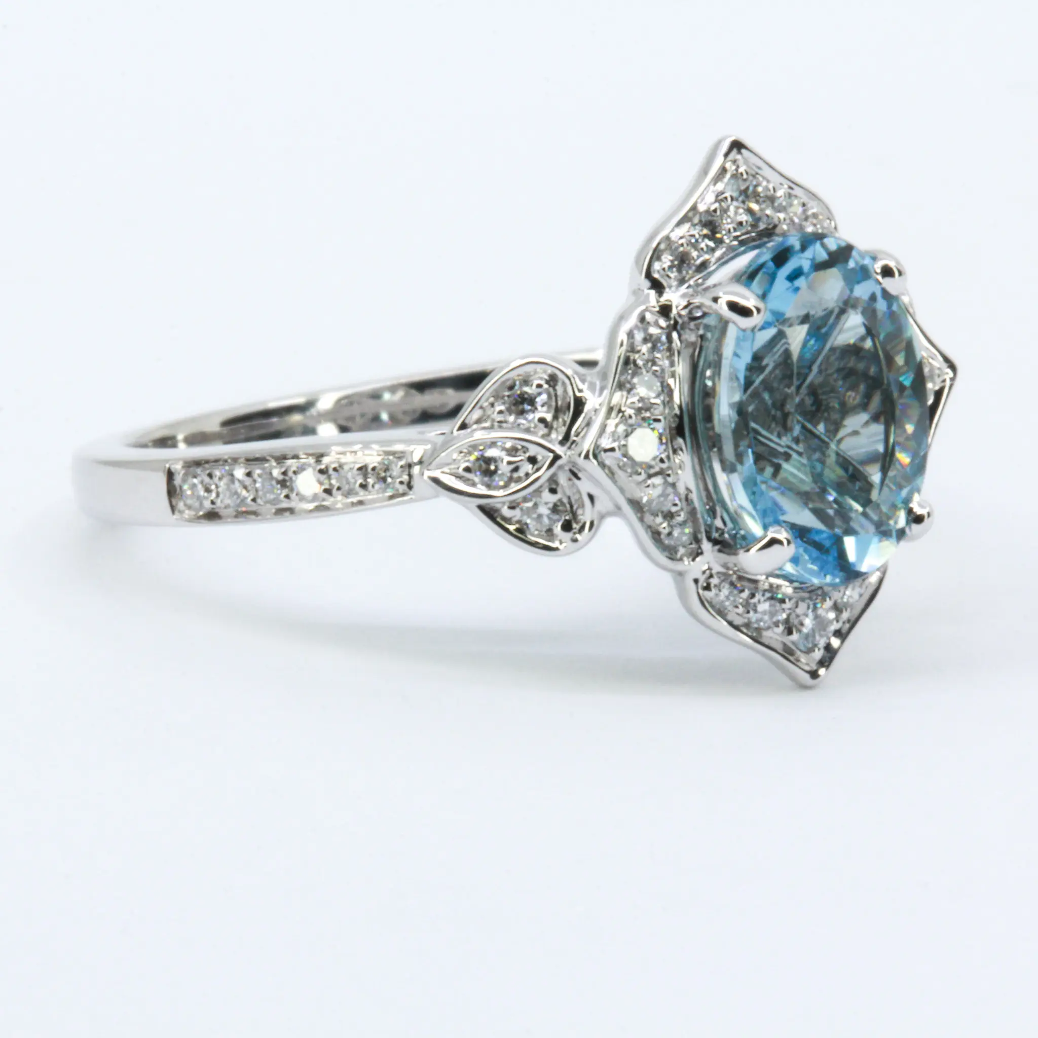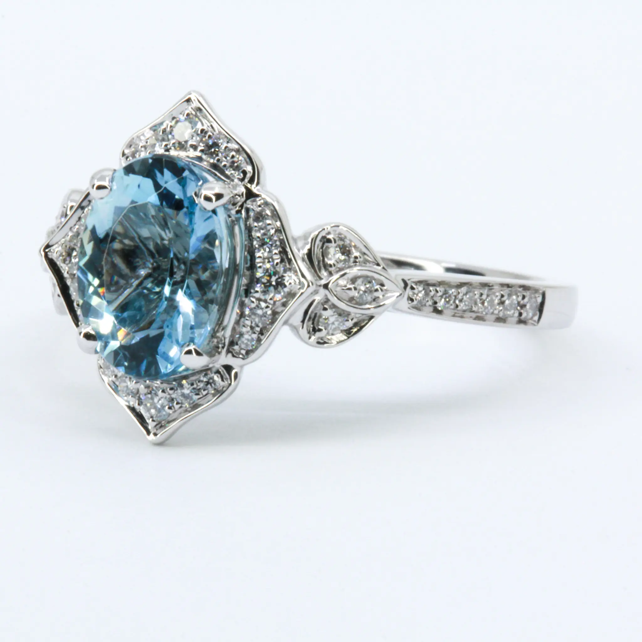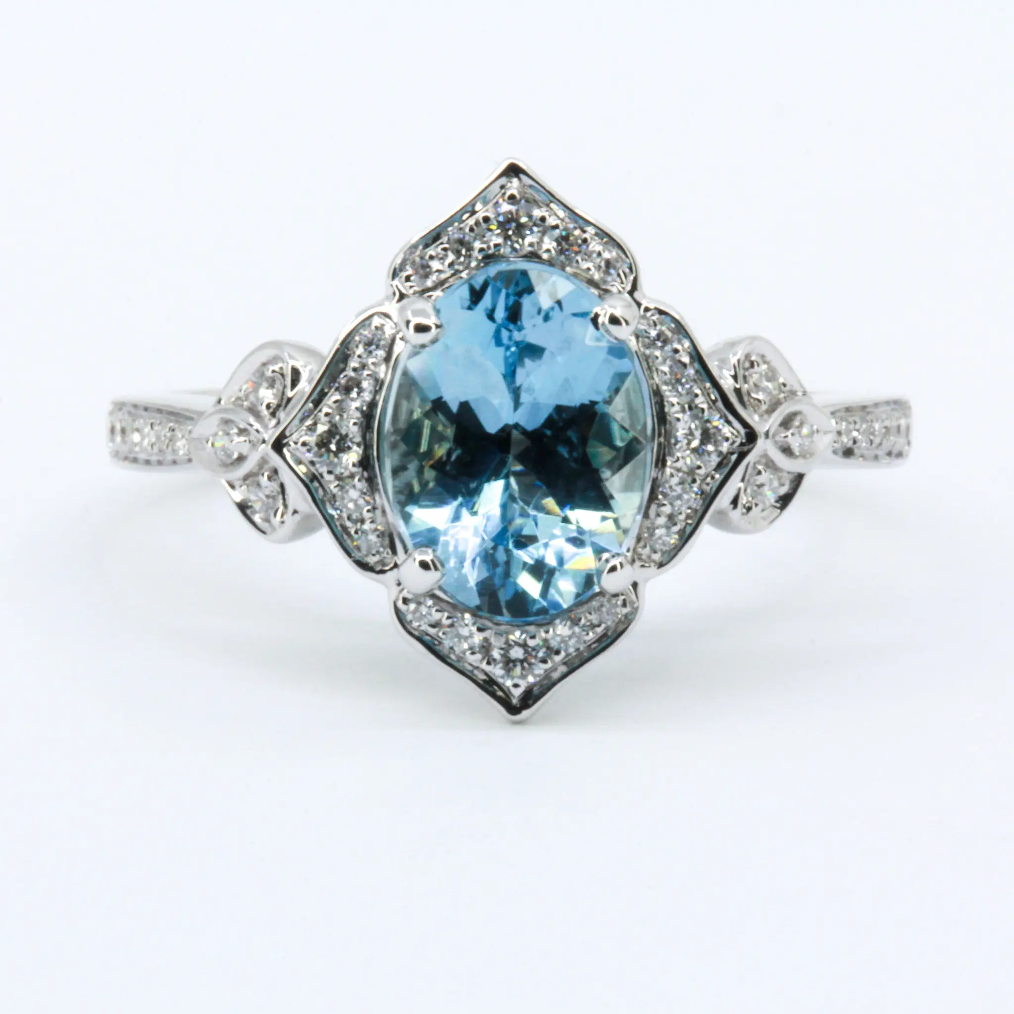 Antique halo with accent son shoulders design ring. Oval-cut aquamarine of natural origin with natural diamonds. Solid 18ct white gold.
