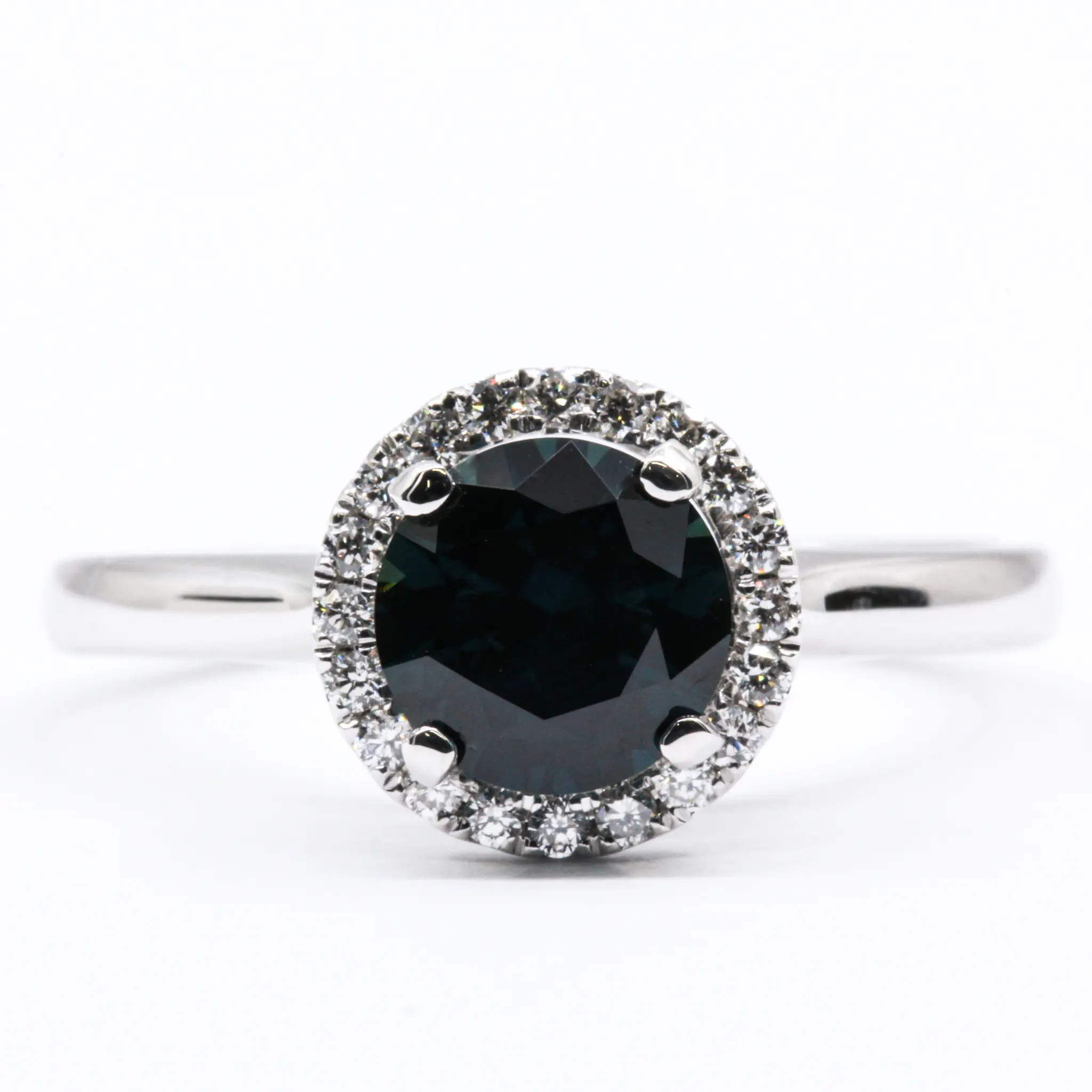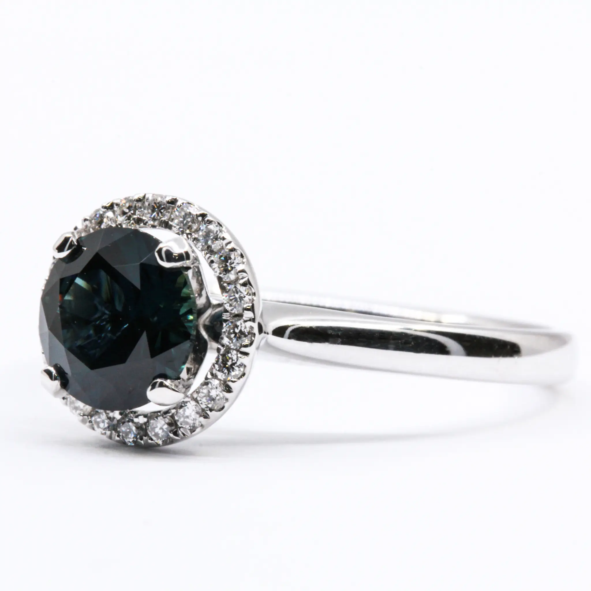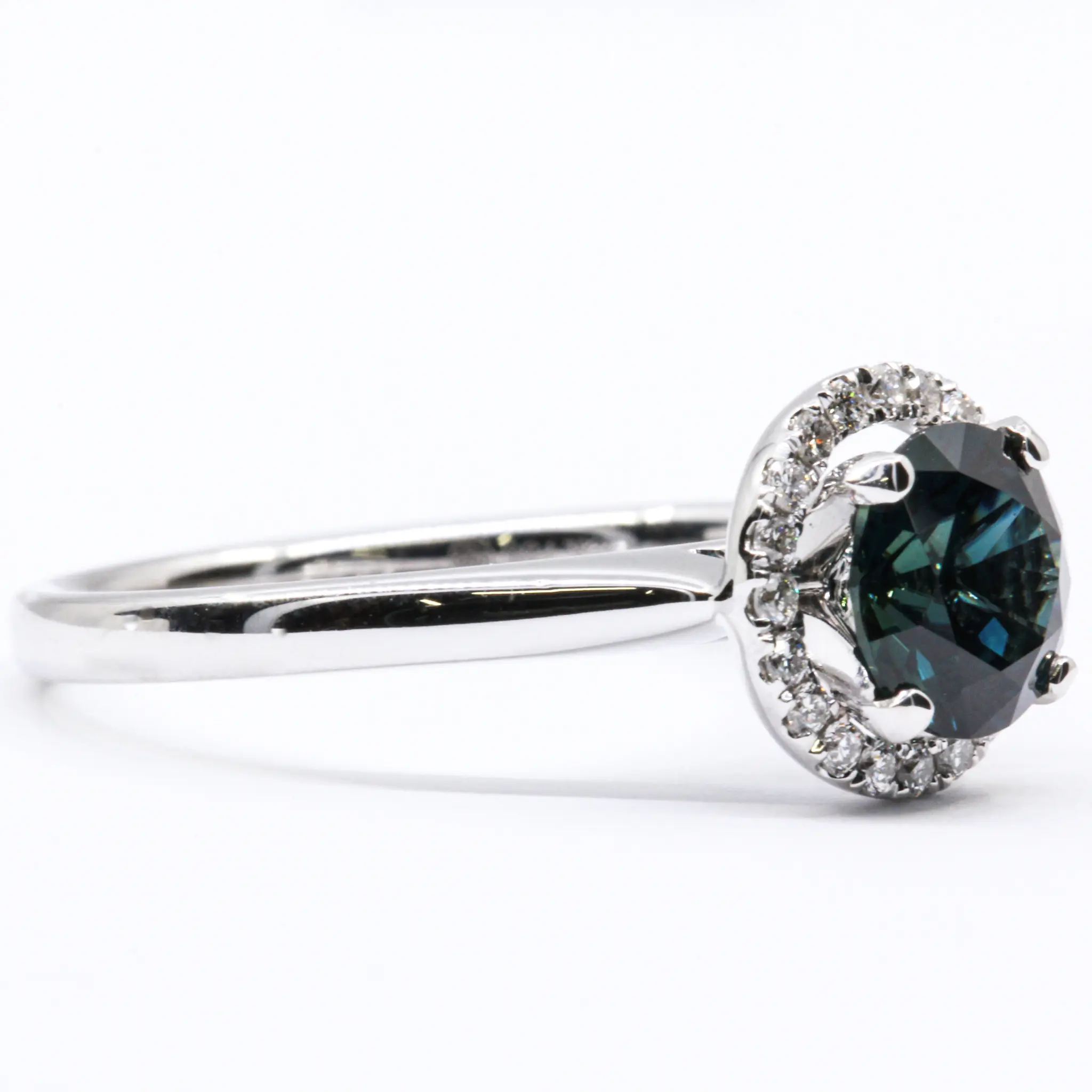 Simple halo 4-claw design ring. Australian teal sapphire of natural origin. Round-Cut. Set into solid 18ct white gold with natural diamonds.