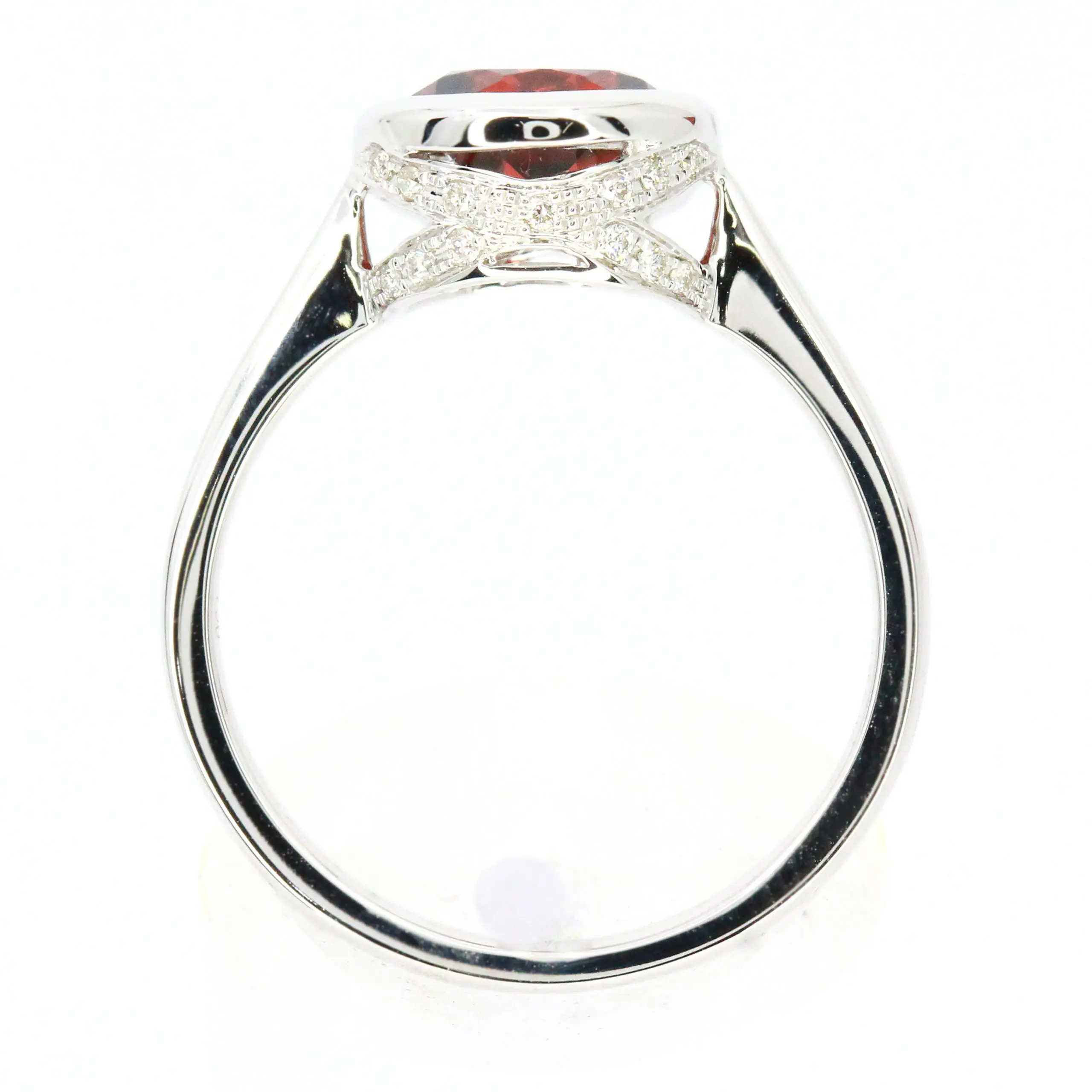 Large bezel with invisible halo design ring. Round-cut garnet of natural origin with natural diamonds. Solid 18ct white gold.