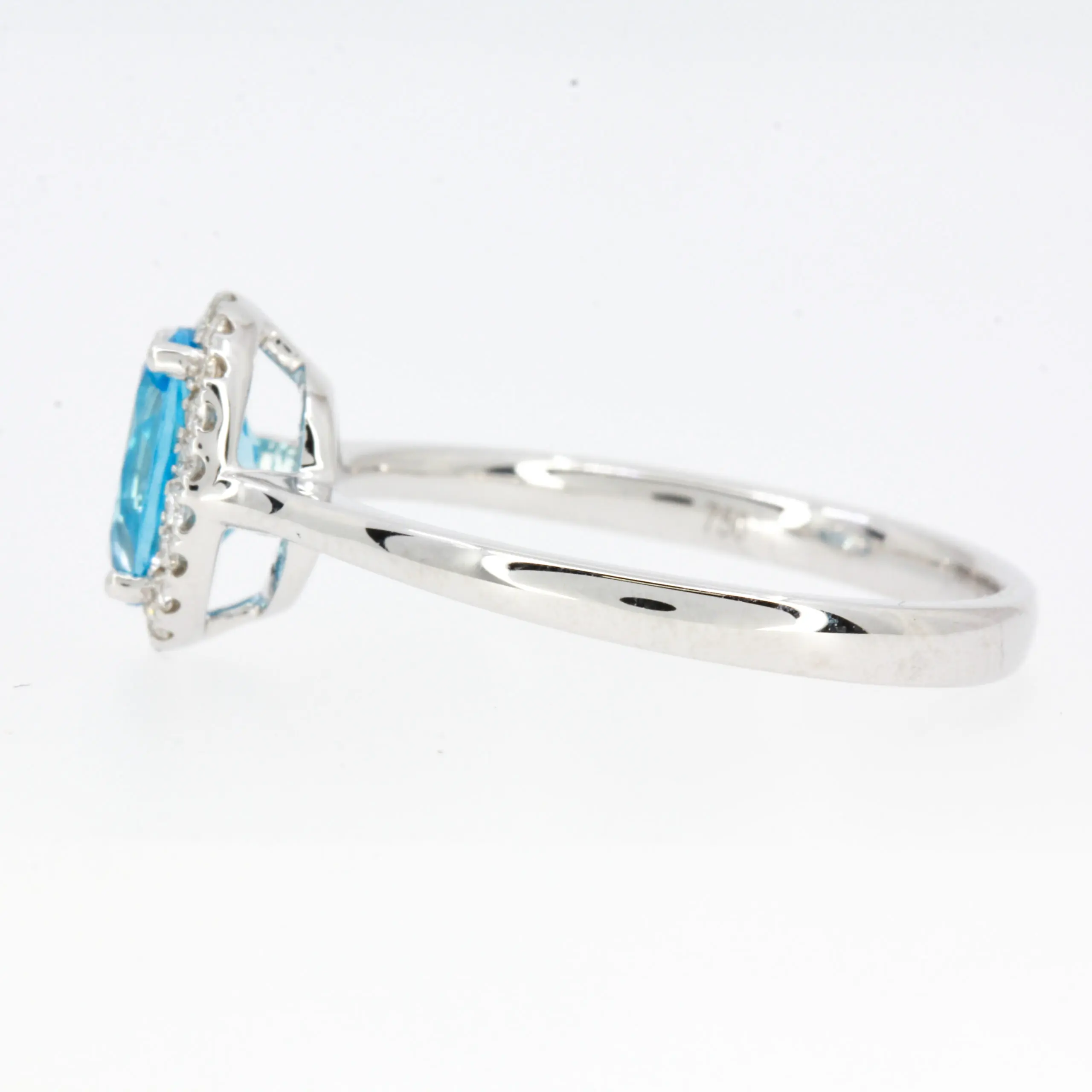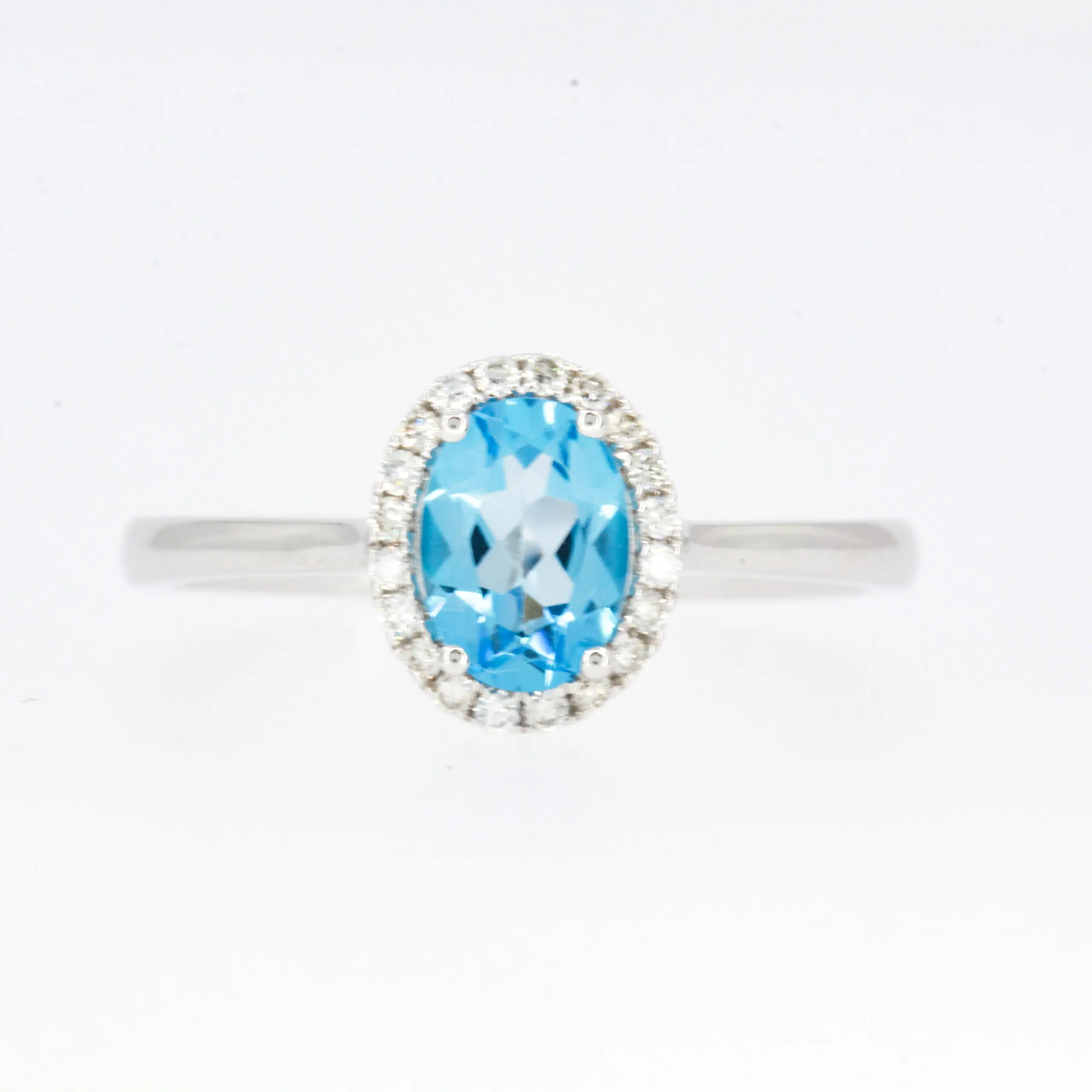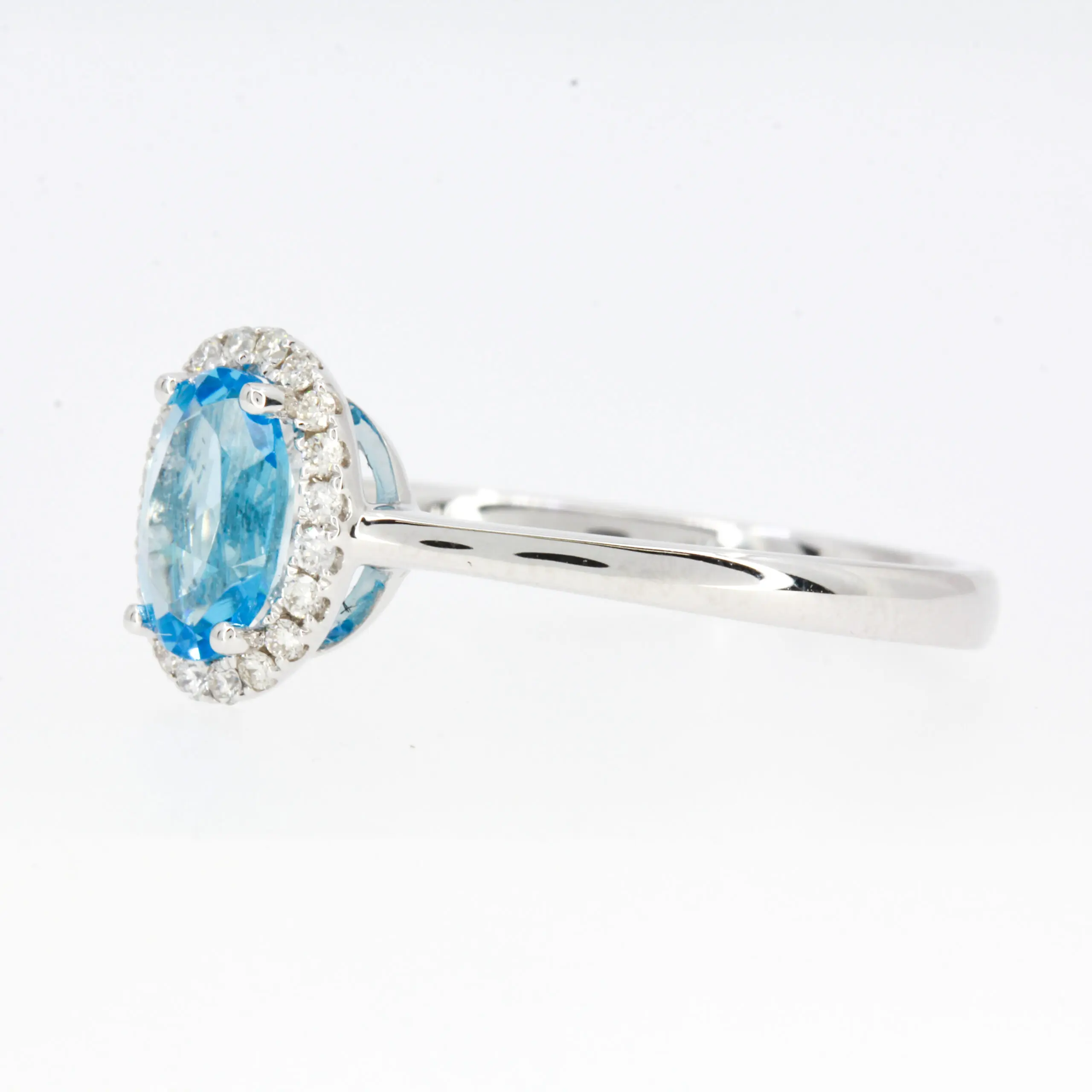 Simple halo with plain band design ring. Oval-cut blue topaz of natural origin with natural diamonds. Solid 18ct white gold.