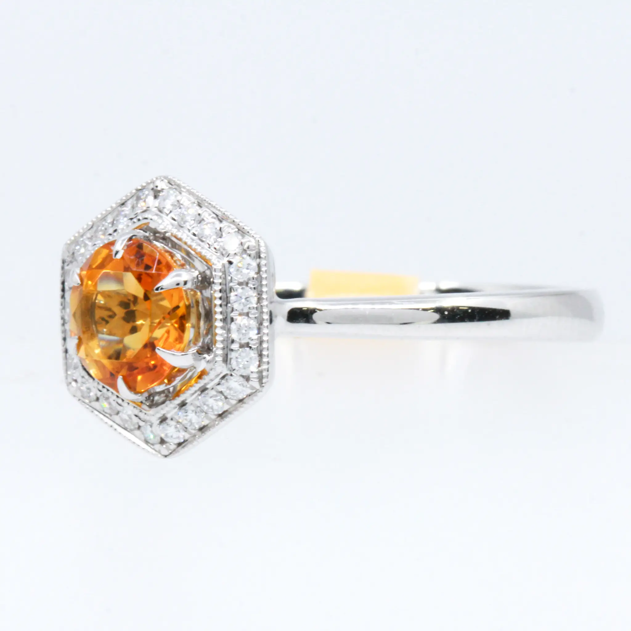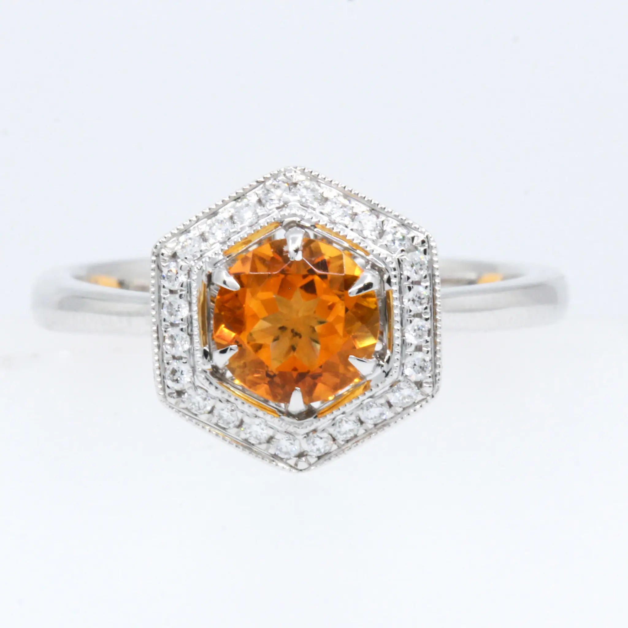 6 claw hexagonal halo design ring. Round-cut citrine of natural origin. Solid 18ct white gold.