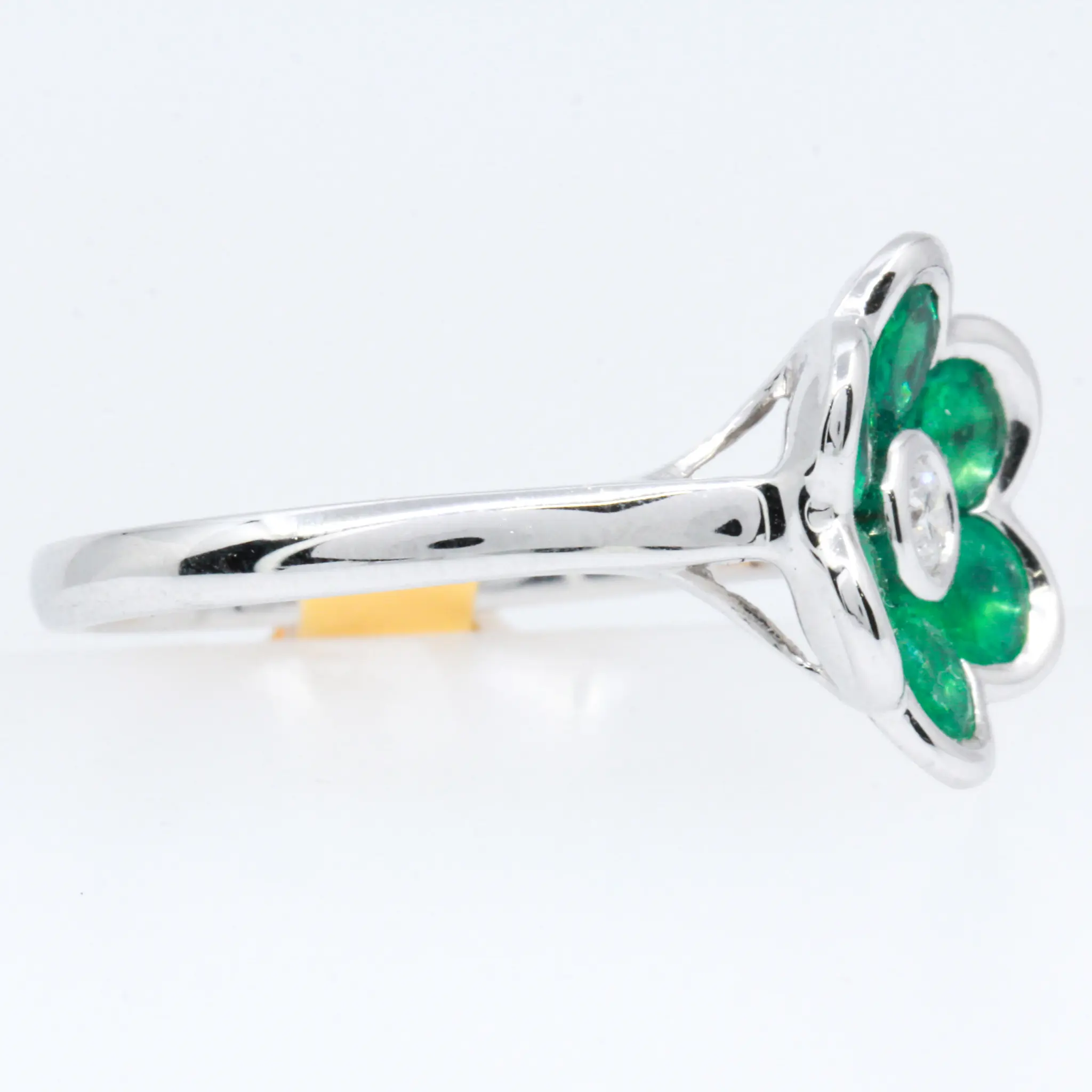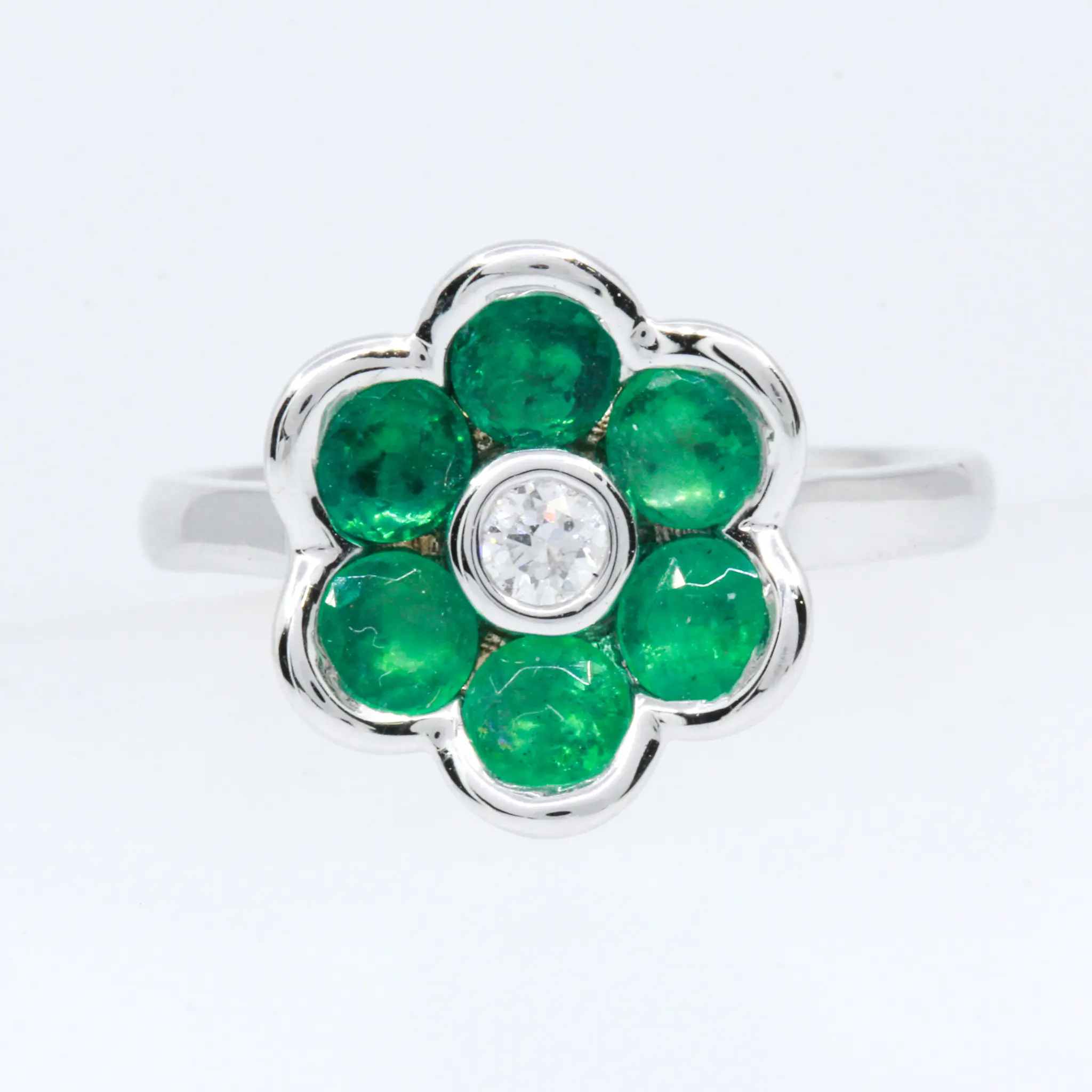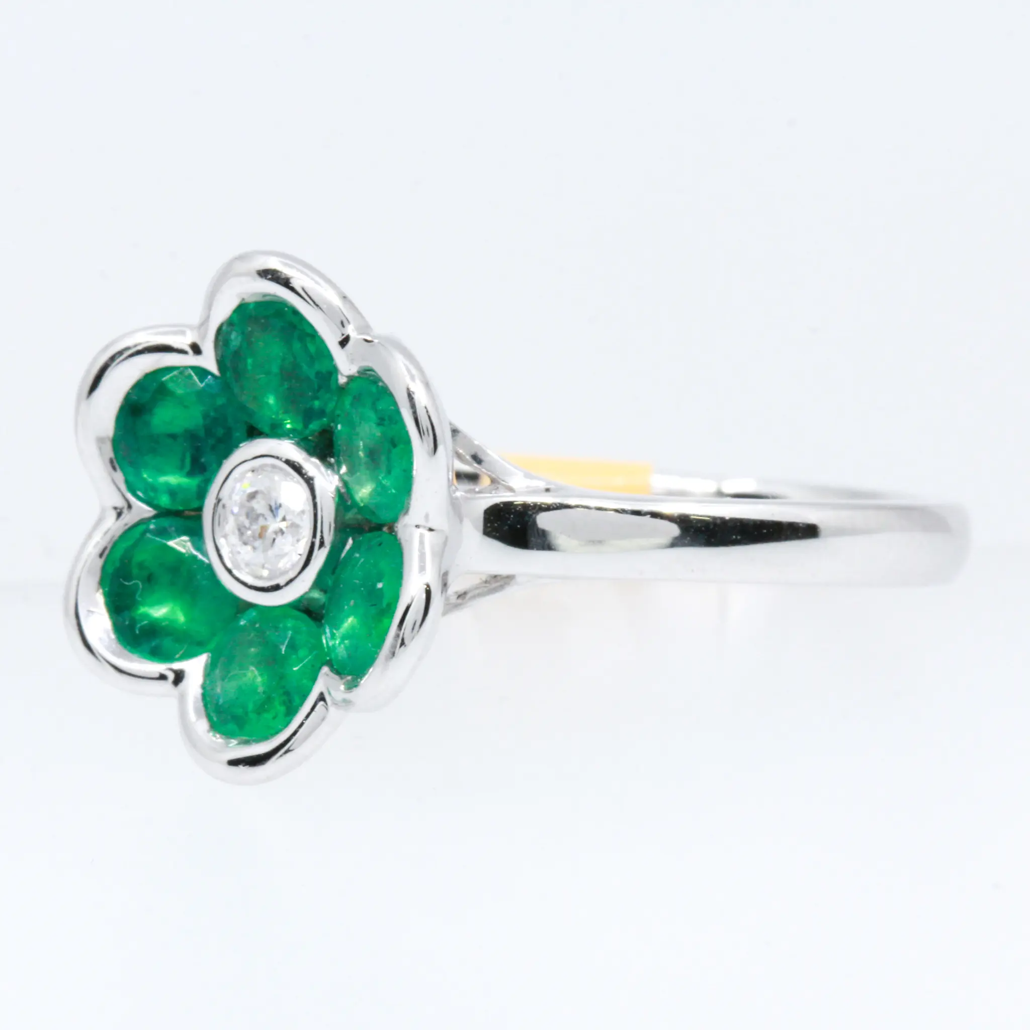 Floral design ring. Emeralds of natural origin. Round-cut emeralds. Accenting natural diamond. Set into solid 18ct white gold.