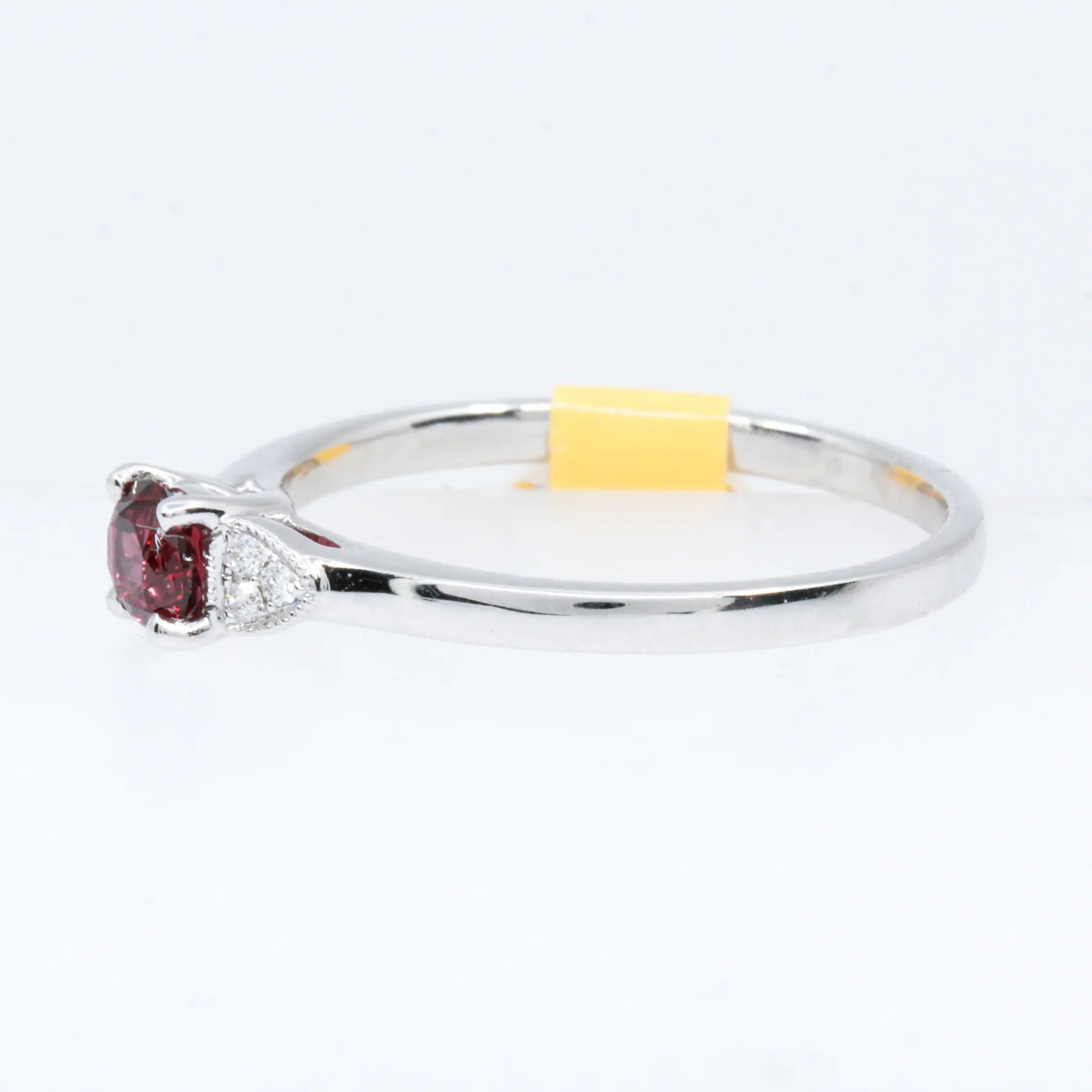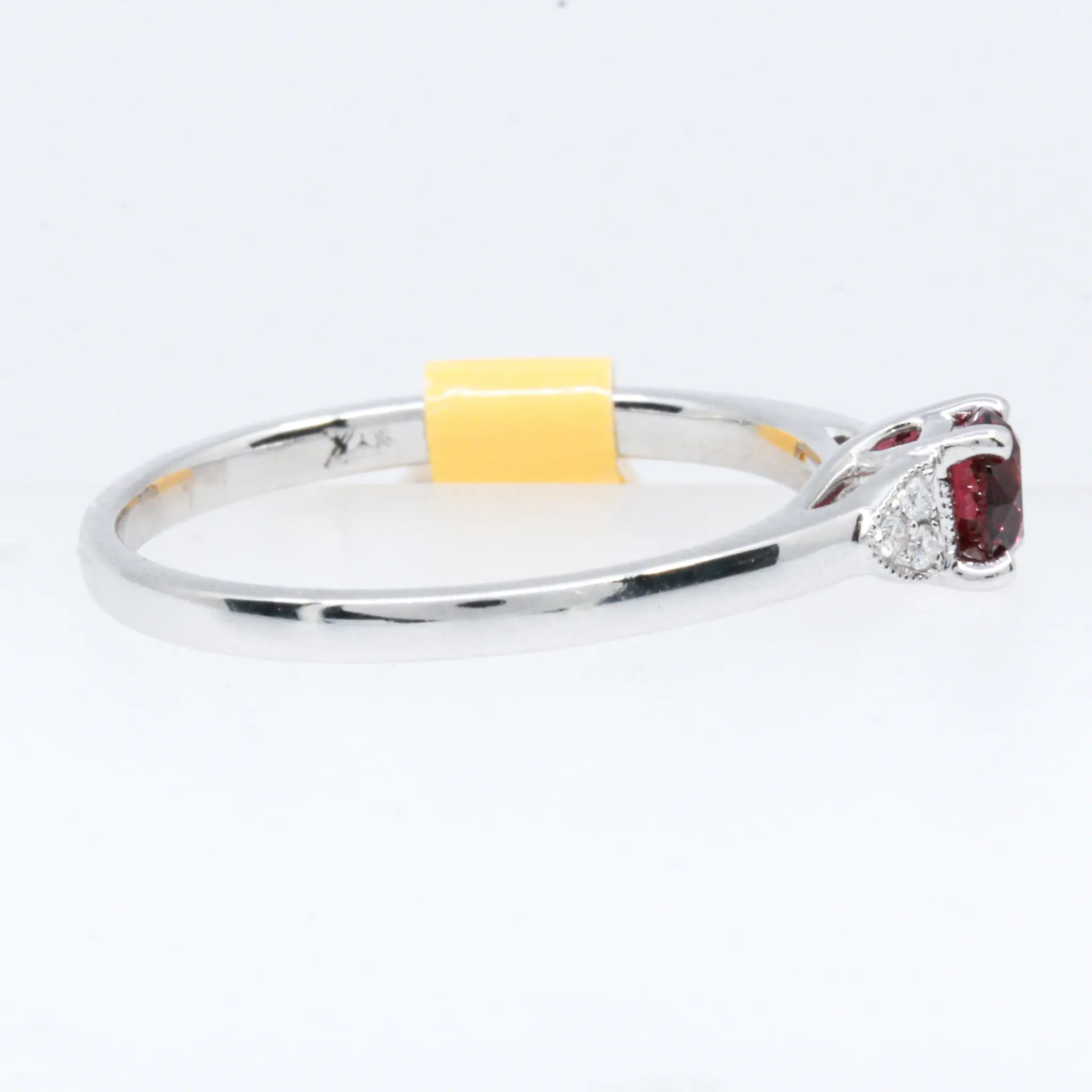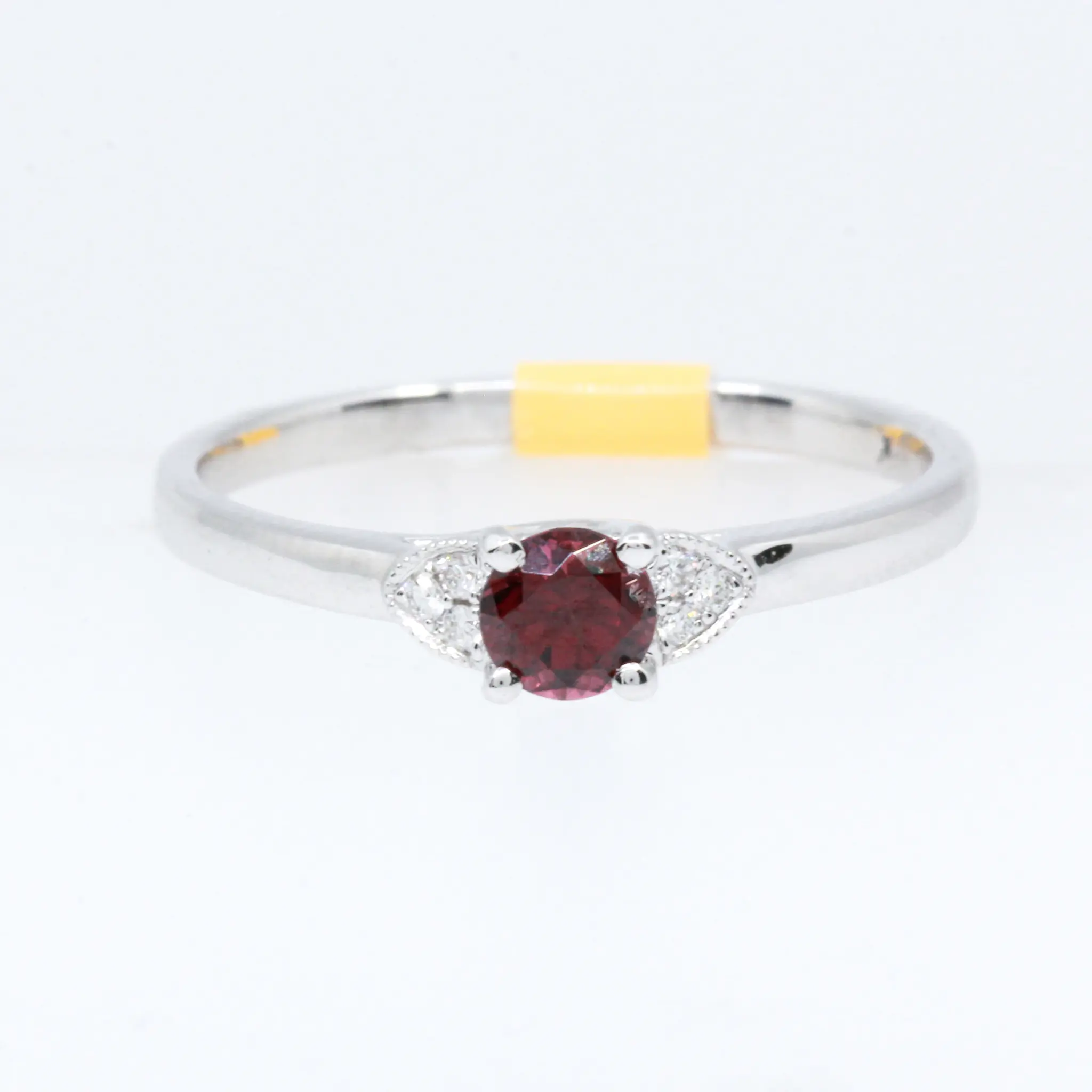 Simple 4 claw setting with accents design ring. Round-cut garnet of natural origin with natural diamonds. Solid 18ct white gold.