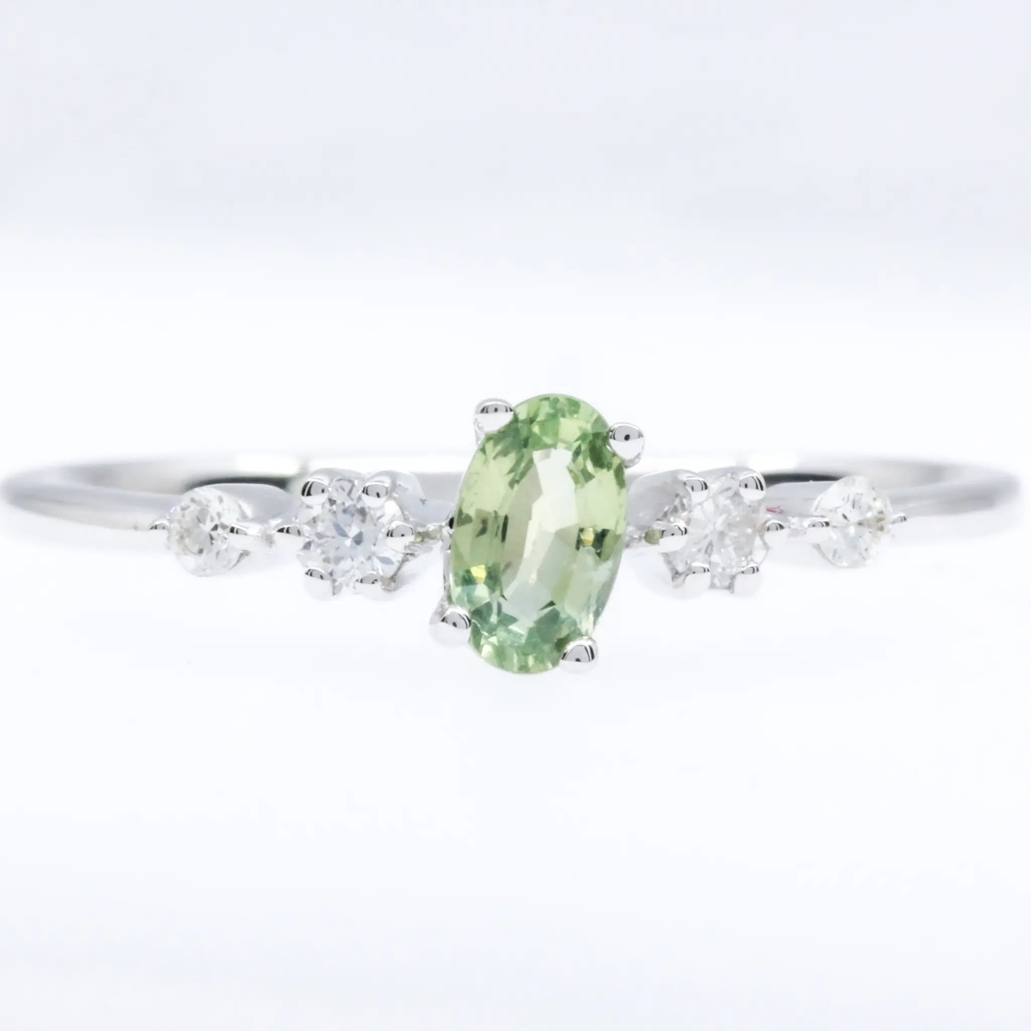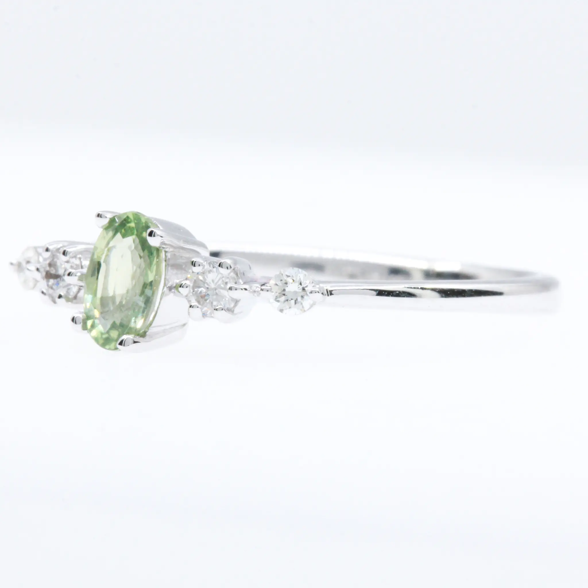Off-set 4-claw design ring. Green sapphire of natural origin. Oval-Cut. Set into solid 18ct white gold with natural diamonds.