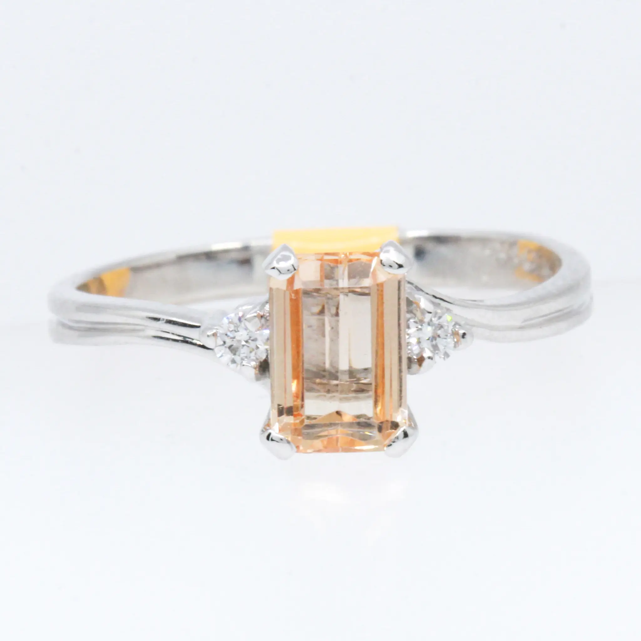 4-claw twisted band trilogy design ring. emerald-cut imperial topaz of natural origin with natural diamonds. Solid 18ct white gold.