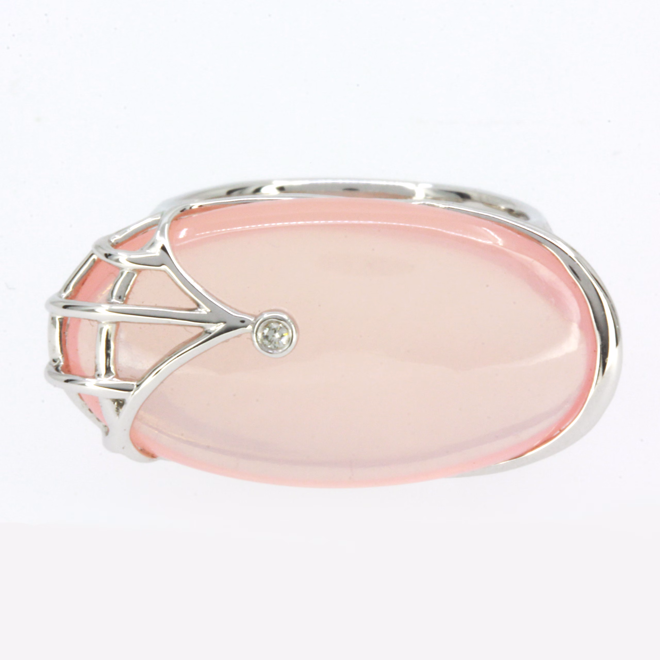 18ct white gold rose quartz cabochon wrapped style setting. Accenting diamond.