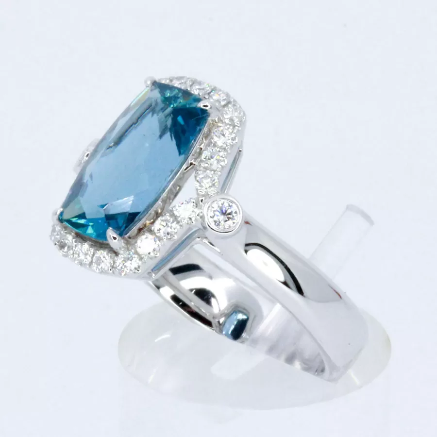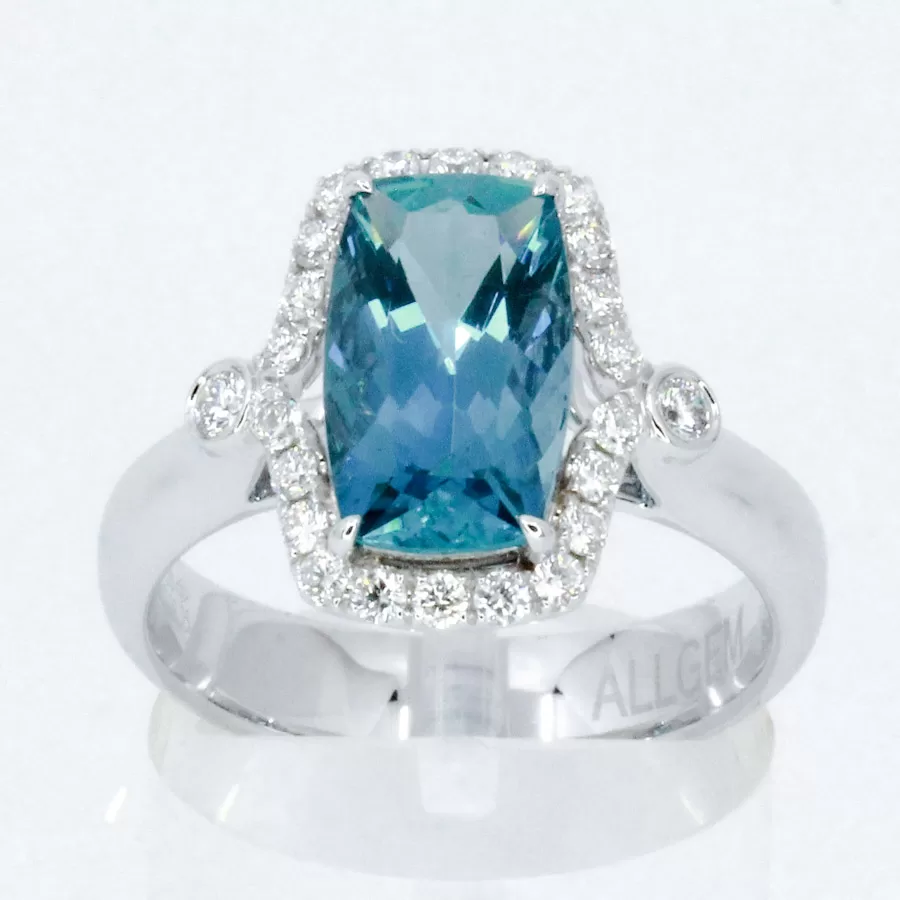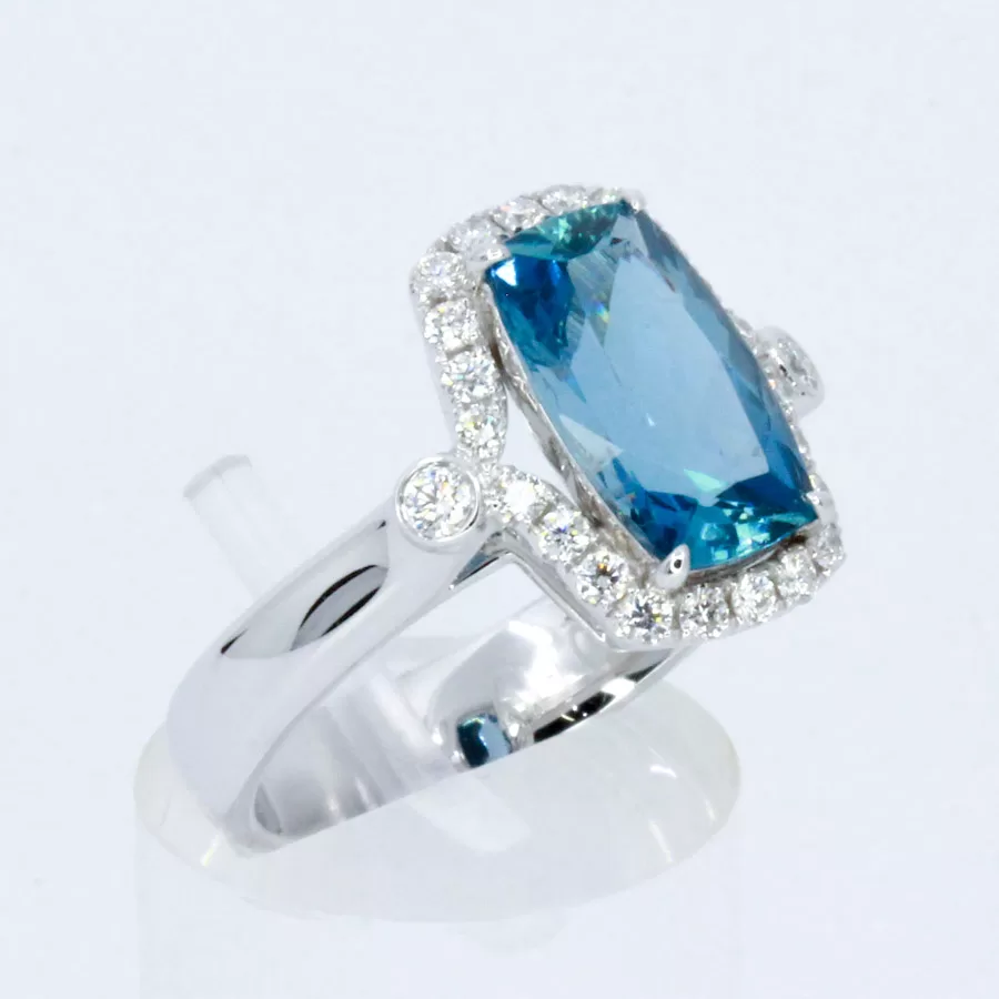 Deep blue Santa Maria Aquamarine in a halo design ring. Rectangular-cushion-cut aquamarine of natural origin with natural diamonds. Solid 18ct white gold. Rare variety of aquamarine.