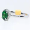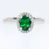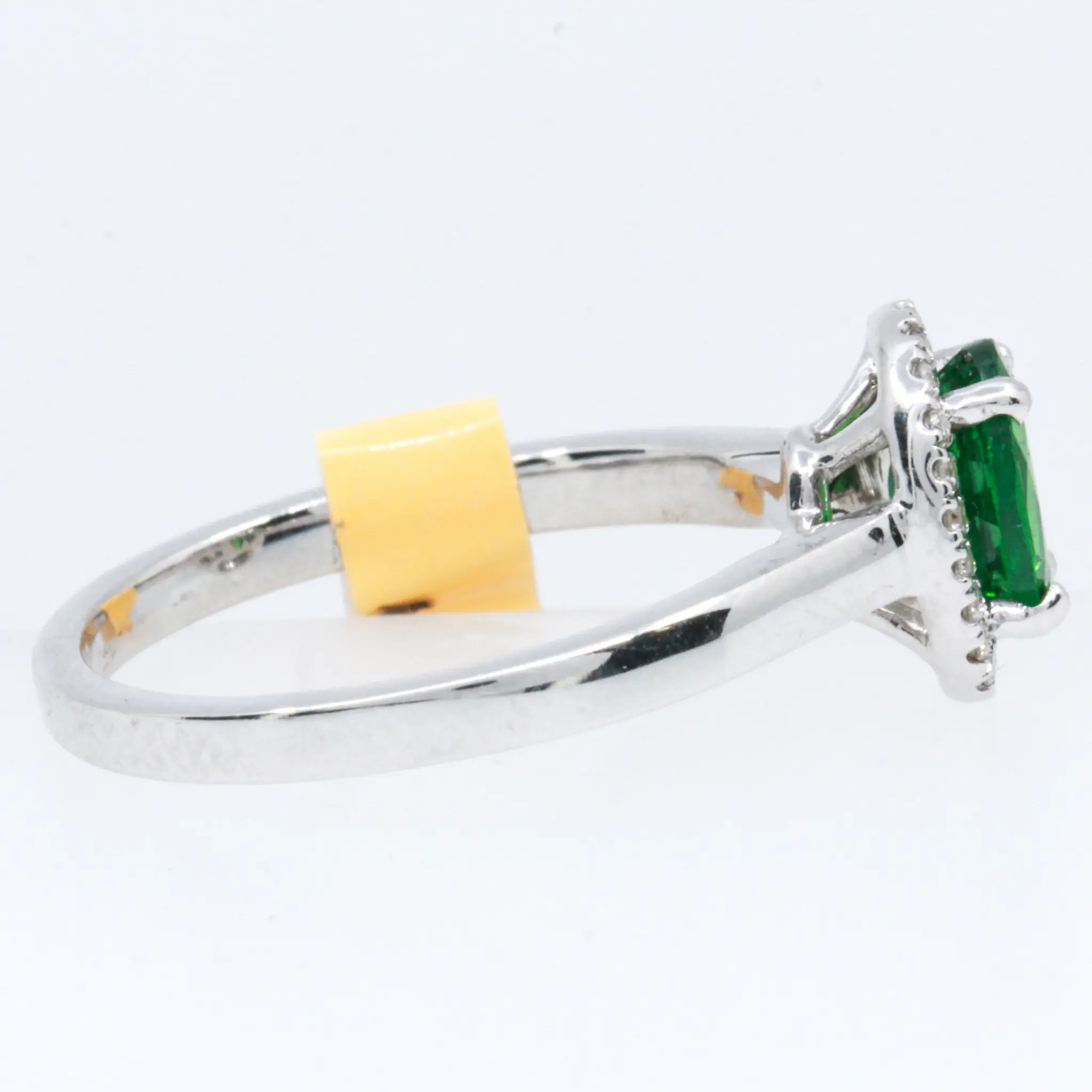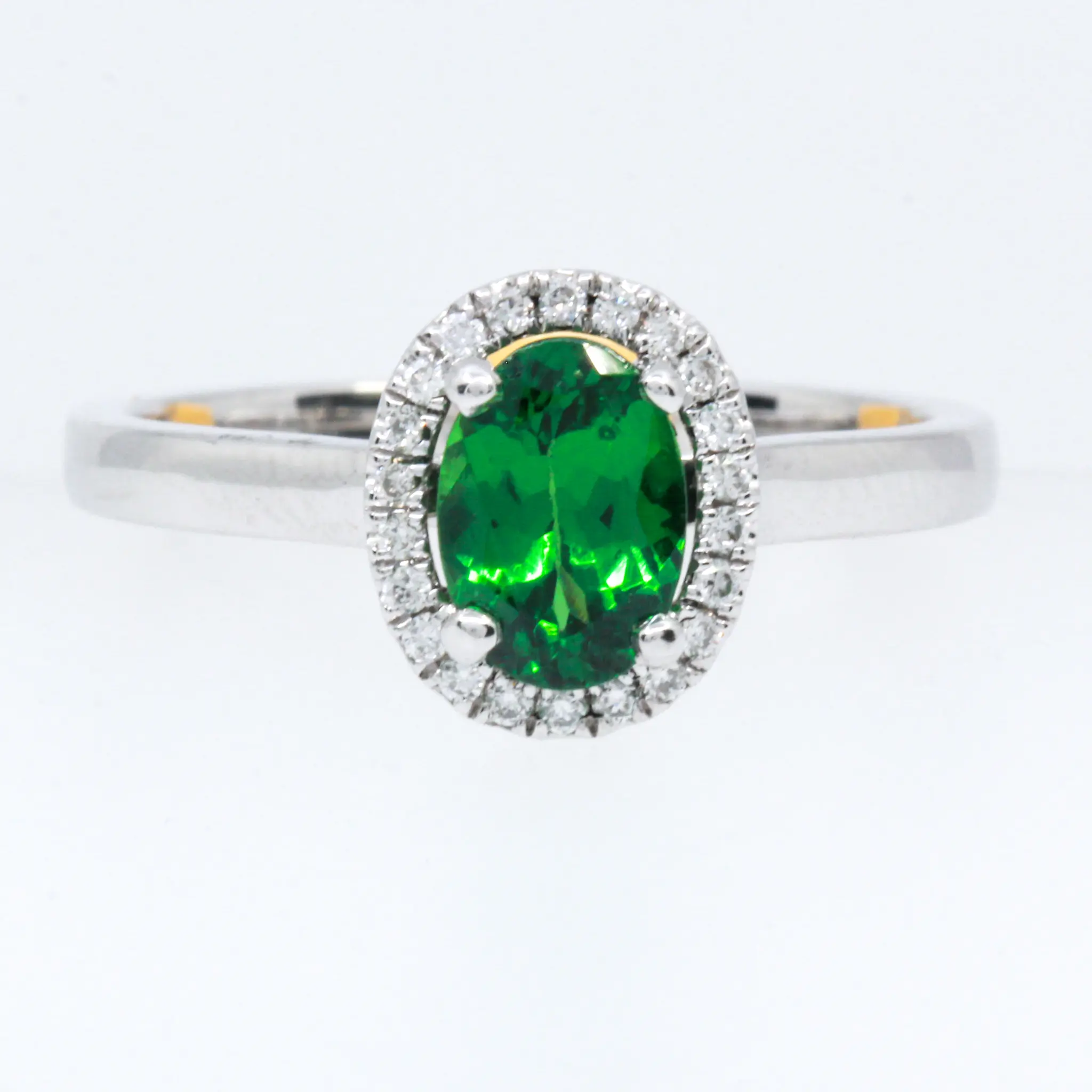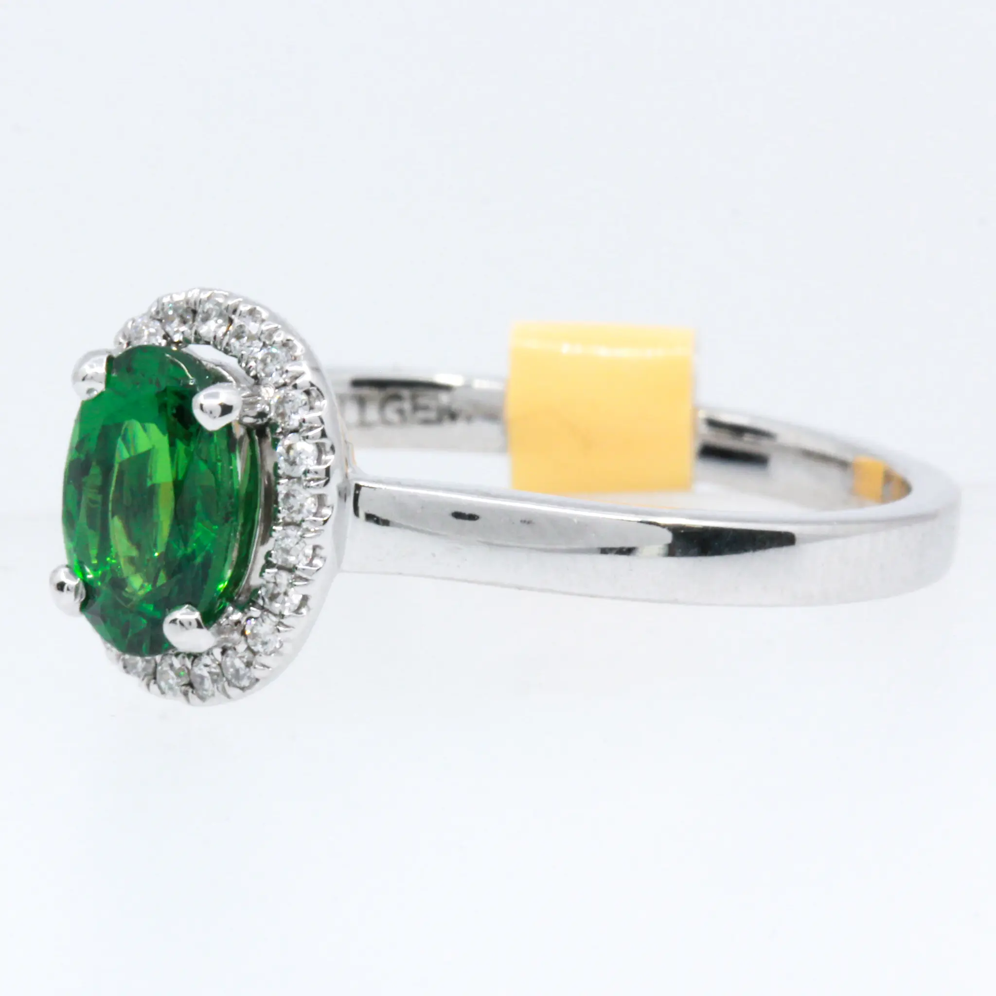 Simple oval halo design ring. Oval-cut tsavorite garnet of natural origin with natural diamonds. Solid 18ct white gold.