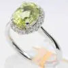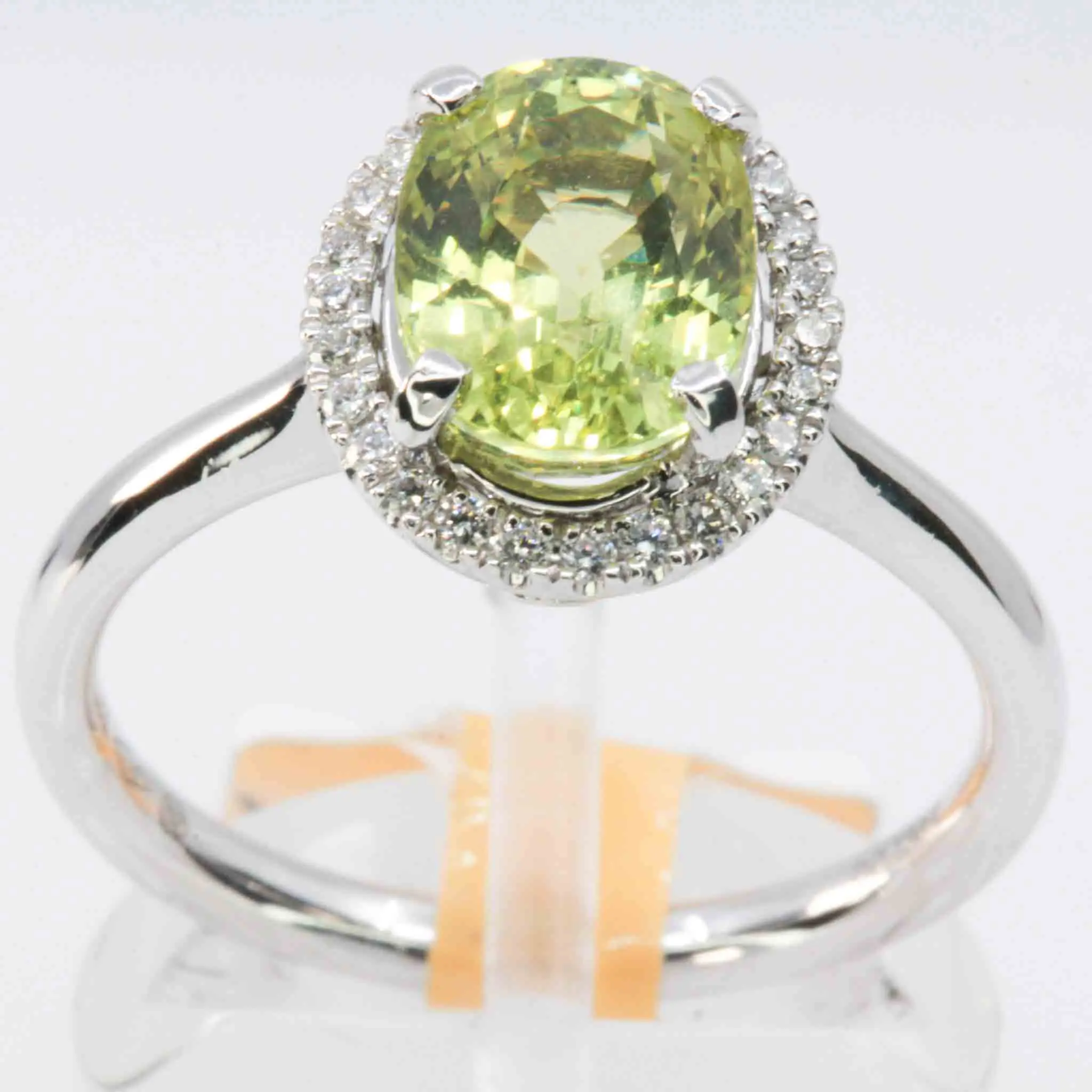 Simple halo 4-claw design ring. Unheated yellow sapphire of natural origin. Oval-Cut. Set into solid 18ct white gold with natural diamonds.