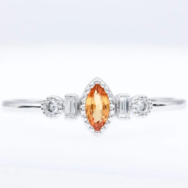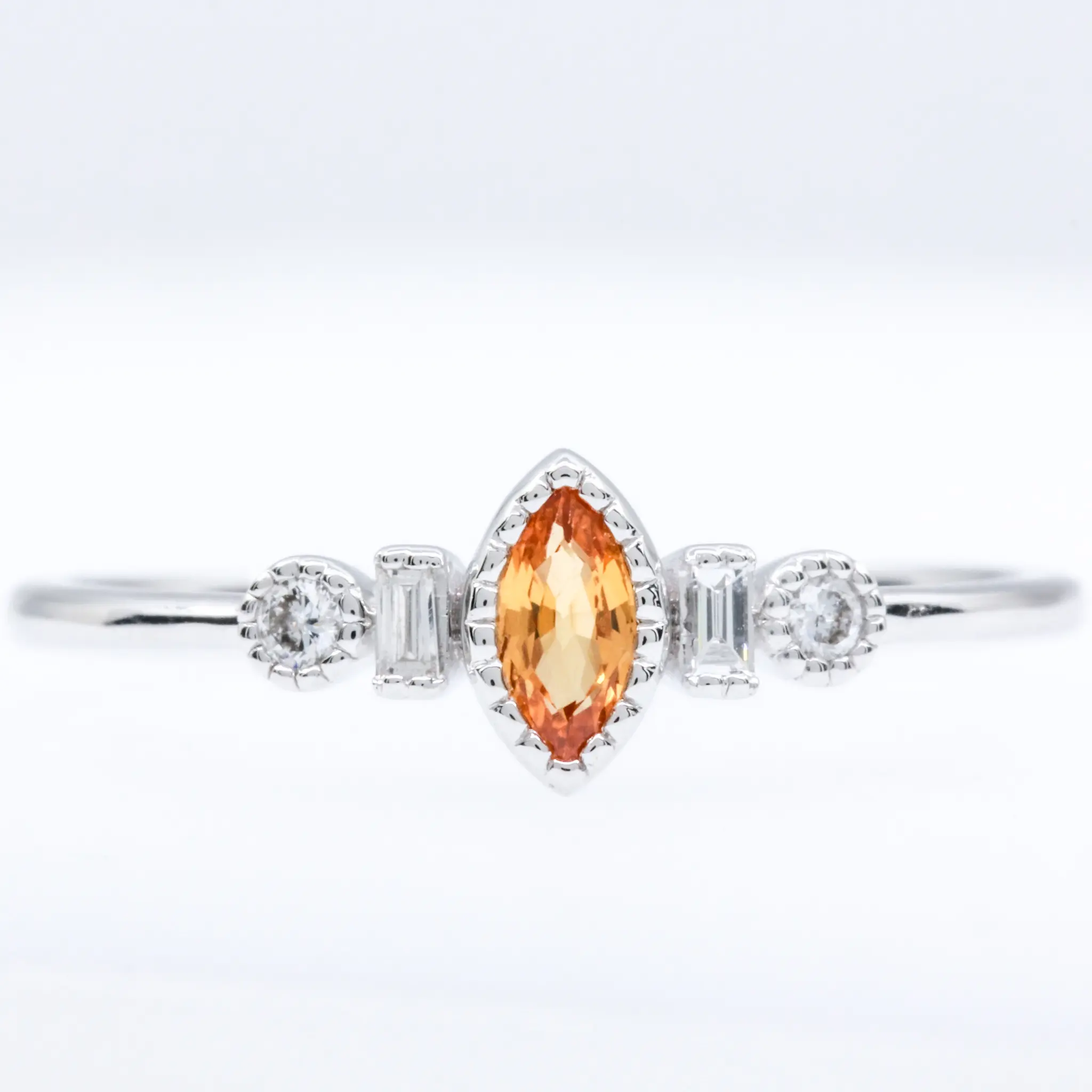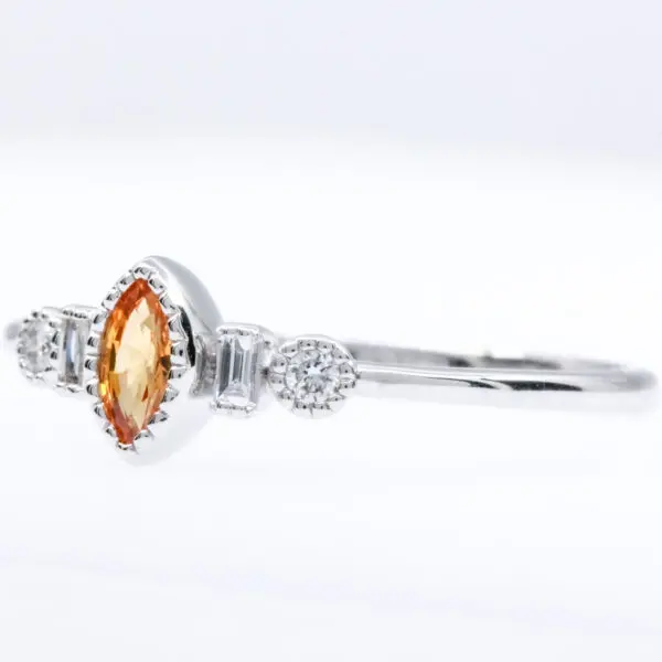 Abstract shape design ring. Yellow sapphire of natural origin. Marquise-Cut. Set into solid 18ct white gold with natural diamonds.