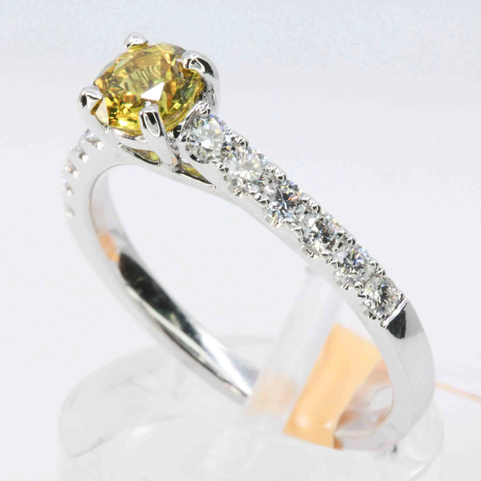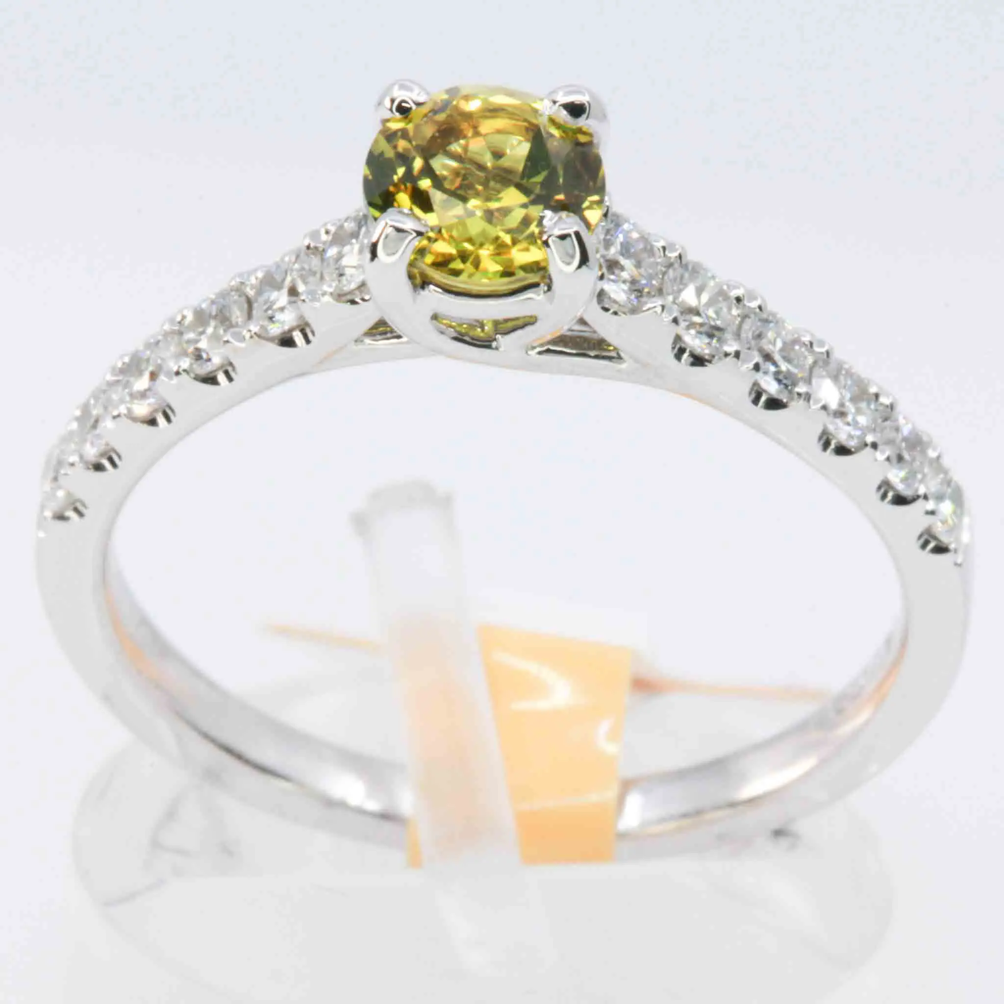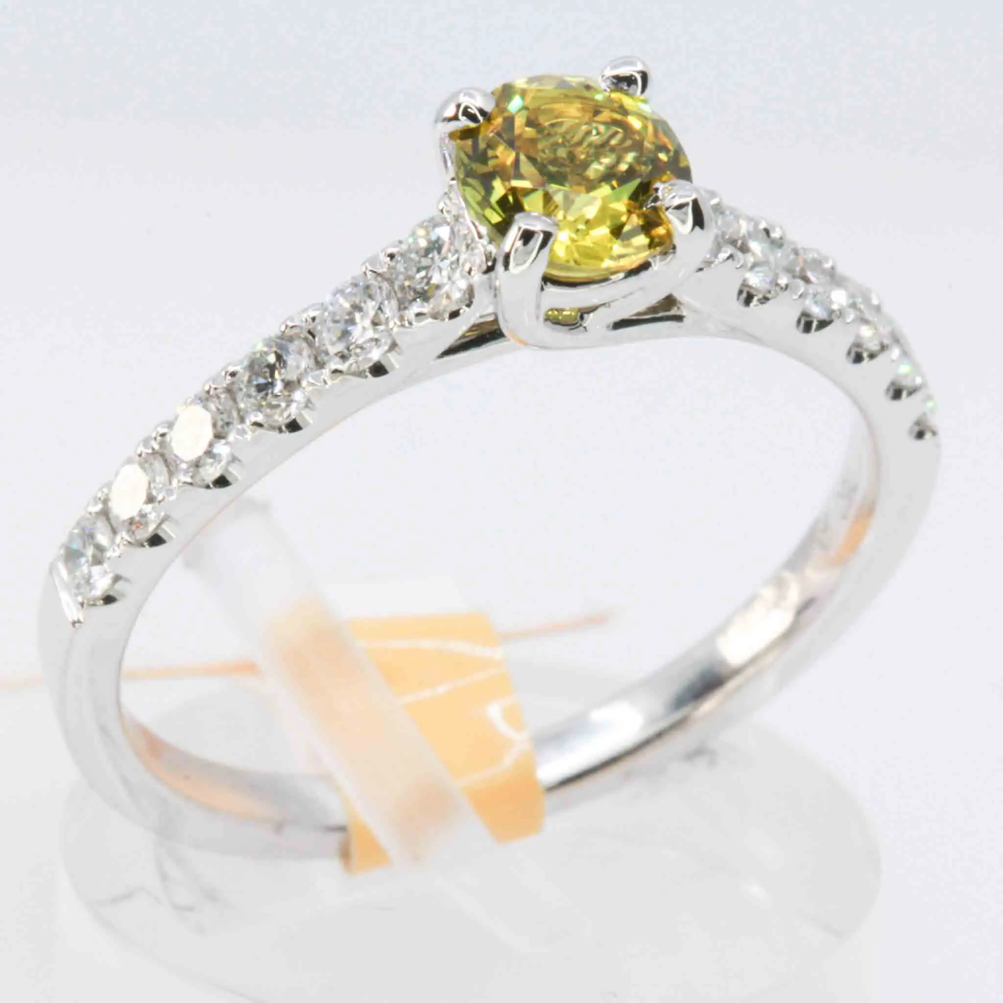 Simple 4-claw with diamond accents design ring. Australian yellow sapphire of natural origin. Round-Cut. Set into solid 18ct white gold with natural diamonds.