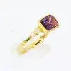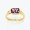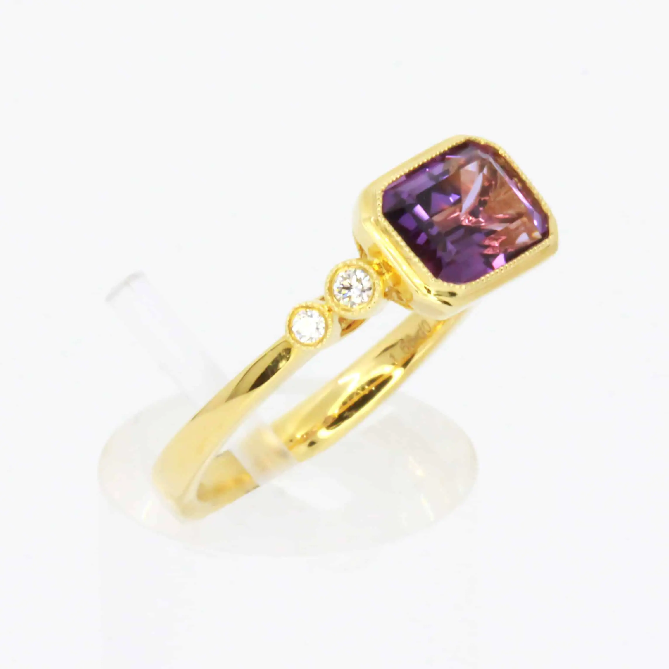 Antique milgrained bezel design ring. Emerald-cut amethyst of natural origin with natural diamonds. Solid 18ct yellow gold.