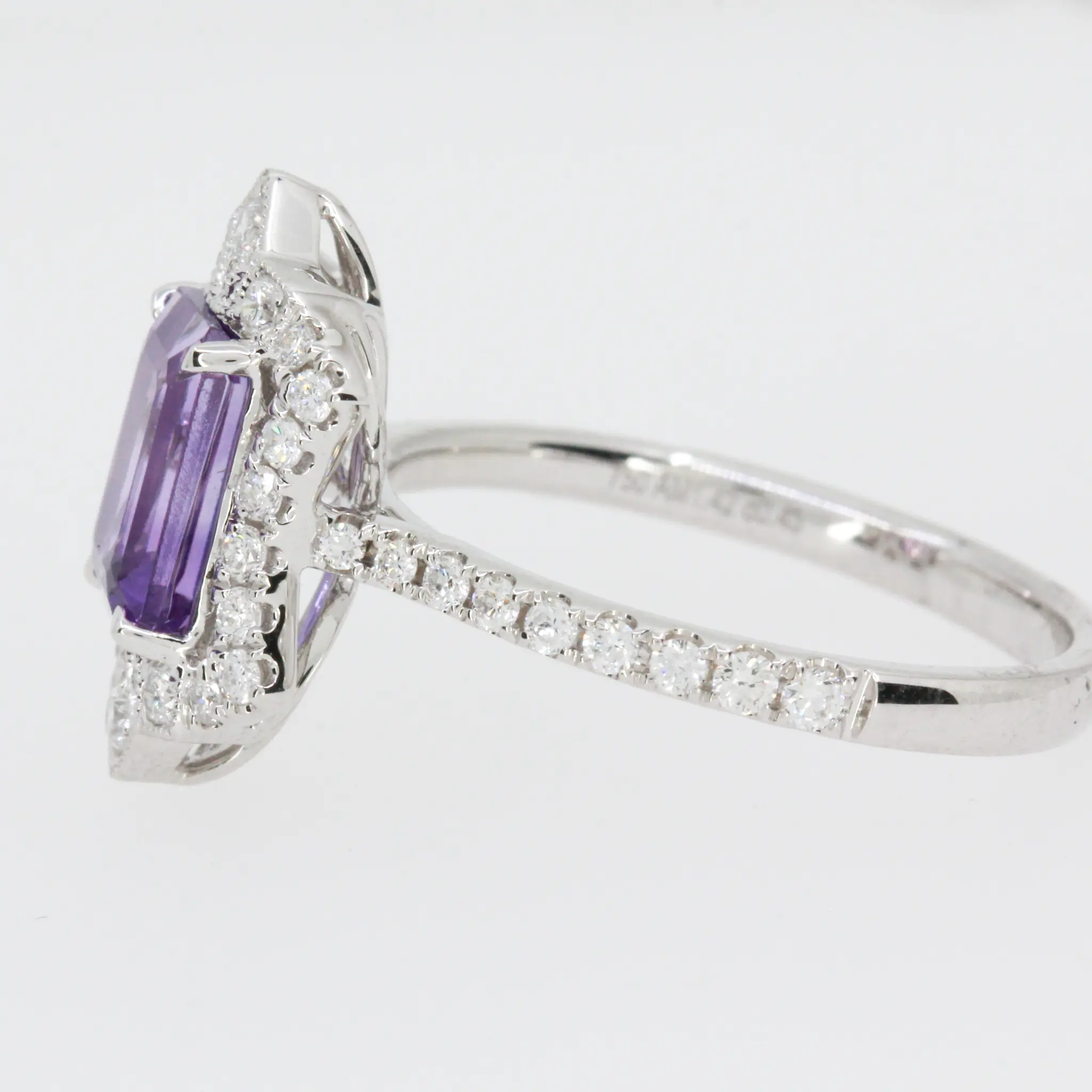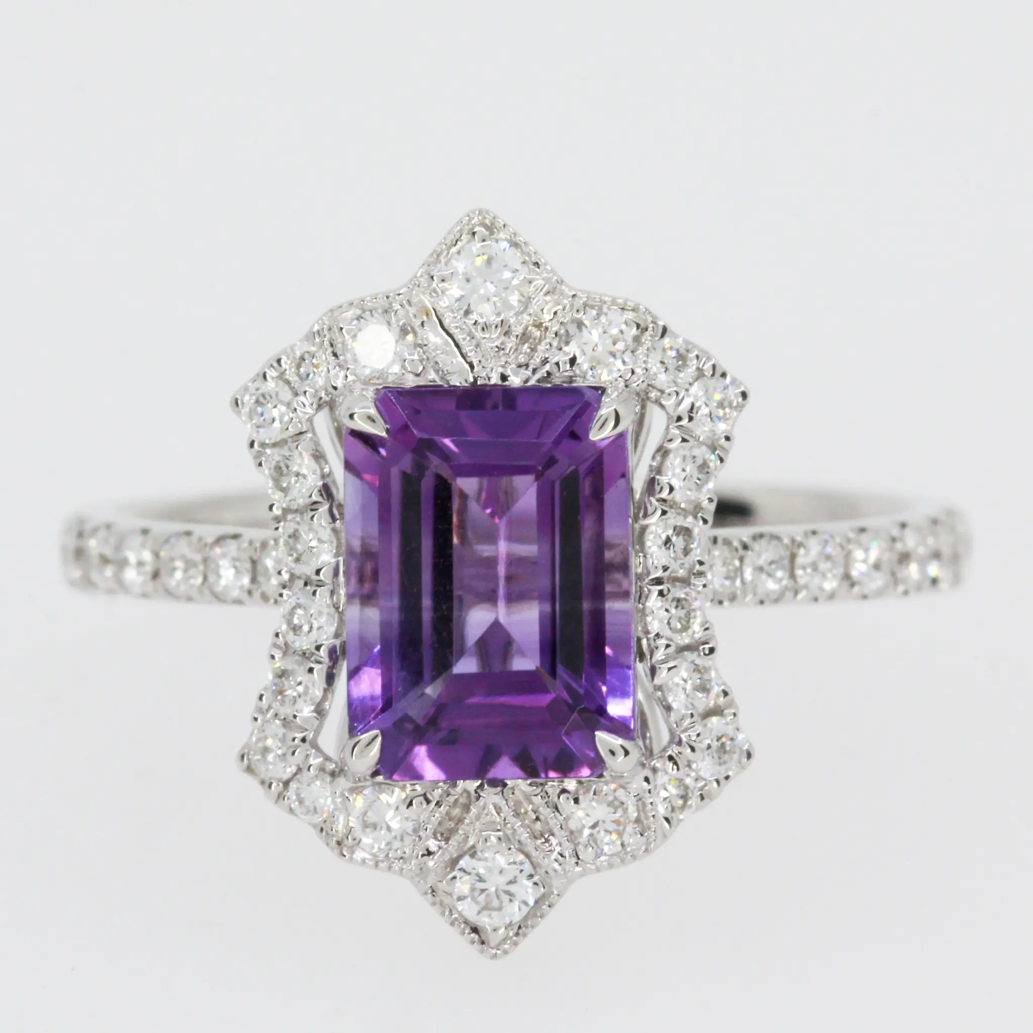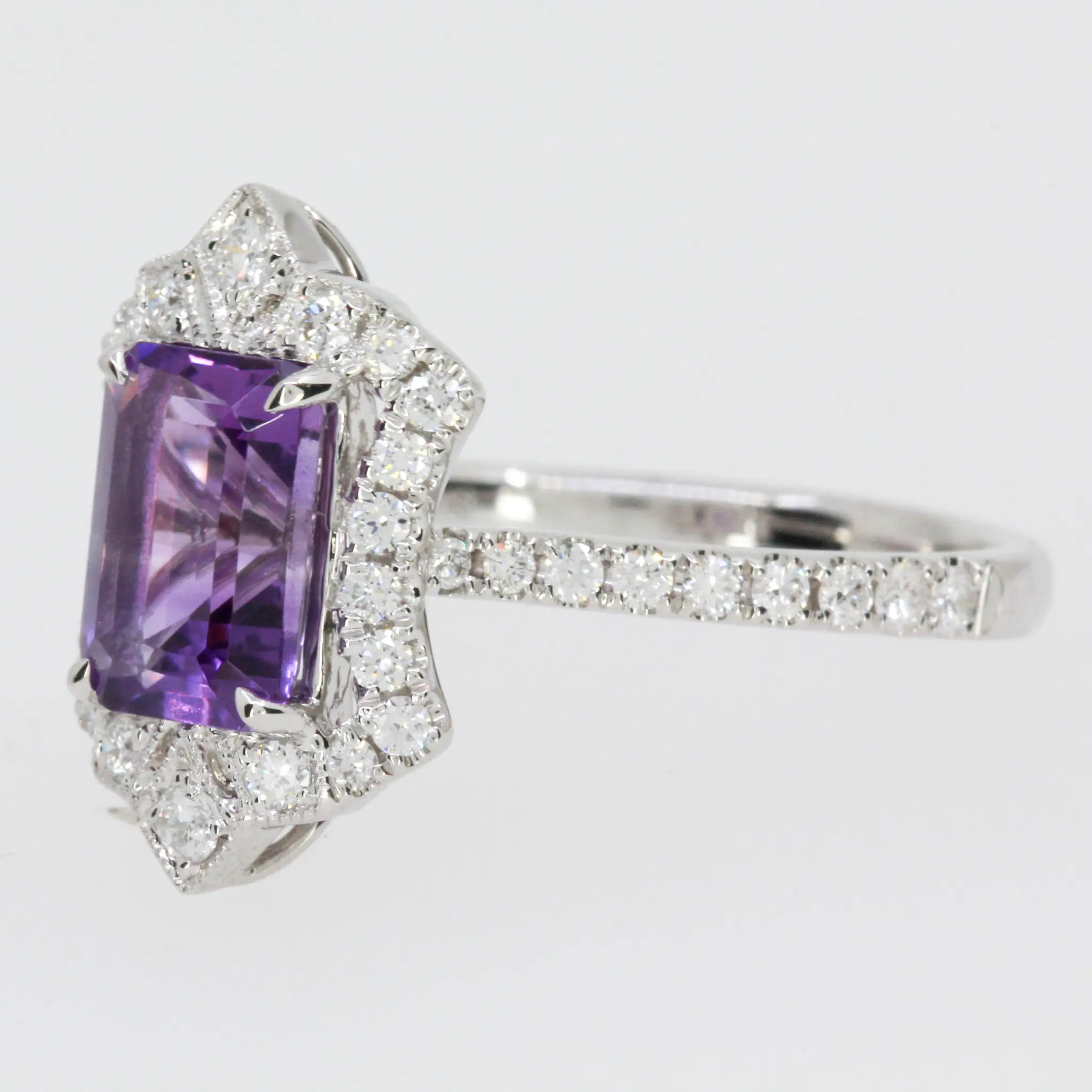 Antique halo with accents design ring. Emerald-cut amethyst of natural origin with natural diamonds. Solid 18ct white gold.