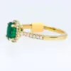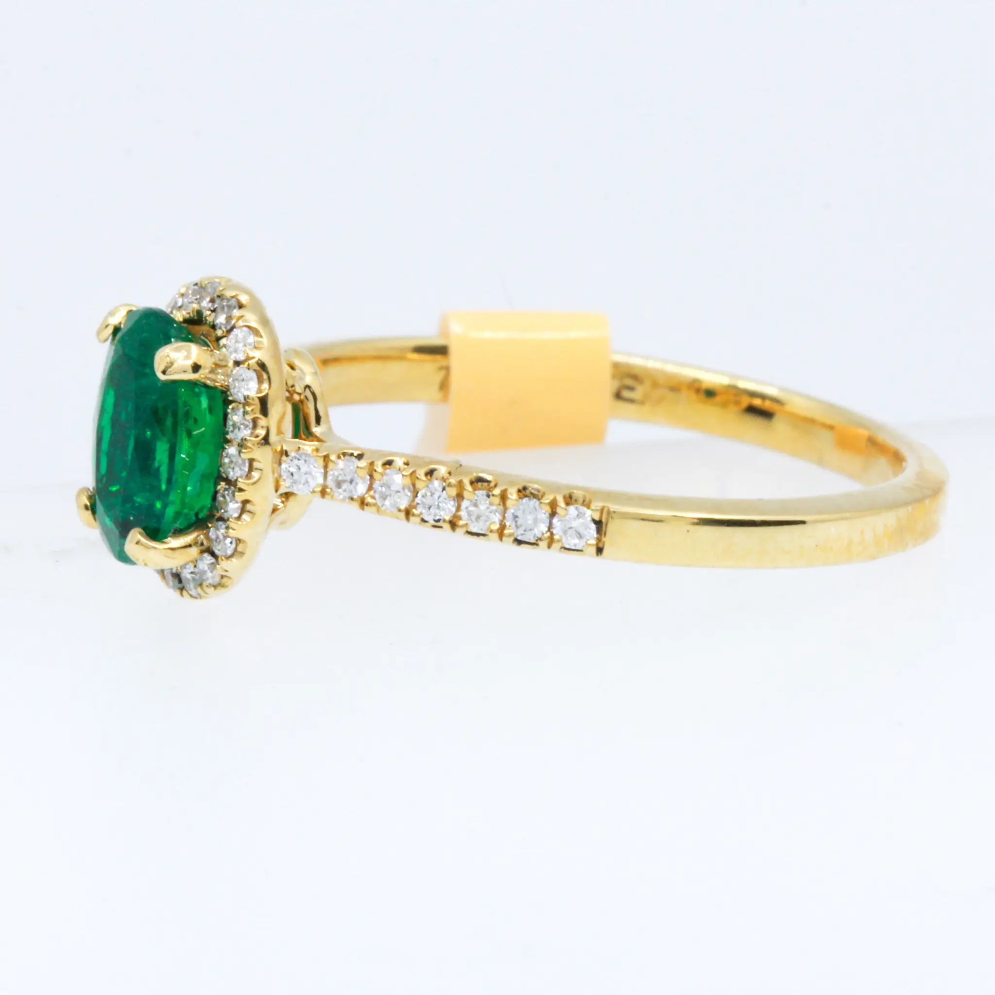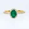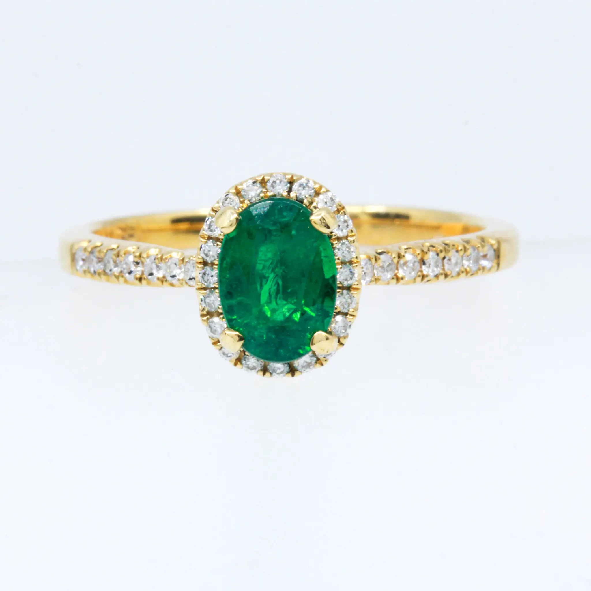 Emerald of natural origin. Oval-cut emerald. Accenting natural diamonds. Set into solid 18ct yellow gold.