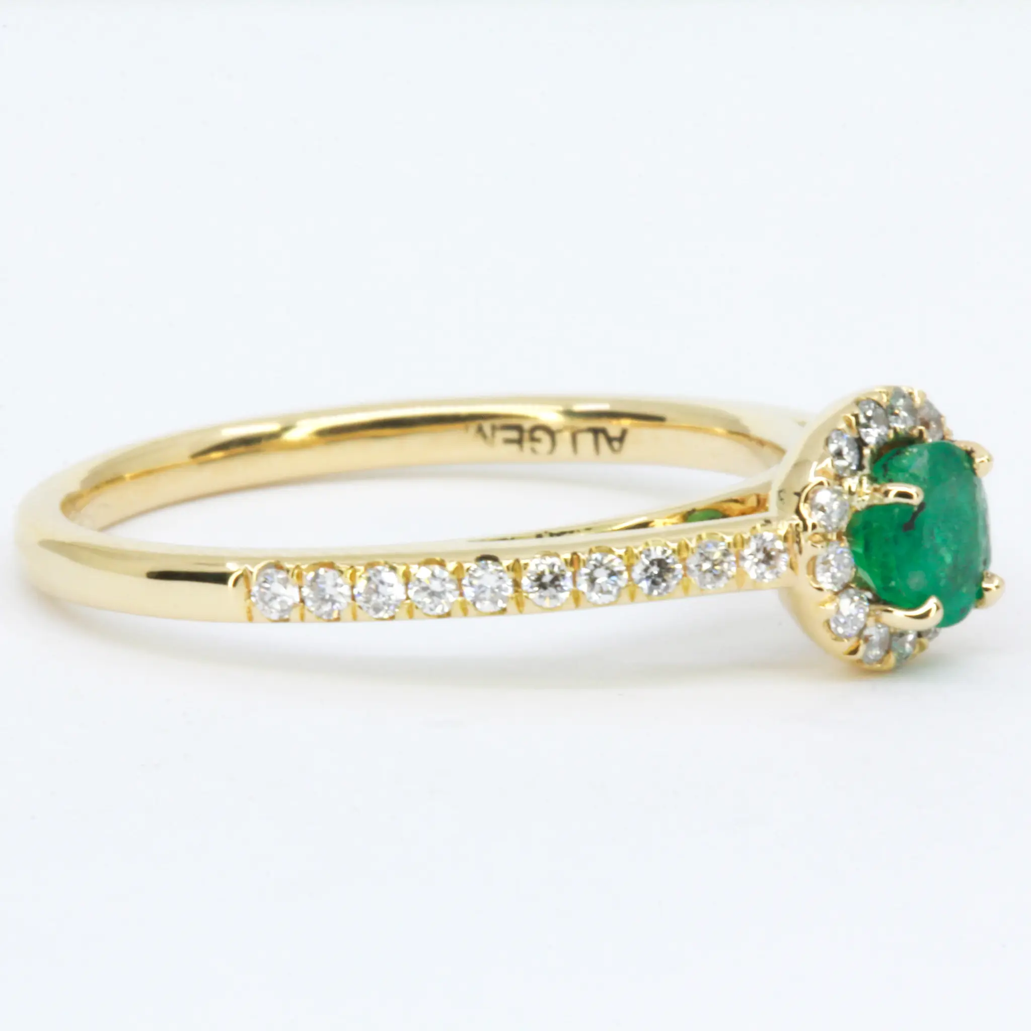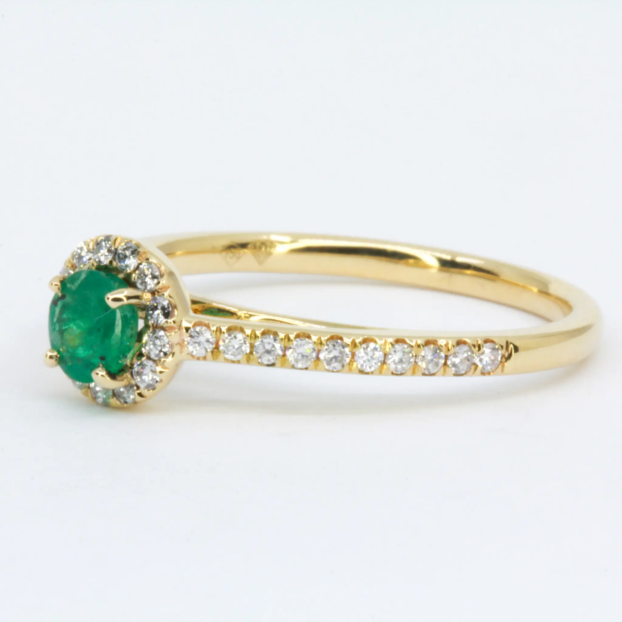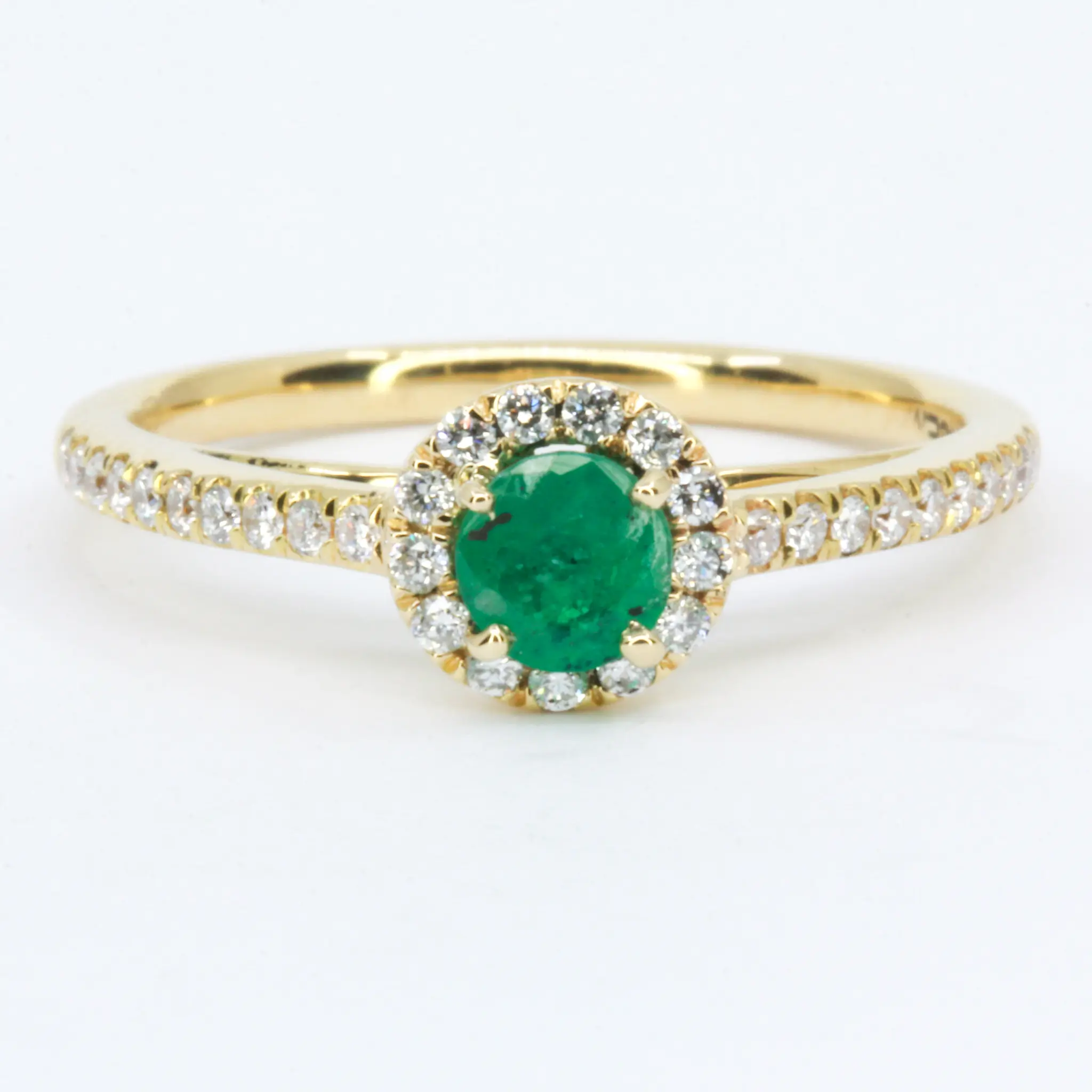 Emerald of natural origin. Round-cut emerald. Accenting natural diamonds. Set into solid 18ct yellow gold.