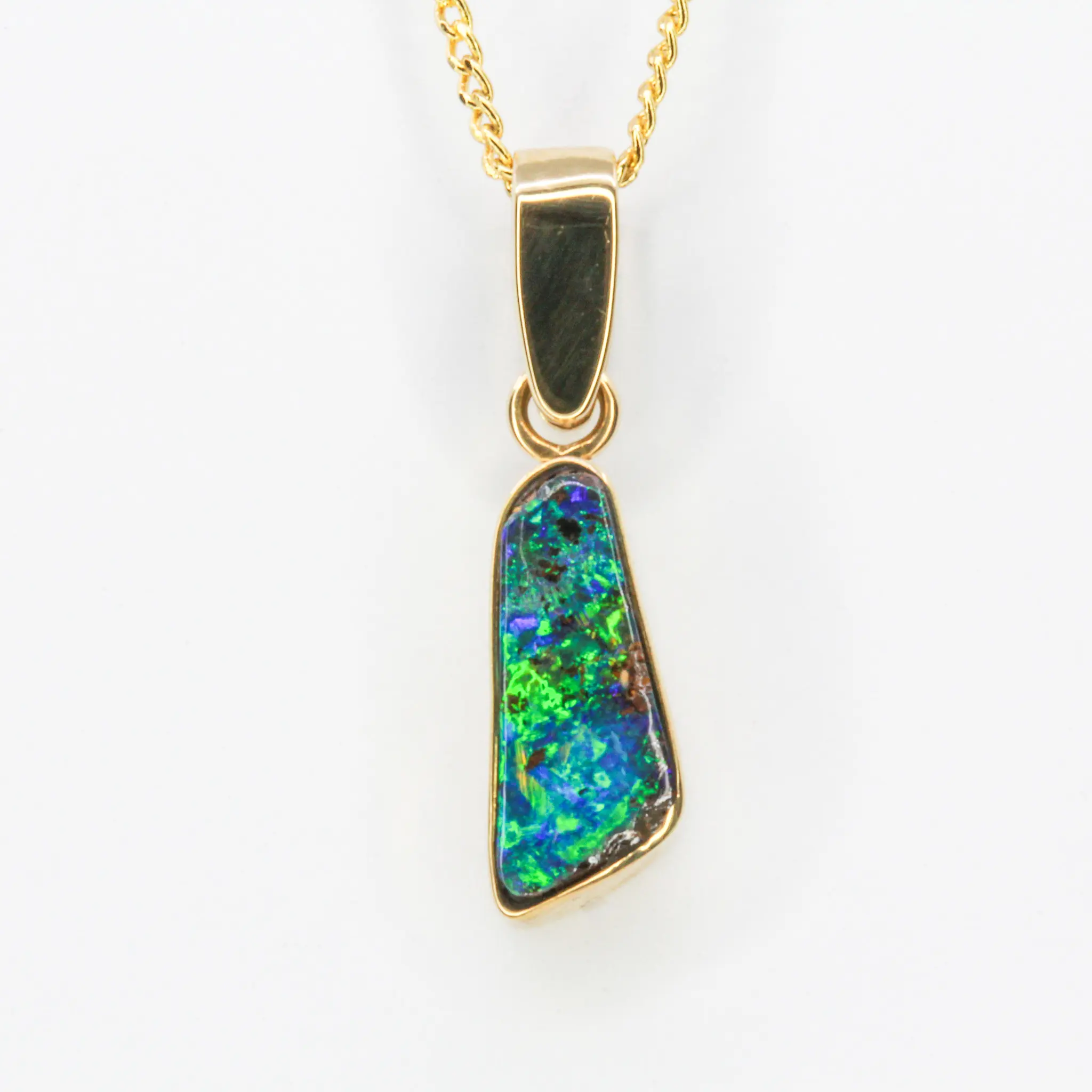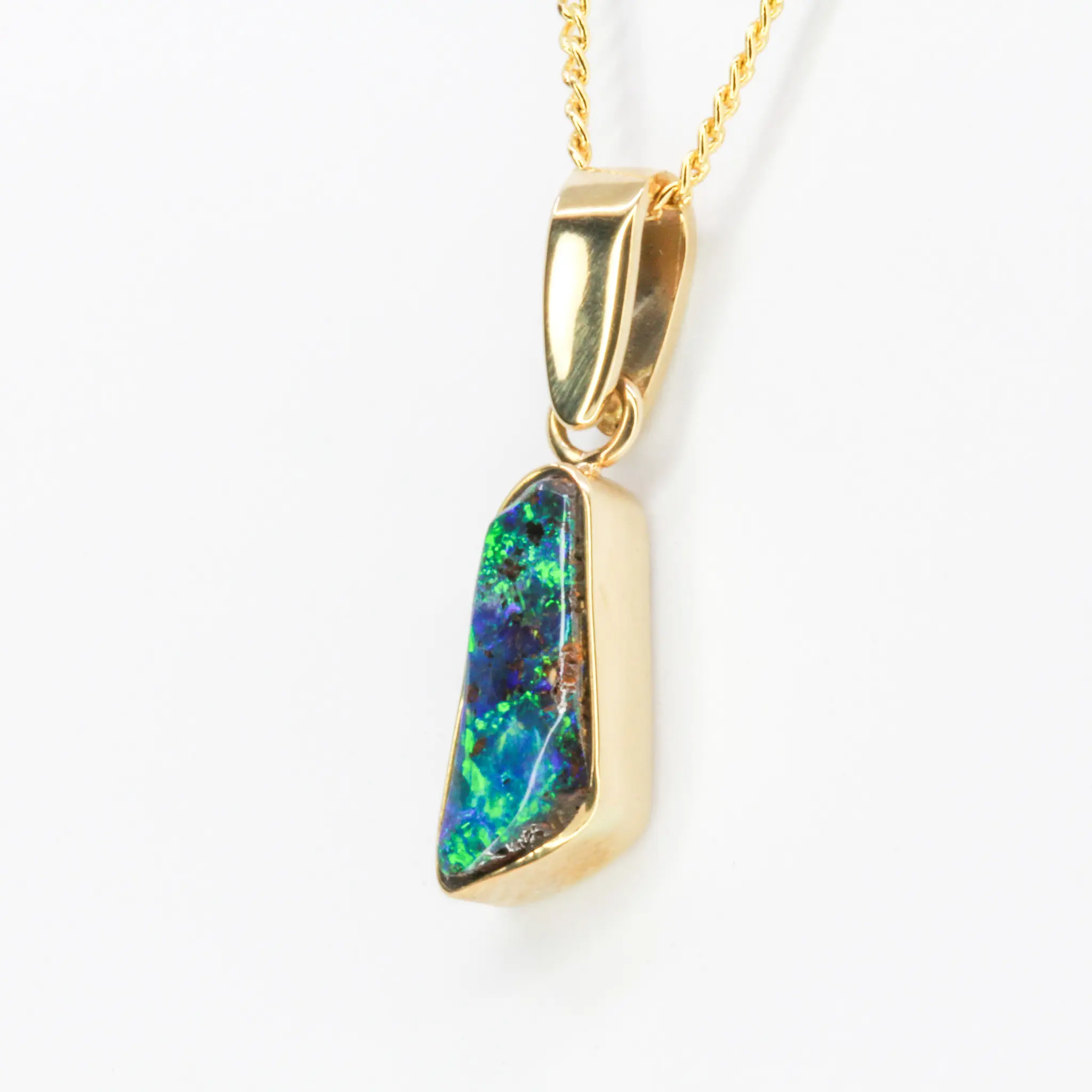 Freeform natural boulder opal from Queensland set into a handmade bezel setting in 18ct yellow gold. Featuring green, and blue colours.