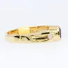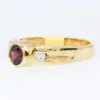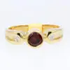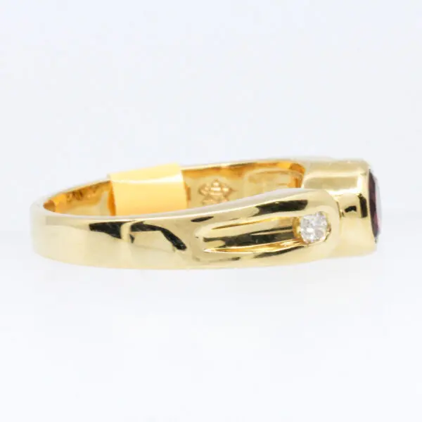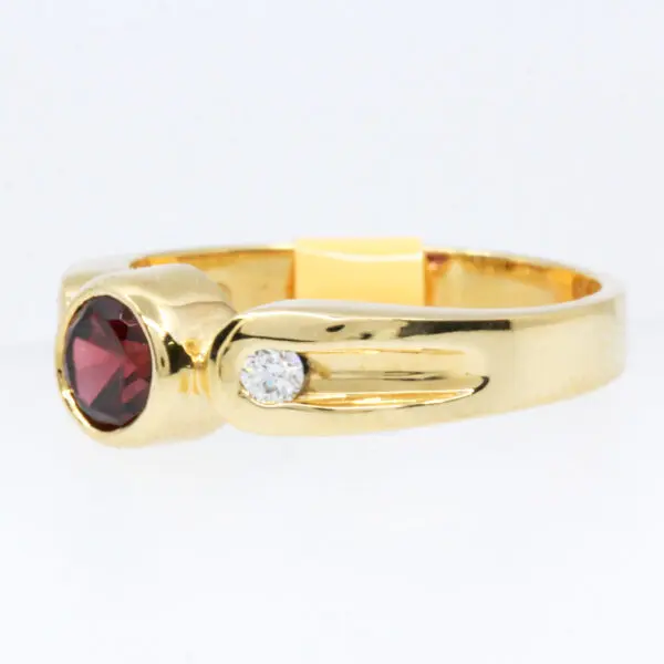 Wide band bezel with gypsy set accents design ring. Round-cut garnet of natural origin with natural diamonds. Solid 18ct yellow gold.