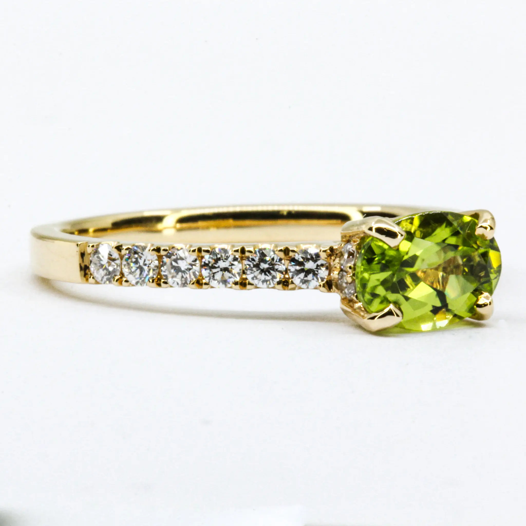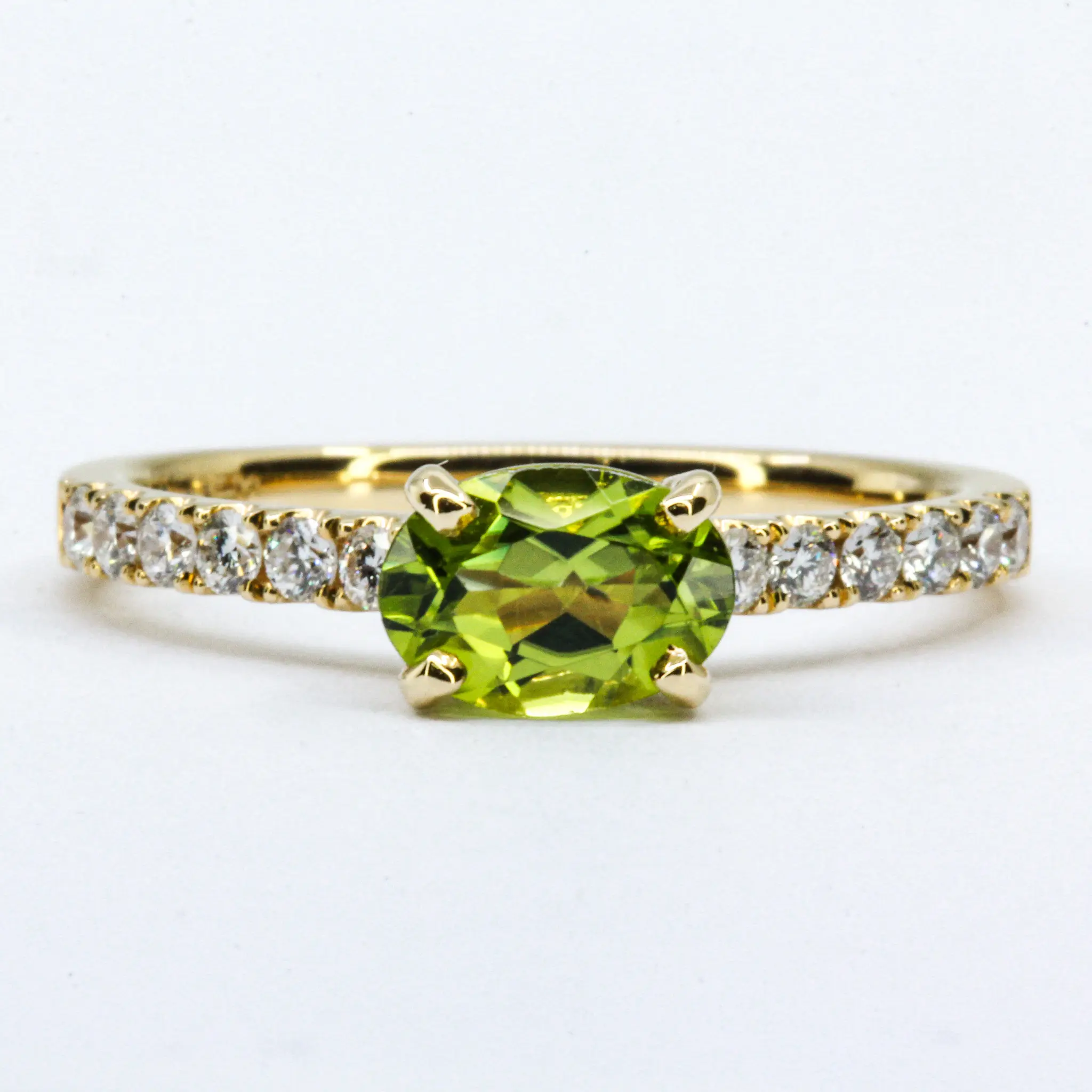 Simple thin band east to west set design ring. Oval-cut peridot of natural origin with natural diamonds. Solid 18ct yellow gold.