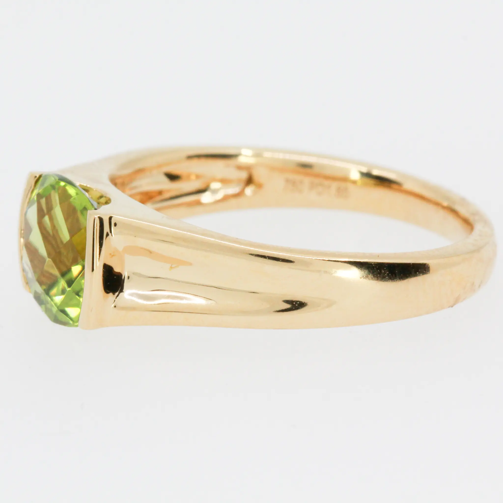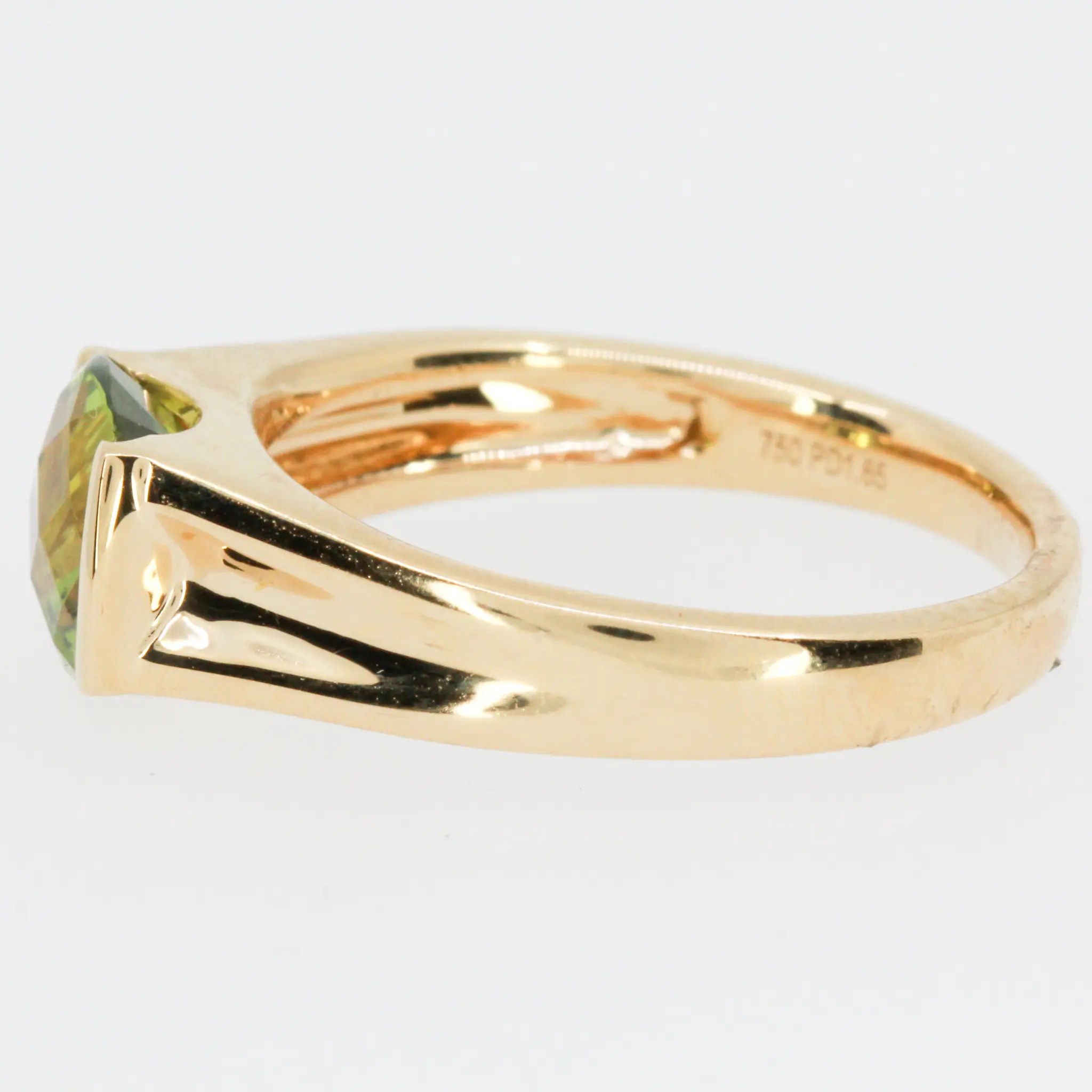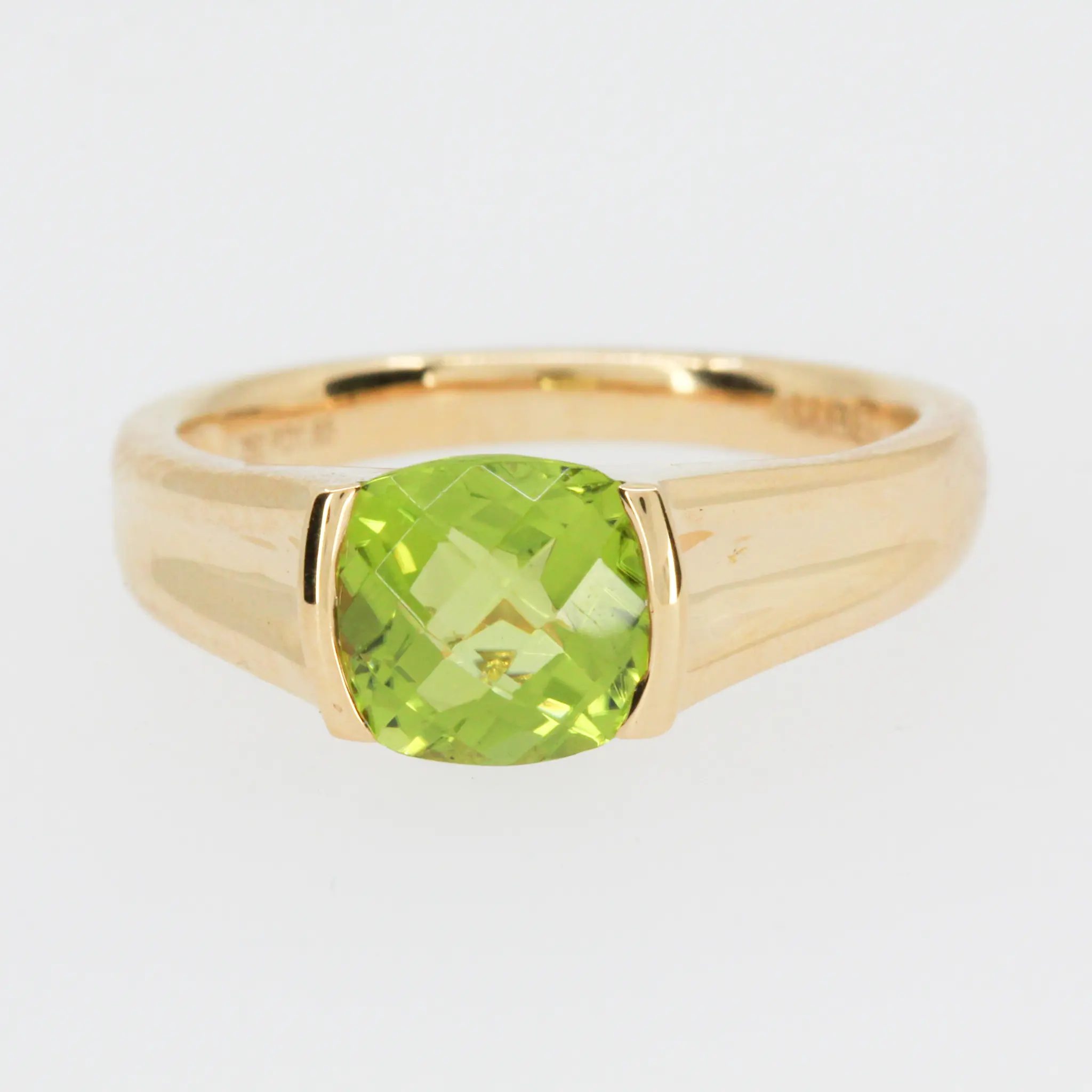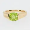 Signet half bezel design ring. Square-cushion-cut peridot of natural origin. Solid 18ct yellow gold.