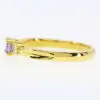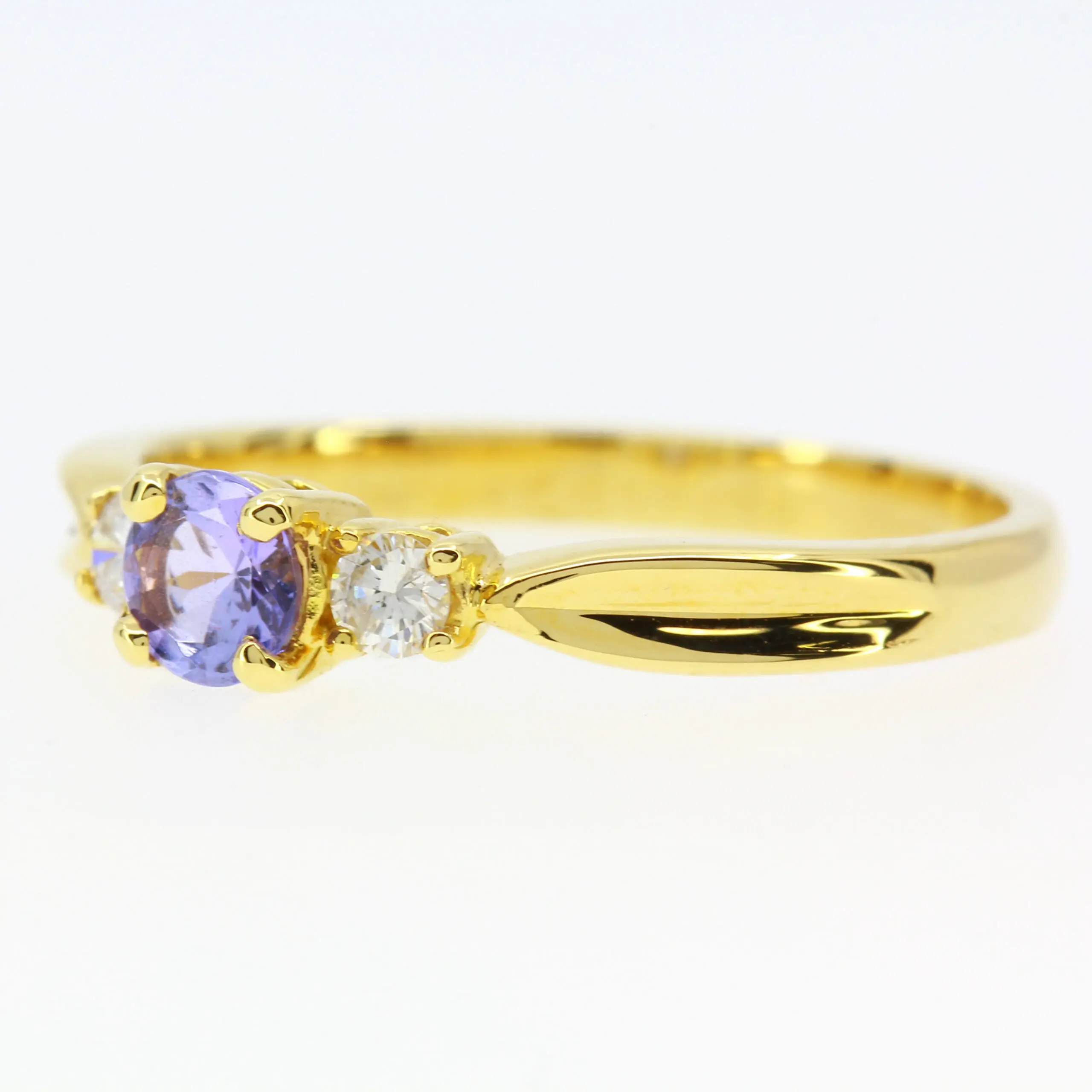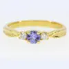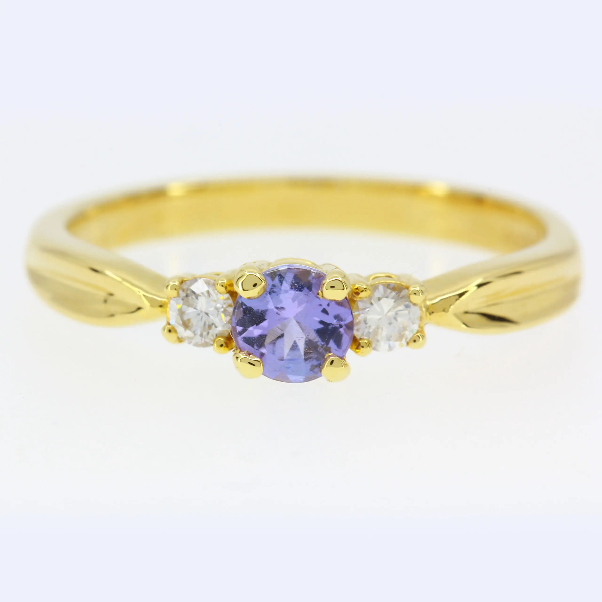 Trilogy design ring. Round-cut tanzanite of natural origin with natural diamonds. Solid 18ct yellow gold.