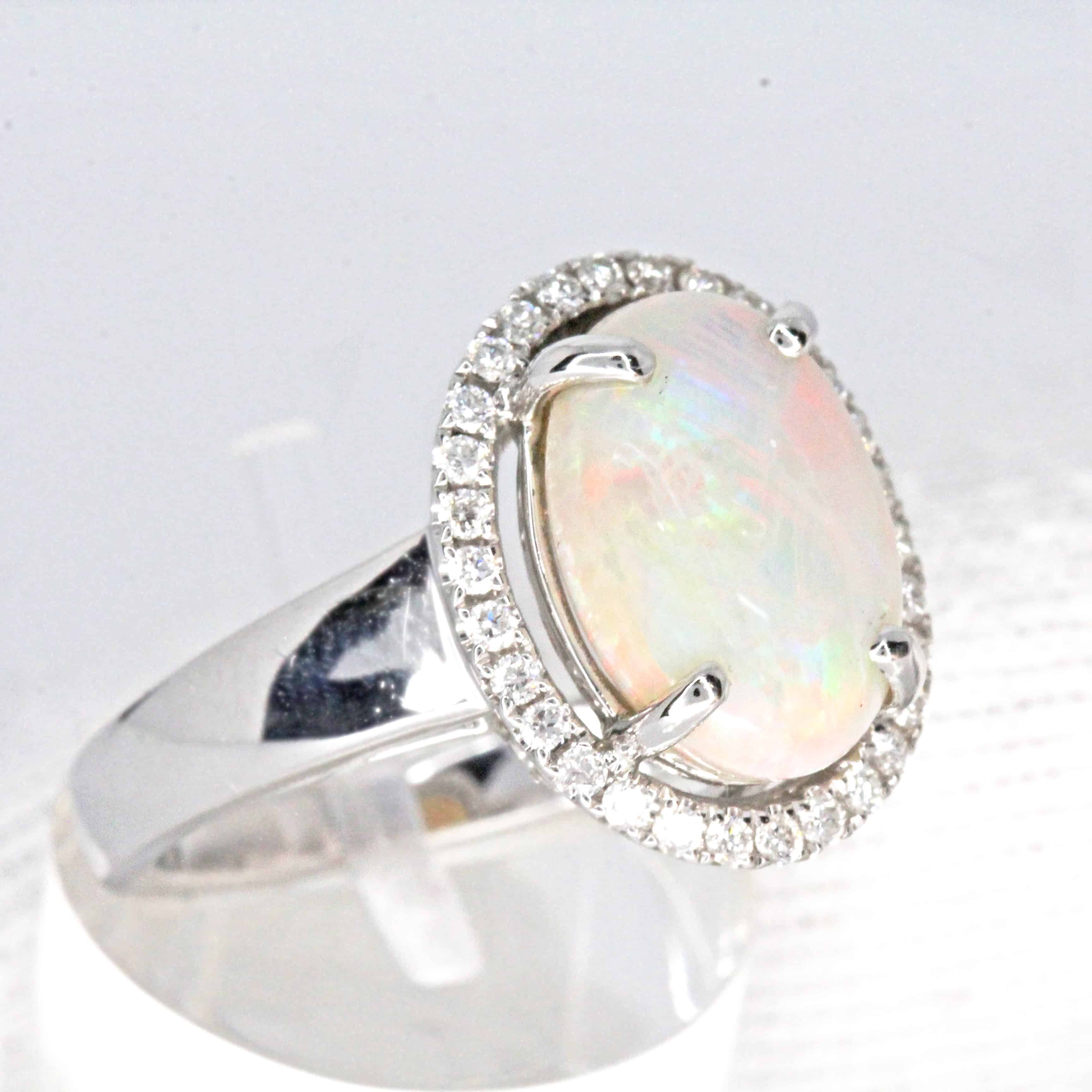 Halo on wide band ring design. Oval natural white Australian opal set with accenting natural diamonds. Solid 18ct white gold. Featuring red, orange, & green flashes of colour.