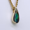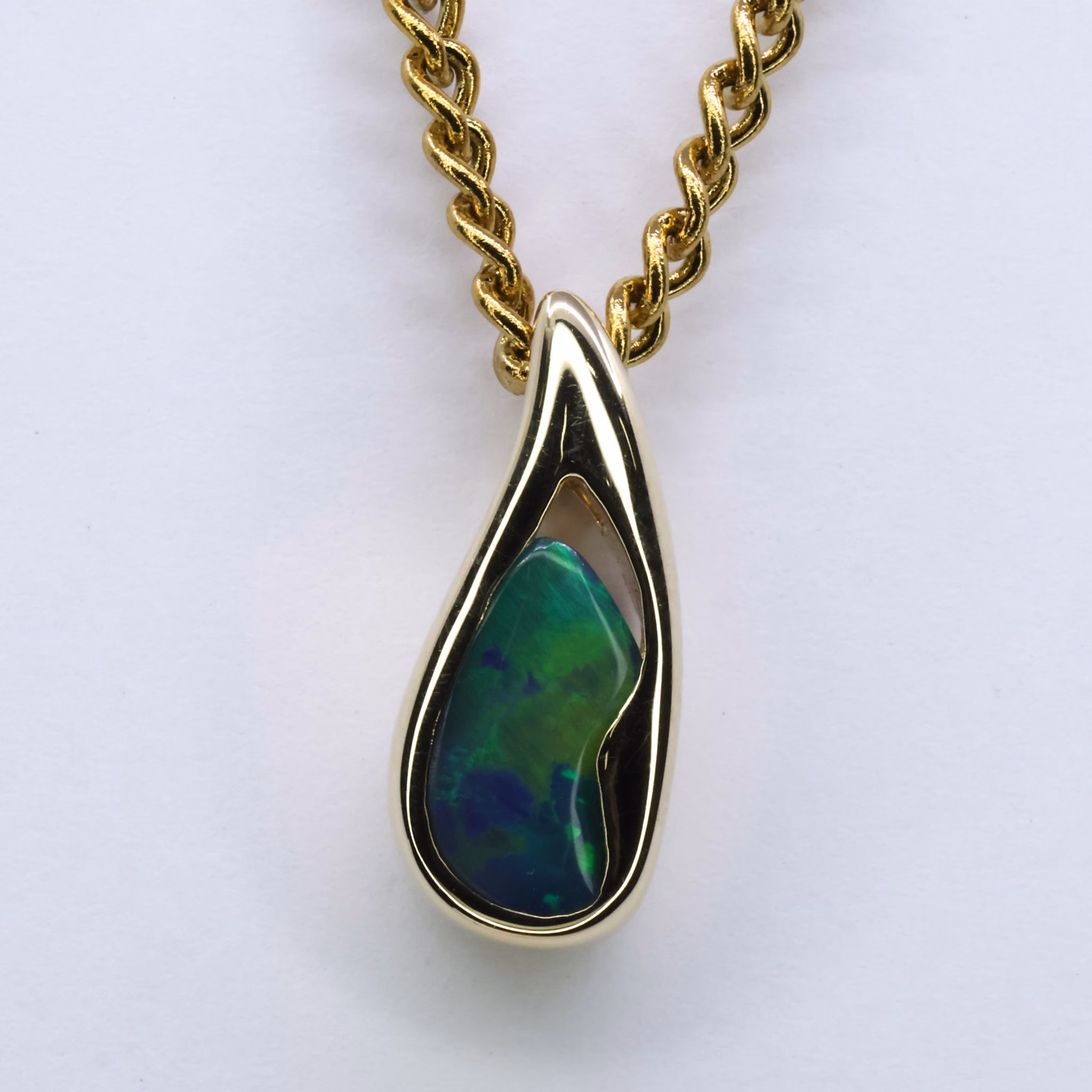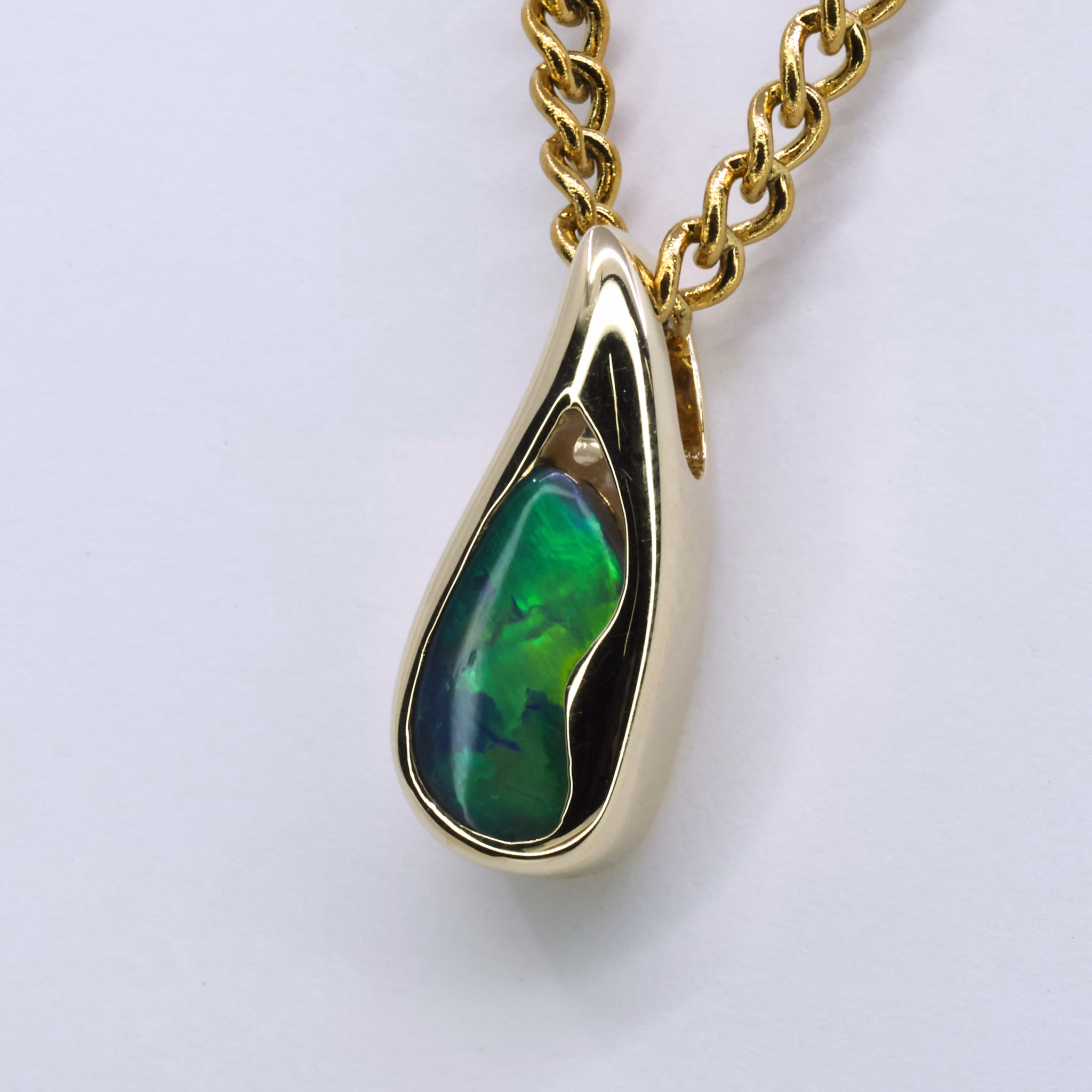 Free-form natural black Australian opal pendant. Solid 9ct yellow gold. Featuring bright green & orange flashes of colour, body tone N2 B5.