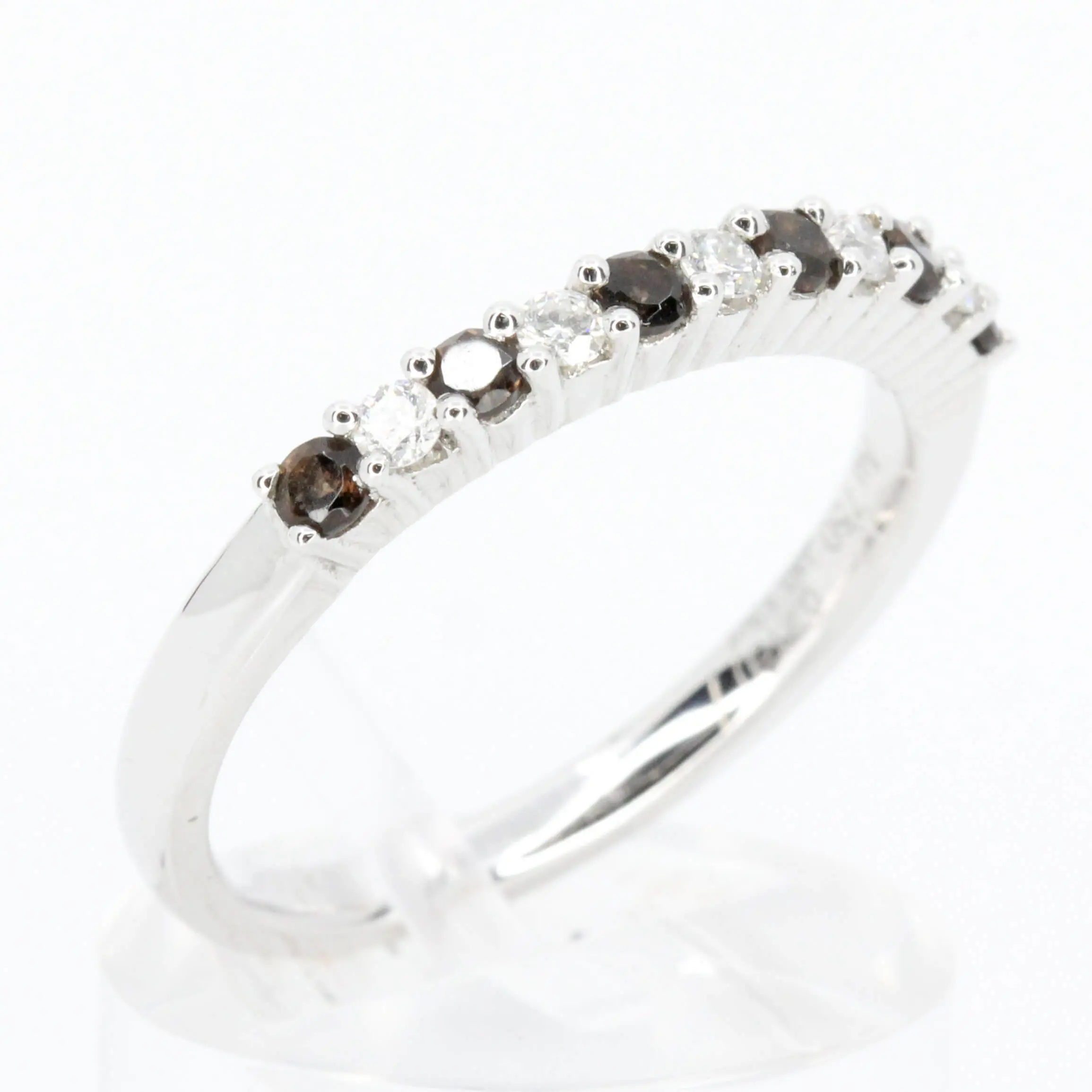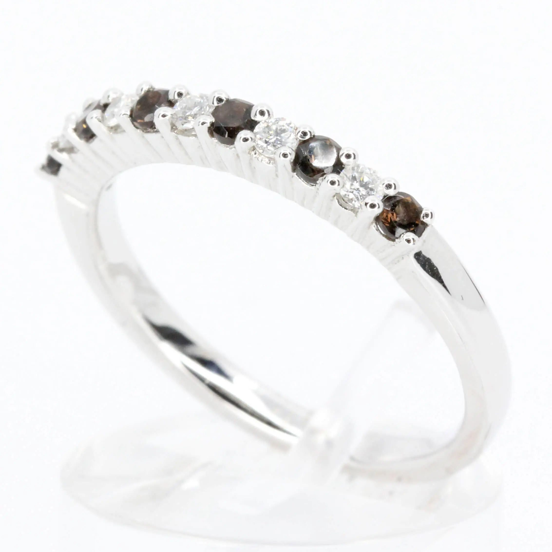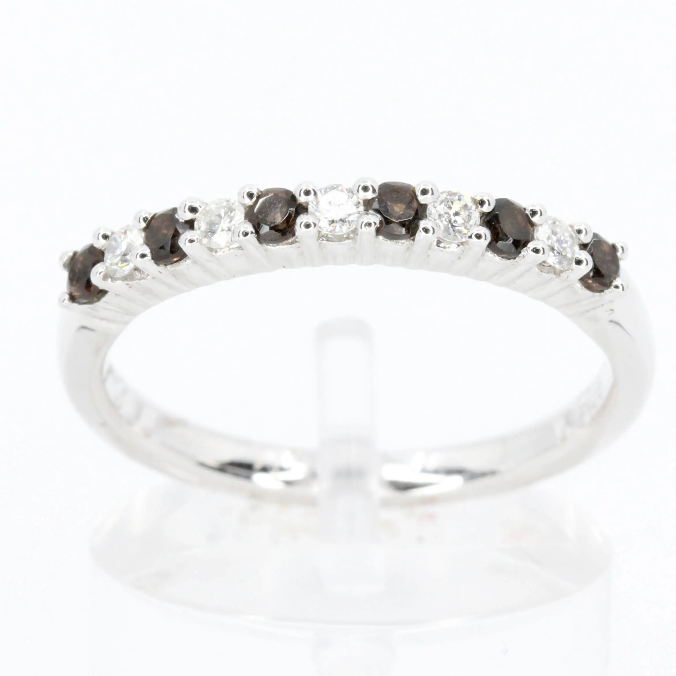 Two stone black & white band design ring. Round-cut smokey quartz of natural origin set with natural diamonds. Solid 18ct white gold.