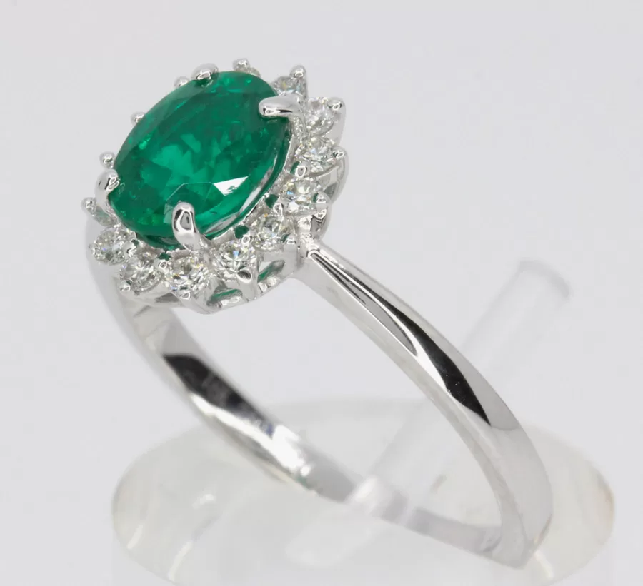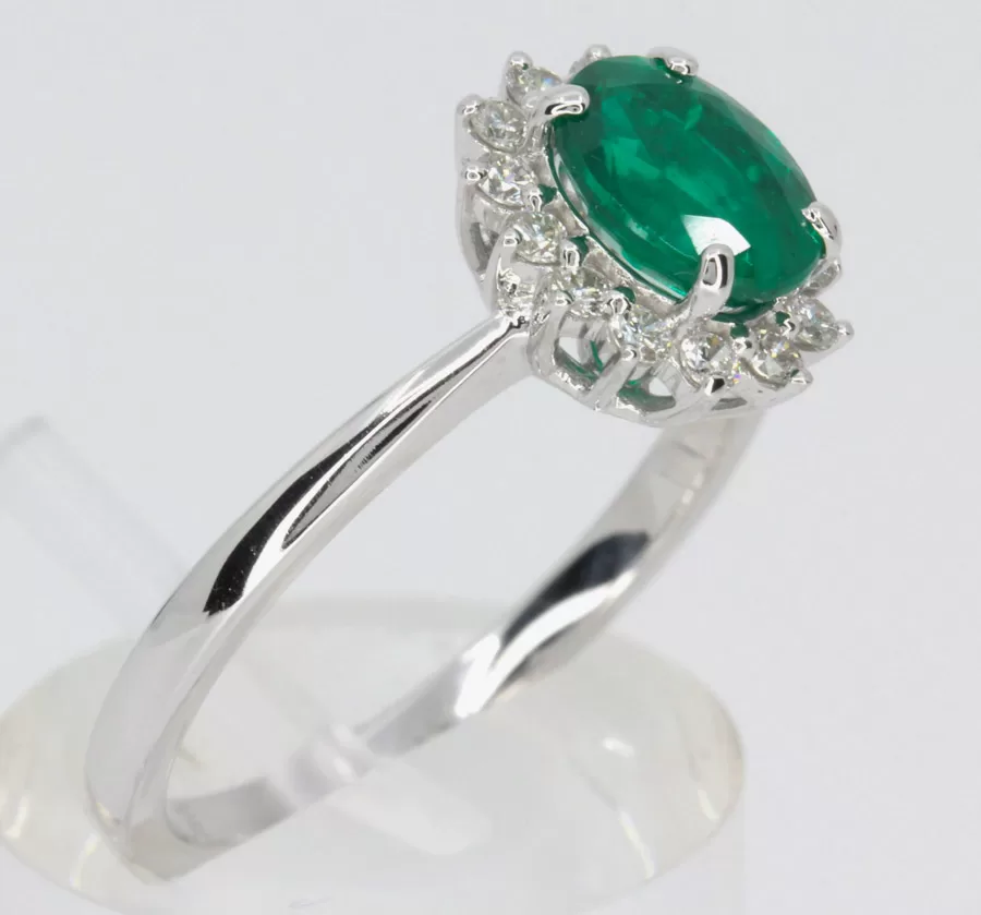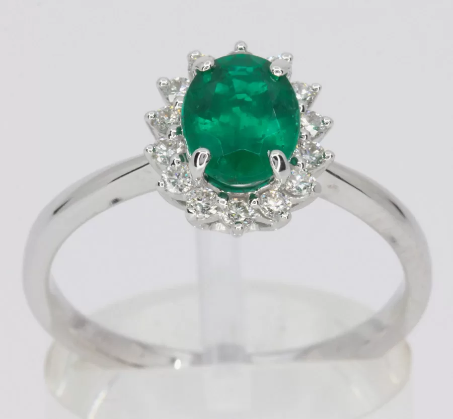 Sun-burst halo design ring. Emerald of natural origin. Oval-cut emerald. Accenting natural diamonds. Set into solid 18ct white gold.