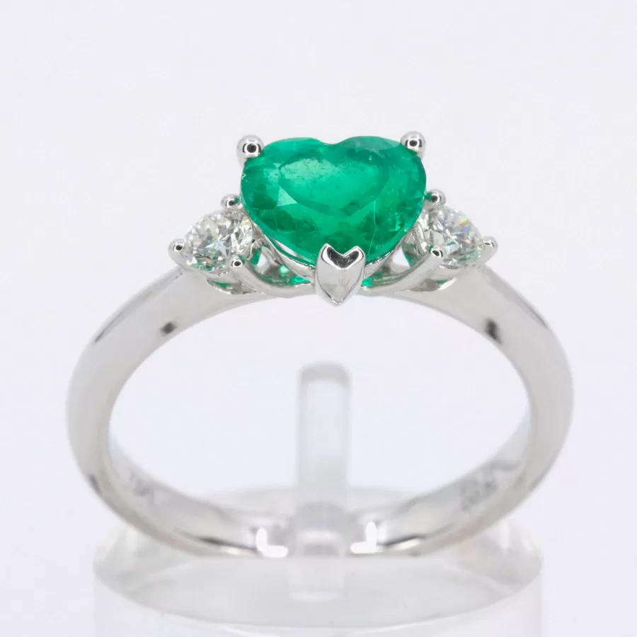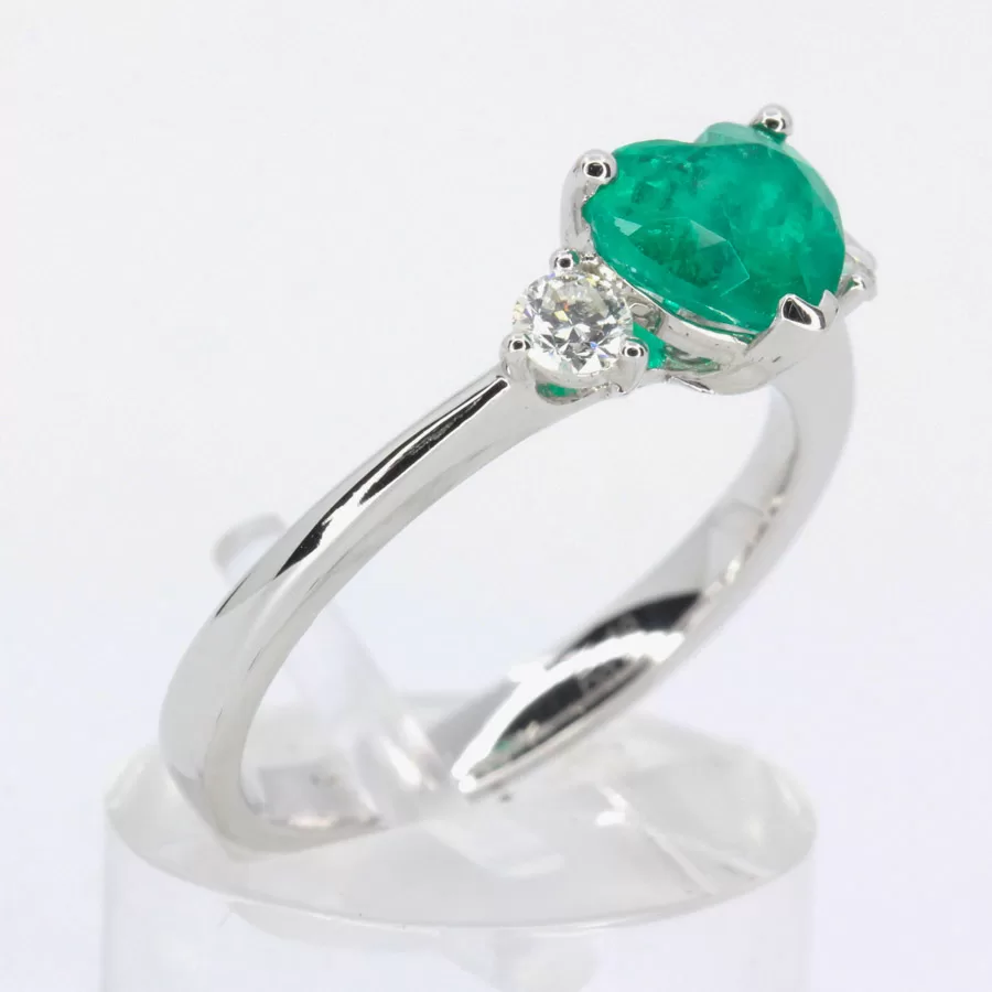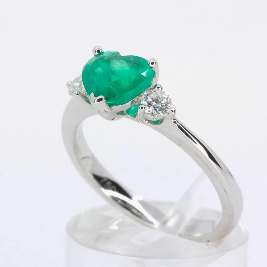 Heart trilogy design ring. Emerald of natural origin. Heart-shape emerald. Accenting natural diamonds. Set into solid 18ct white gold.