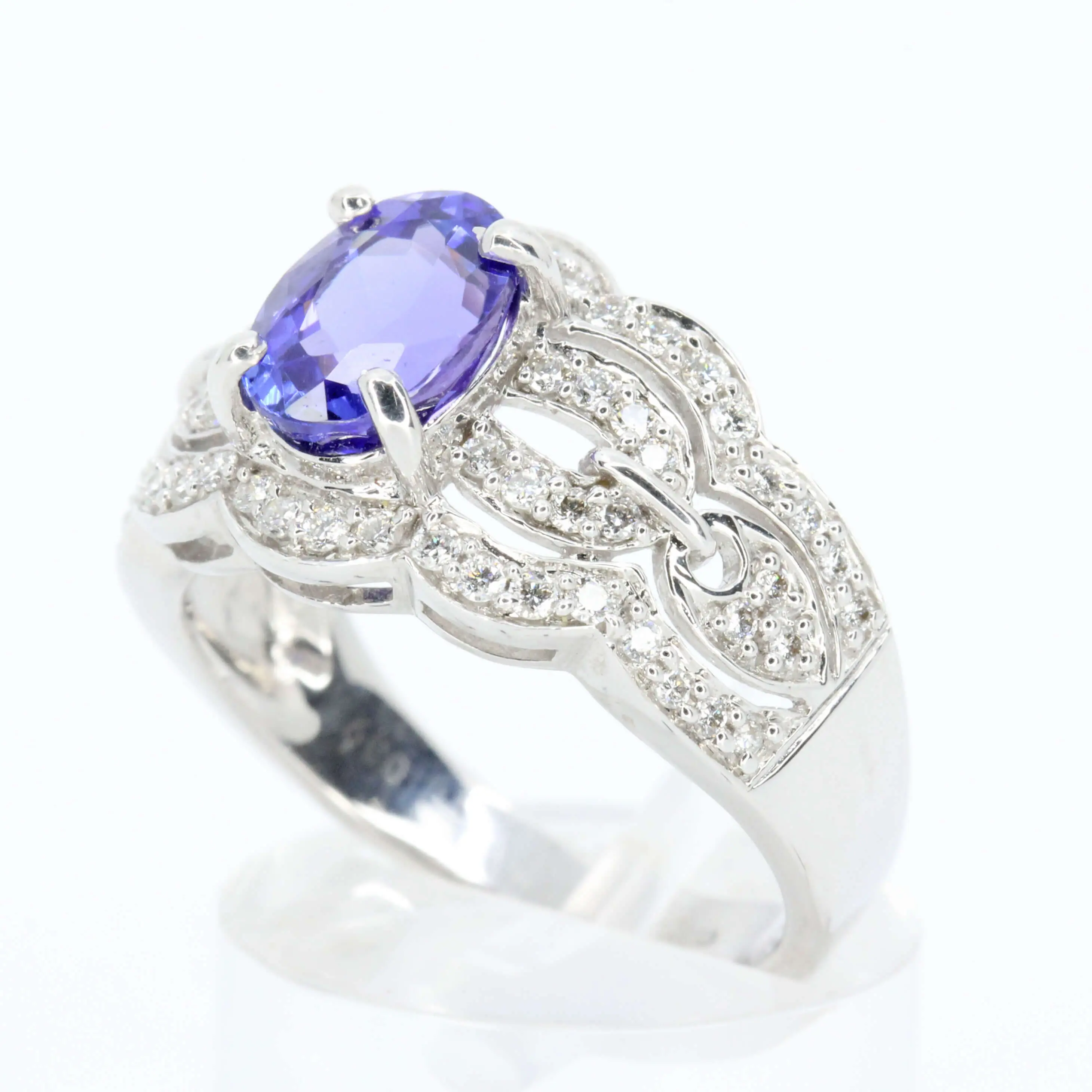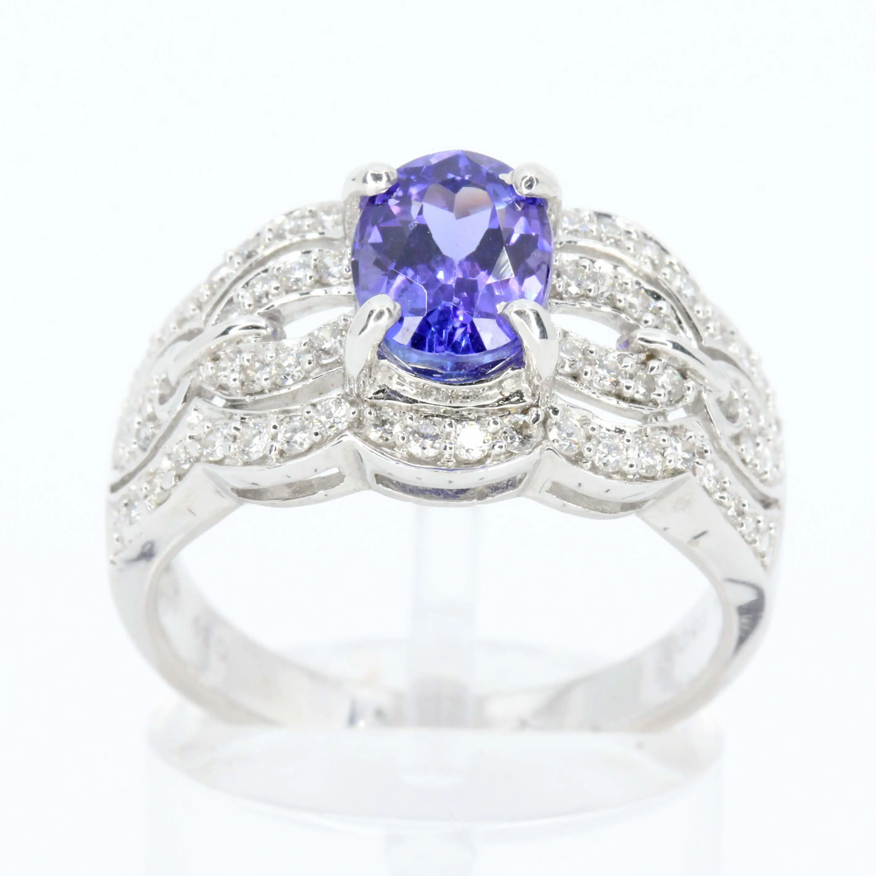Fancy open band with accents design ring. Oval-cut tanzanite of natural origin with natural diamonds. Solid 18ct white gold.