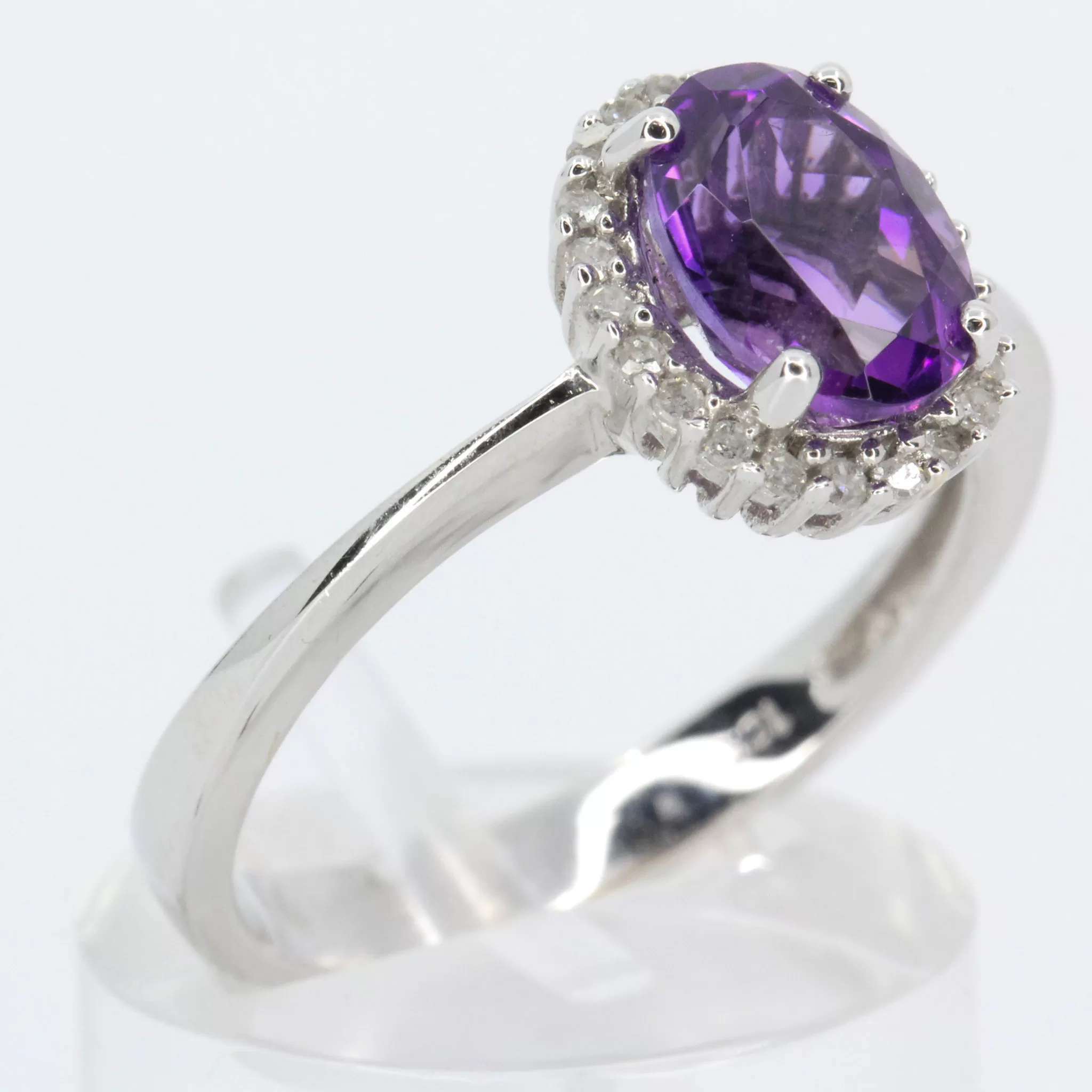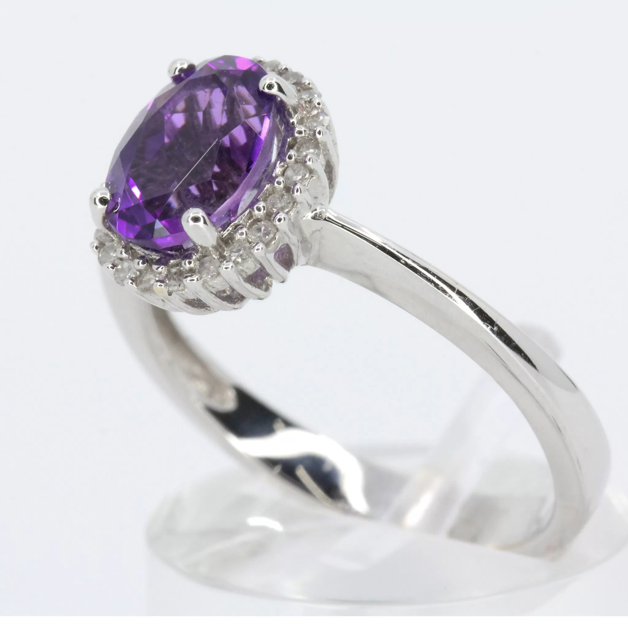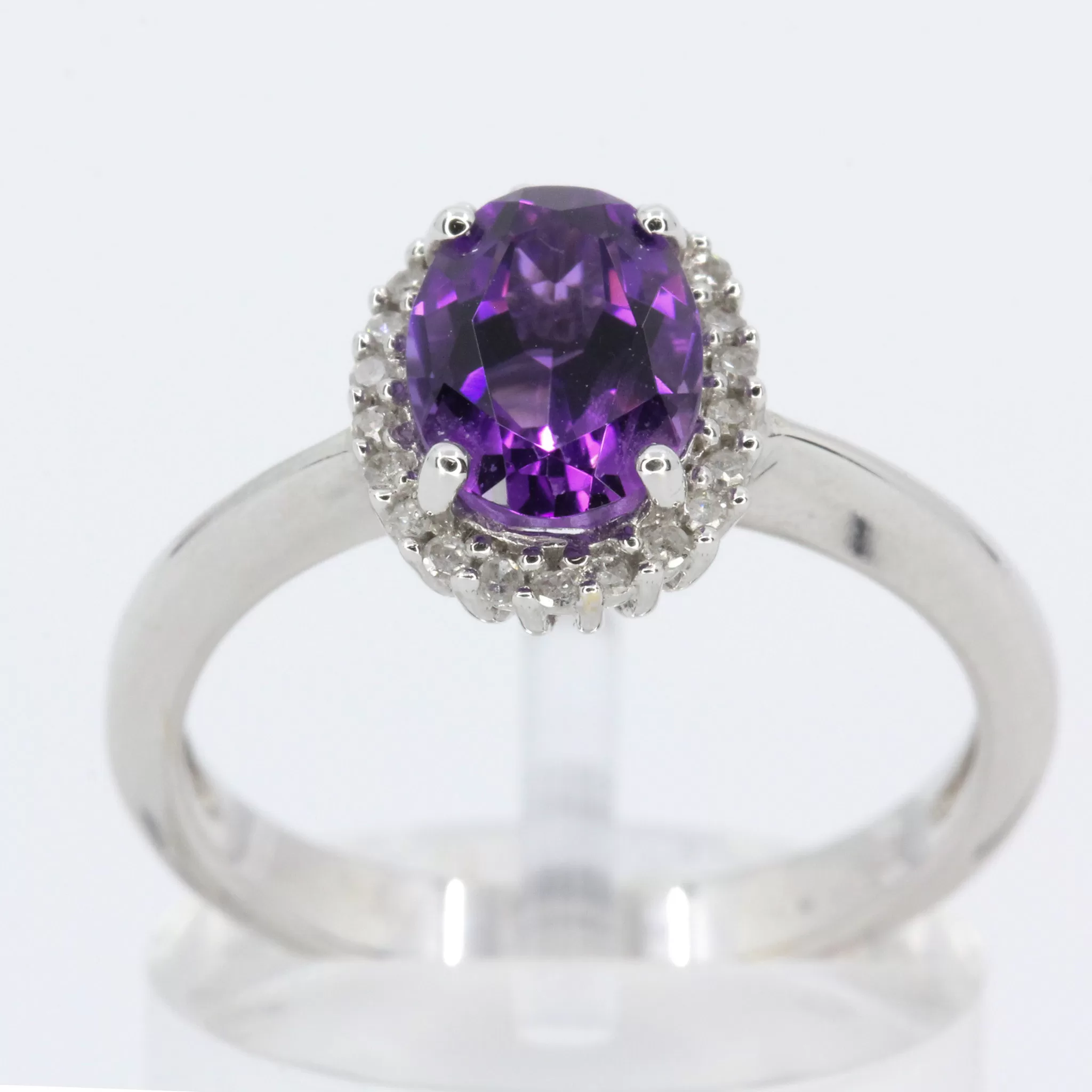 Simple oval halo design ring. Oval-cut amethyst of natural origin with natural diamonds. Solid 18ct white gold.