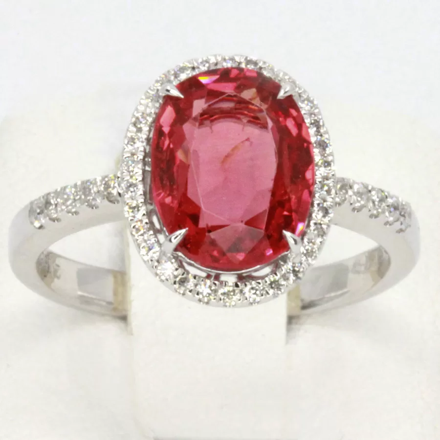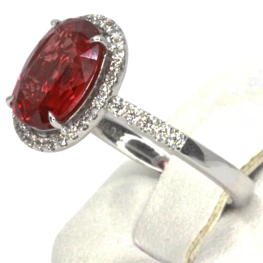 Large stone modern halo with accents design ring. Oval-cut red spinel of natural origin with natural diamonds. Solid 18ct white gold.