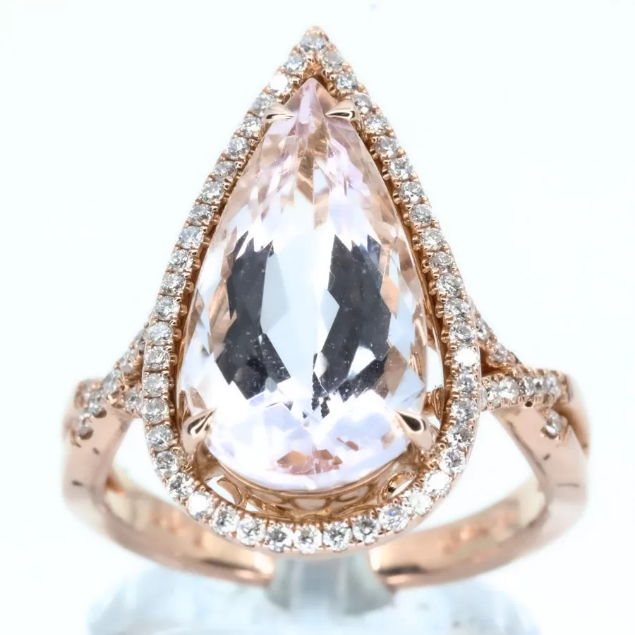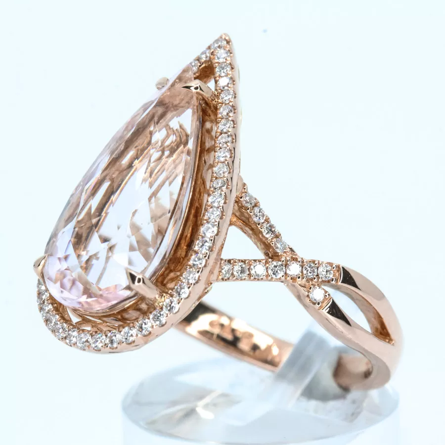 Large tear-drop halo and accents design ring. Pear-cut morganite of natural origin set with natural diamonds. Solid 18ct rose gold.