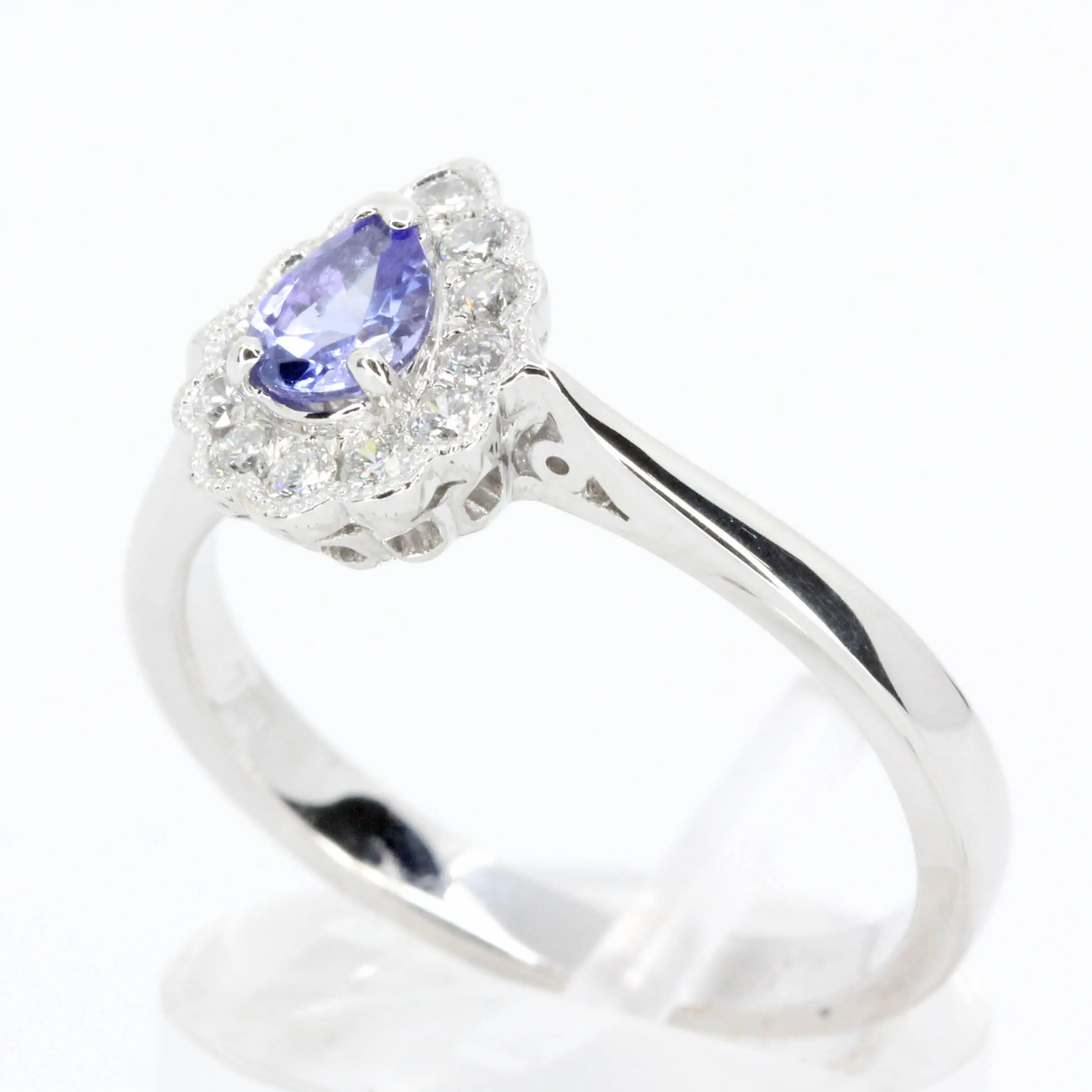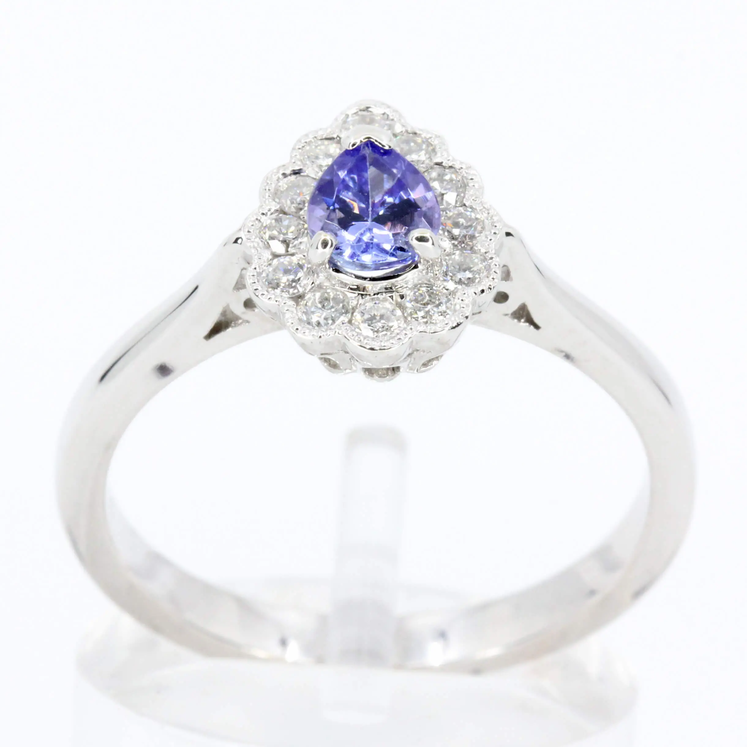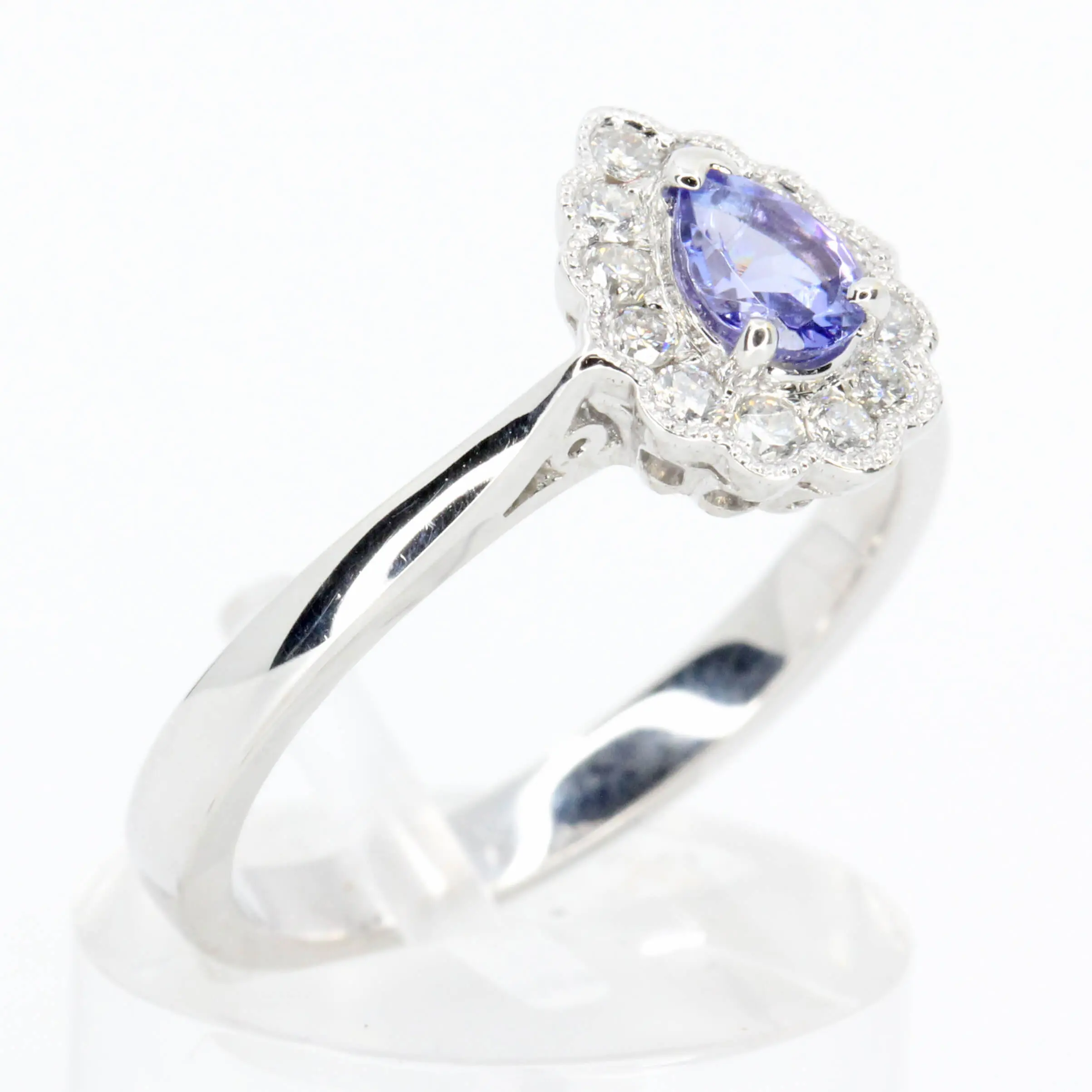 Scalloped halo design ring. Pear-cut tanzanite of natural origin with natural diamonds. Solid 18ct white gold.
